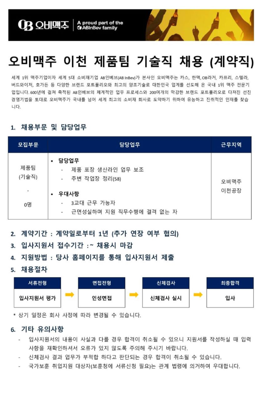 [ABInbev Korea ¿Àºñ¸ÆÁÖ] ÀÌõ°øÀå Á¦Ç°ÆÀ ±â¼úÁ÷ ä¿ë (°è¾àÁ÷)