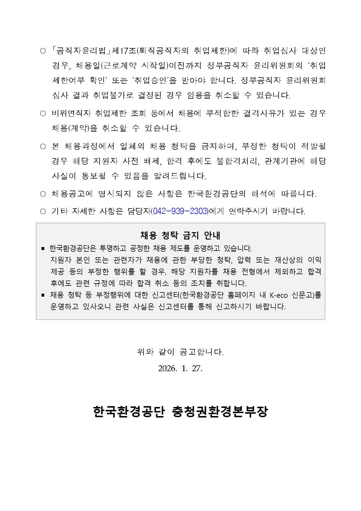 Çѱ¹È¯°æ°ø´Ü ÃæÃ»±Çȯ°æº»ºÎ 2026³â Æó±â¹° ÀûÁ¤Ã³¸®ÃßÁø¼¾ÅÍ ¿î¿µ»ç¾÷ ±â°£Á¦±Ù·ÎÀÚ(ÃËŹ'¶ó'±Þ) ä¿ë °ø°í