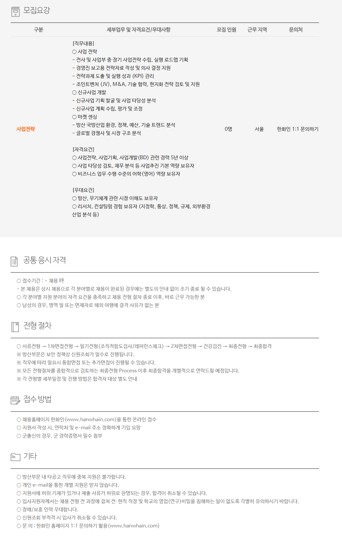 »ç¾÷Àü·« [Á÷¹«³»¿ë] ¡Û »ç¾÷ Àü·« - Àü»ç ¹× »ç¾÷ºÎ Áß∙Àå±â »ç¾÷Àü·« ¼ö¸³, ½ÇÇà ·Îµå¸Ê ±âȹ - °æ¿µÁø º¸°í¿ë Àü·«ÀÚ·á ÀÛ¼º ¹× ÀÇ»ç °áÁ¤ Áö¿ø - Àü·«°úÁ¦ µµÃâ ¹× ½ÇÇà ¼º°ú (KPI) °ü¸® - Á¶ÀÎÆ®º¥Ã³ (JV), M&A, ±â¼ú Çù·Â, ÇöÁöÈ­ Àü·« °ËÅä ¹× Áö¿ø ¡Û ½Å±Ô»ç¾÷ °³¹ß - ½Å±Ô»ç¾÷ ±âȹ ¹ß±¼ ¹× »ç¾÷ Ÿ´ç¼º ºÐ¼® - ½Å±Ô»ç¾÷ °èȹ ¼ö¸³, Æò°¡ ¹× Á¶Á¤ ¡Û ¸¶ÄÏ ¼¾½Ì - ¹æ»ê∙±¹¹æ»ê¾÷ ȯ°æ, Á¤Ã¥, ¿¹»ê, ±â¼ú Æ®·»µå ºÐ¼® - ±Û·Î¹ú °æÀï»ç ¹× ½ÃÀå ±¸Á¶ ºÐ¼® [ÀÚ°Ý¿ä°Ç] ¡Û »ç¾÷Àü·«, »ç¾÷±âȹ, »ç¾÷°³¹ß(BD) °ü·Ã °æ·Â 5³â ÀÌ»ó ¡Û »ç¾÷ Ÿ´ç¼º °ËÅä, À繫 ºÐ¼® µî »ç¾÷ÃßÁø ±âº» ¿ª·® º¸À¯ÀÚ ¡Û ºñÁî´Ï½º ¾÷¹« ¼öÇà ¼öÁØÀÇ ¾îÇÐ(¿µ¾î) ¿ª·® º¸À¯ÀÚ [¿ì´ë¿ä°Ç] ¡Û ¹æ»ê, ¹«±âü°è °ü·Ã ½ÃÀå ÀÌÇØµµ º¸À¯ÀÚ ¡Û ¸®¼­Ä¡, ÄÁ¼³ÆÃÆß °æÇè º¸À¯ÀÚ (ÁöÁ¤ÇÐ, Åë»ó, Á¤Ã¥, ±ÔÁ¦, ¿ÜºÎȯ°æ »ê¾÷ ºÐ¼® µî)