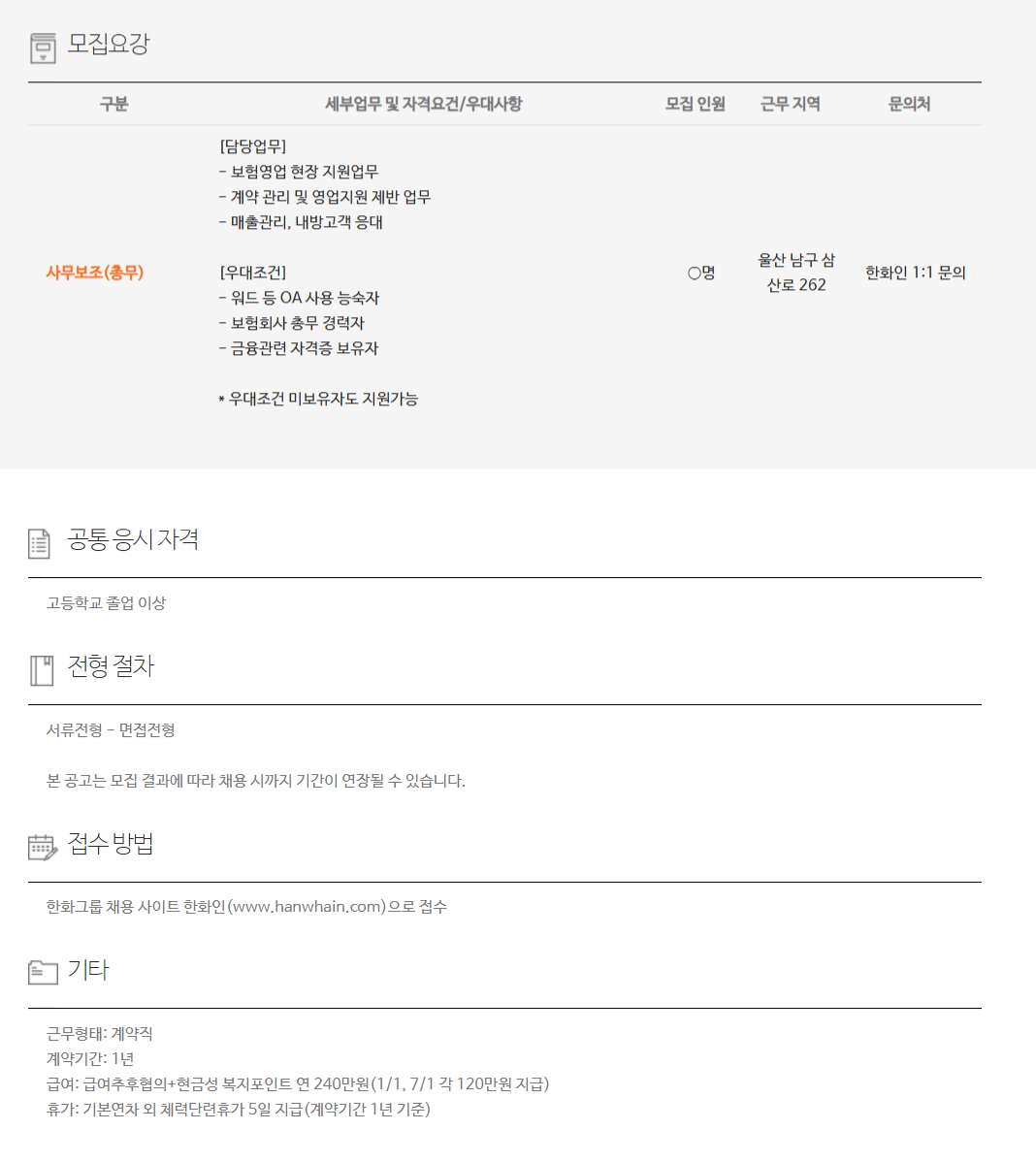 ÇÑȼÕÇØº¸Çè(ÁÖ) °è¾àÁ÷ ä¿ë(½ÅÀÔ/°æ·Â) - Àü¼Ó¿µ¾÷ºÎ¹® ä¿ë(¿ï»ê)