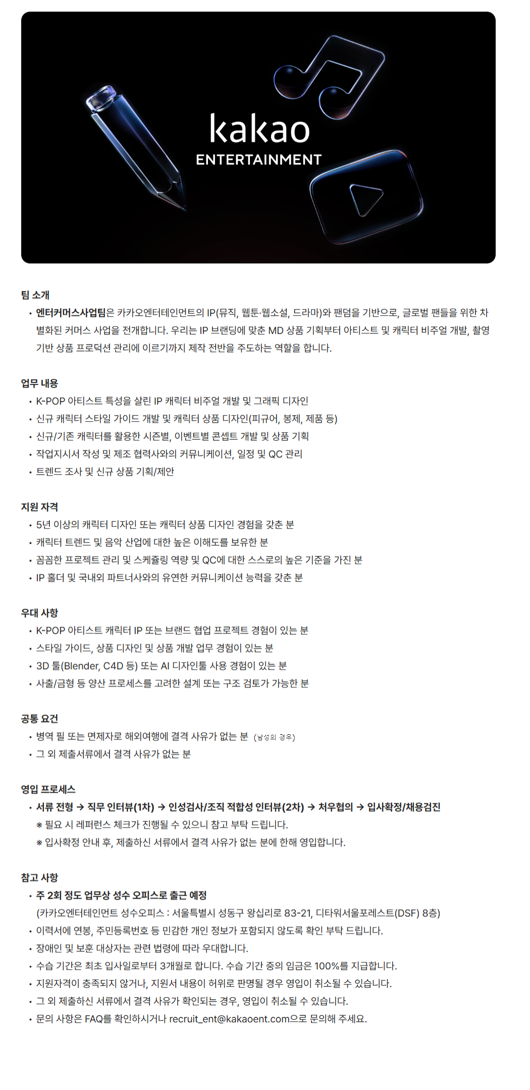 ¿£ÅÍÄ¿¸Ó½º»ç¾÷ÆÀÀº īī¿À¿£ÅÍÅ×ÀÎ¸ÕÆ®ÀÇ IP(¹ÂÁ÷, À¥Å÷¡¤À¥¼Ò¼³, µå¶ó¸¶)¿Í ÆÒ´ýÀ» ±â¹ÝÀ¸·Î, ±Û·Î¹ú ÆÒµéÀ» À§ÇÑ Â÷º°ÈµÈ Ä¿¸Ó½º »ç¾÷À» Àü°³ÇÕ´Ï´Ù. ¿ì¸®´Â IP ºê·£µù¿¡ ¸ÂÃá MD »óǰ ±âȹºÎÅÍ ¾ÆÆ¼½ºÆ® ¹× ij¸¯ÅÍ ºñÁÖ¾ó °³¹ß, ÃÔ¿µ ±â¹Ý »óǰ ÇÁ·Î´ö¼Ç °ü¸®¿¡ À̸£±â±îÁö Á¦ÀÛ Àü¹ÝÀ» ÁÖµµÇÏ´Â ¿ªÇÒÀ» ÇÕ´Ï´Ù.