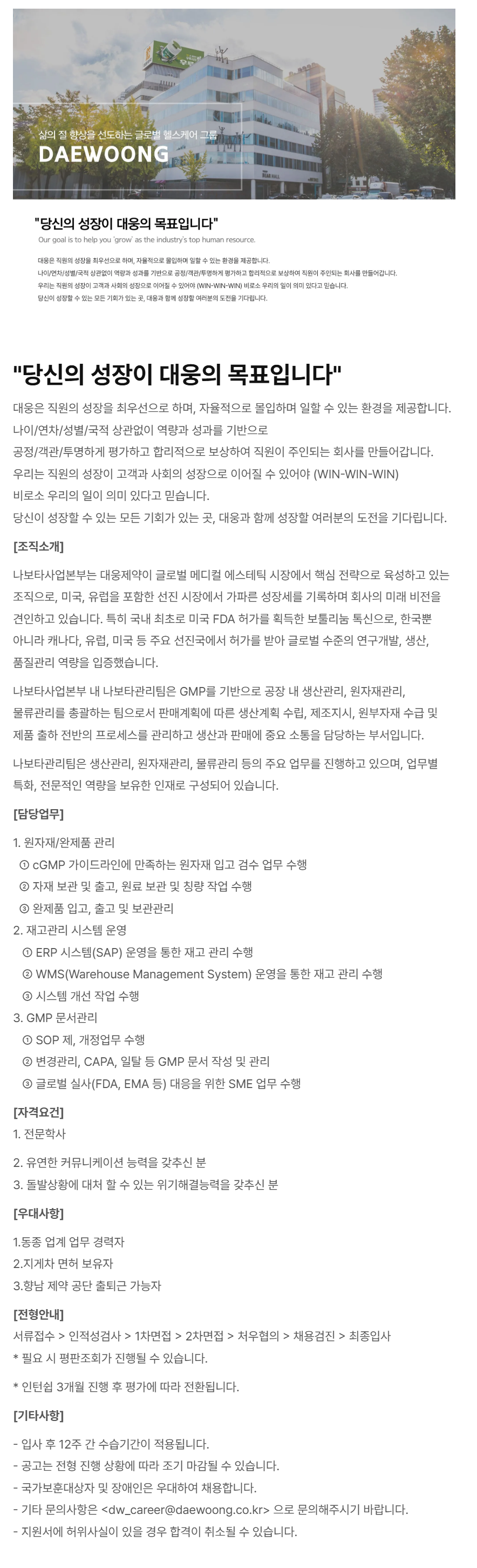 - ±âŸ ¹®ÀÇ»çÇ×Àº <dw_career@daewoong.co.kr******@*******.***> À¸·Î ¹®ÀÇÇØÁֽñ⠹ٶø´Ï´Ù.