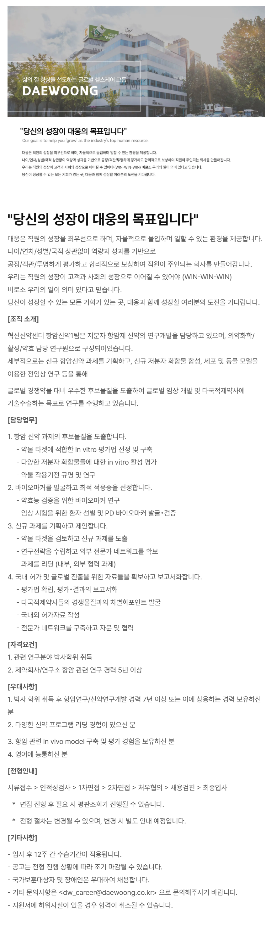 - ±âŸ ¹®ÀÇ»çÇ×Àº <dw_career@daewoong.co.kr******@*******.***> À¸·Î ¹®ÀÇÇØÁֽñ⠹ٶø´Ï´Ù.