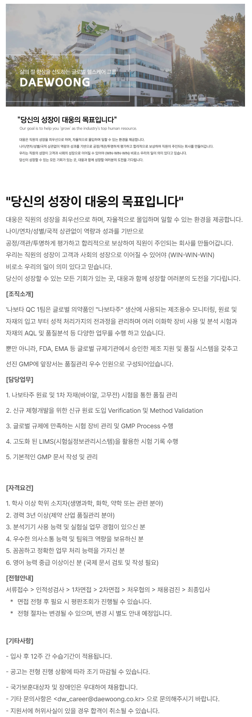 - ±âŸ ¹®ÀÇ»çÇ×Àº <dw_career@daewoong.co.kr******@*******.***> À¸·Î ¹®ÀÇÇØÁֽñ⠹ٶø´Ï´Ù.