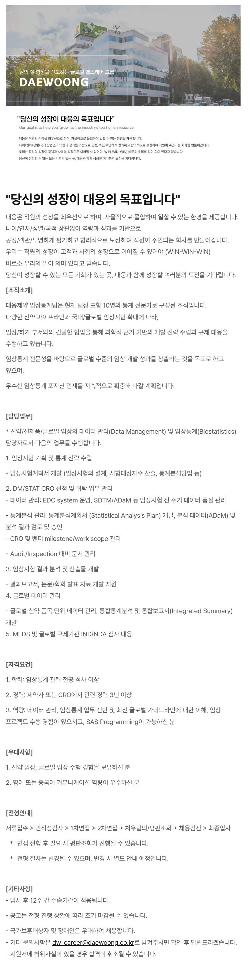 - ±âŸ ¹®ÀÇ»çÇ×Àº dw_career@daewoong.co.kr******@*******.***·Î ³²°ÜÁֽøé È®ÀÎ ÈÄ ´äº¯µå¸®°Ú½À´Ï´Ù.