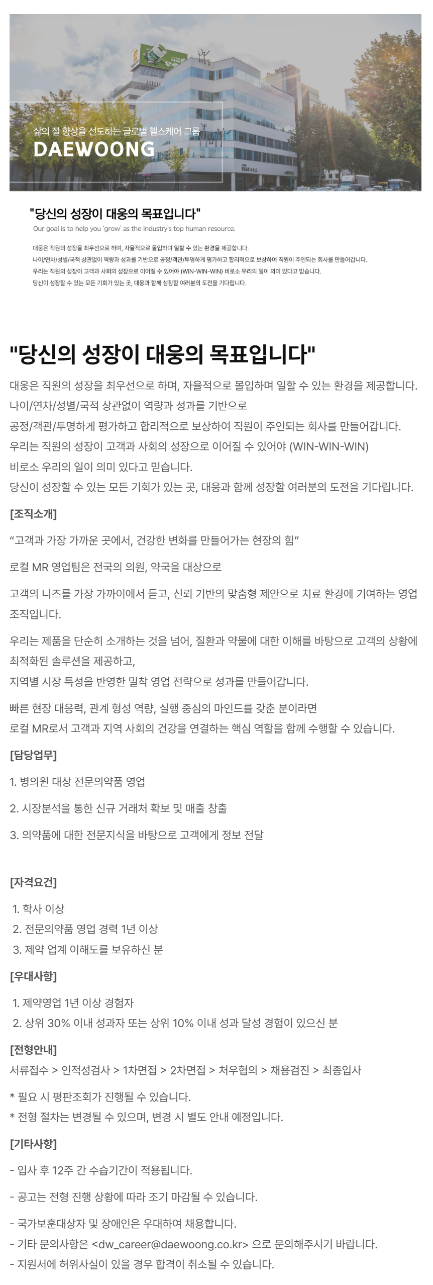 - ±âŸ ¹®ÀÇ»çÇ×Àº <dw_career@daewoong.co.kr******@*******.***> À¸·Î ¹®ÀÇÇØÁֽñ⠹ٶø´Ï´Ù.