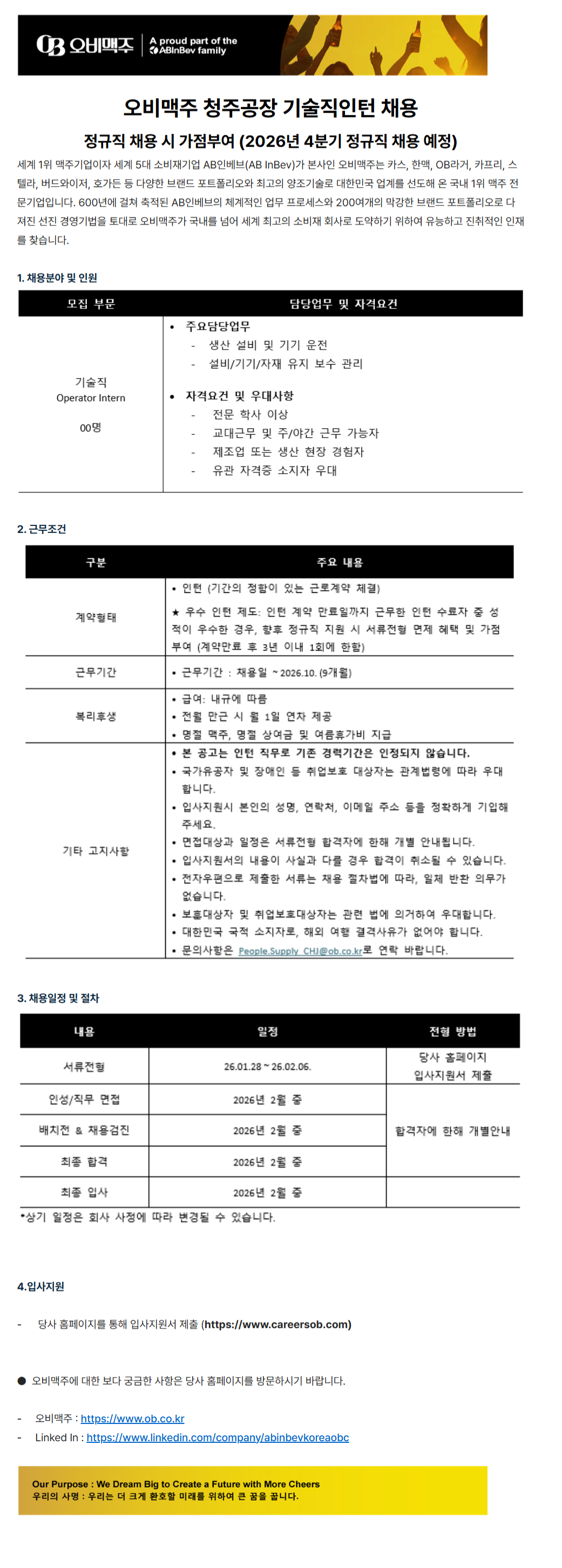 [ABInbev Korea ¿Àºñ¸ÆÁÖ] ûÁÖ°øÀå ±â¼úÁ÷ ÀÎÅÏ Ã¤¿ë
