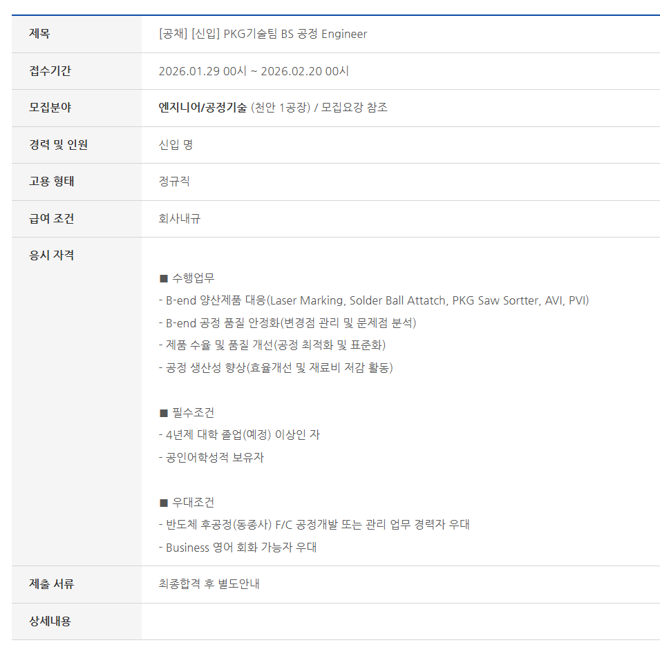 Á¦¸ñ [°øÃ¤] [½ÅÀÔ] PKG±â¼úÆÀ BS °øÁ¤ Engineer Á¢¼ö±â°£ 2026.01.29 00½Ã ~ 2026.02.20 00½Ã ¸ðÁýºÐ¾ß ¿£Áö´Ï¾î/°øÁ¤±â¼ú (õ¾È 1°øÀå) / ¸ðÁý¿ä°­ ÂüÁ¶ °æ·Â ¹× Àοø ½ÅÀÔ ¸í °í¿ë ÇüÅ Á¤±ÔÁ÷ ±Þ¿© Á¶°Ç ȸ»ç³»±Ô ÀÀ½Ã ÀÚ°Ý ¡á ¼öÇà¾÷¹« - B-end ¾ç»êÁ¦Ç° ´ëÀÀ(Laser Marking, Solder Ball Attatch, PKG Saw Sortter, AVI, PVI) - B-end °øÁ¤ ǰÁú ¾ÈÁ¤È­(º¯°æÁ¡ °ü¸® ¹× ¹®Á¦Á¡ ºÐ¼®) - Á¦Ç° ¼öÀ² ¹× ǰÁú °³¼±(°øÁ¤ ÃÖÀûÈ­ ¹× Ç¥ÁØÈ­) - °øÁ¤ »ý»ê¼º Çâ»ó(È¿À²°³¼± ¹× Àç·áºñ Àú°¨ Ȱµ¿) ¡á ÇʼöÁ¶°Ç - 4³âÁ¦ ´ëÇÐ Á¹¾÷(¿¹Á¤) ÀÌ»óÀÎ ÀÚ - °øÀξîÇмºÀû º¸À¯ÀÚ ¡á ¿ì´ëÁ¶°Ç - ¹ÝµµÃ¼ ÈİøÁ¤(µ¿Á¾»ç) F/C °øÁ¤°³¹ß ¶Ç´Â °ü¸® ¾÷¹« °æ·ÂÀÚ ¿ì´ë - Business ¿µ¾î ȸȭ °¡´ÉÀÚ ¿ì´ë Á¦Ãâ ¼­·ù ÃÖÁ¾ÇÕ°Ý ÈÄ º°µµ¾È³»
