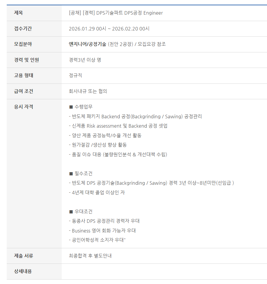 - ¹ÝµµÃ¼ DPS °øÁ¤±â¼ú(Backgrinding / Sawing) °æ·Â 3³â ÀÌ»ó~8³â¹Ì¸¸(¼±ÀÓ±Þ )
