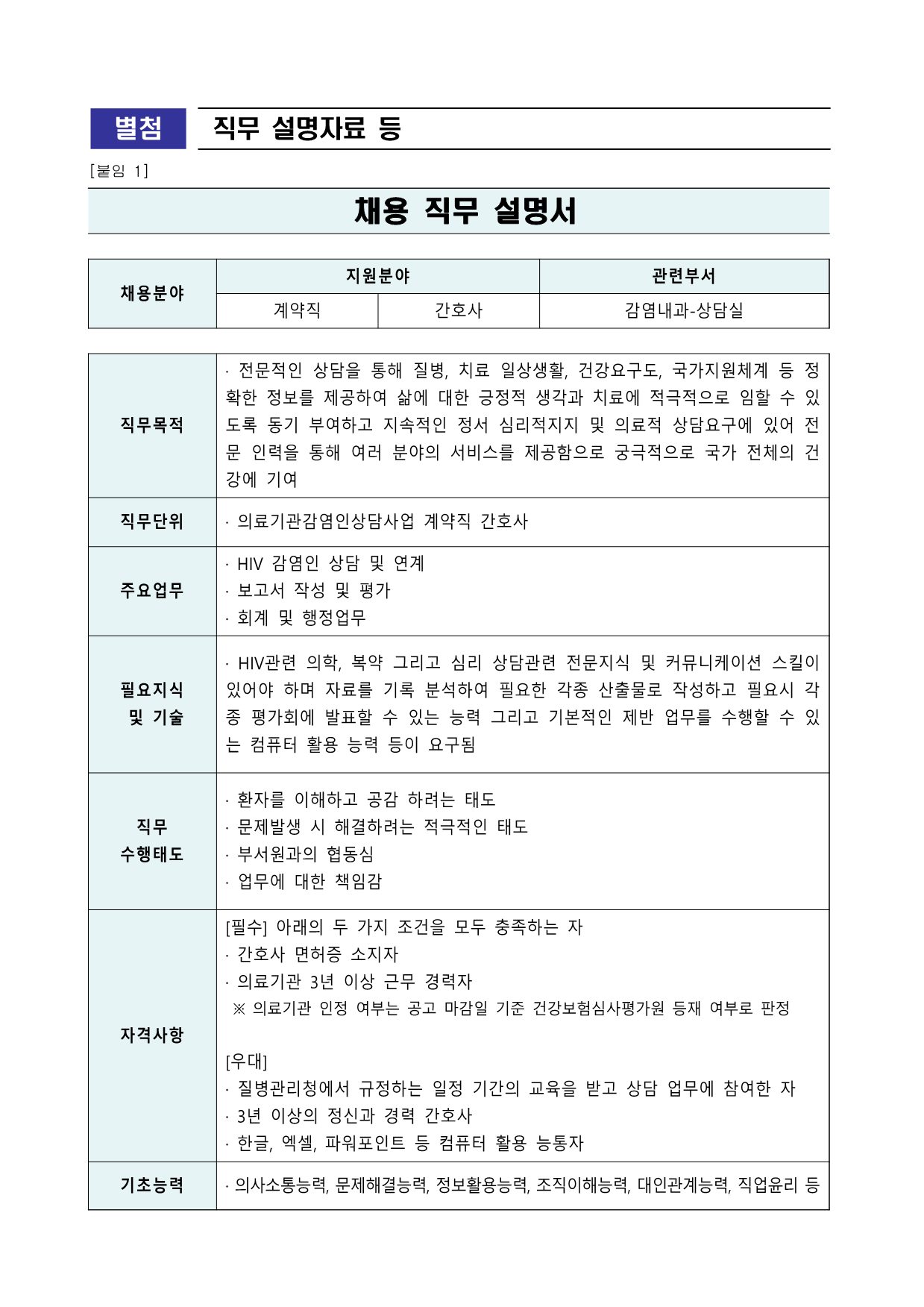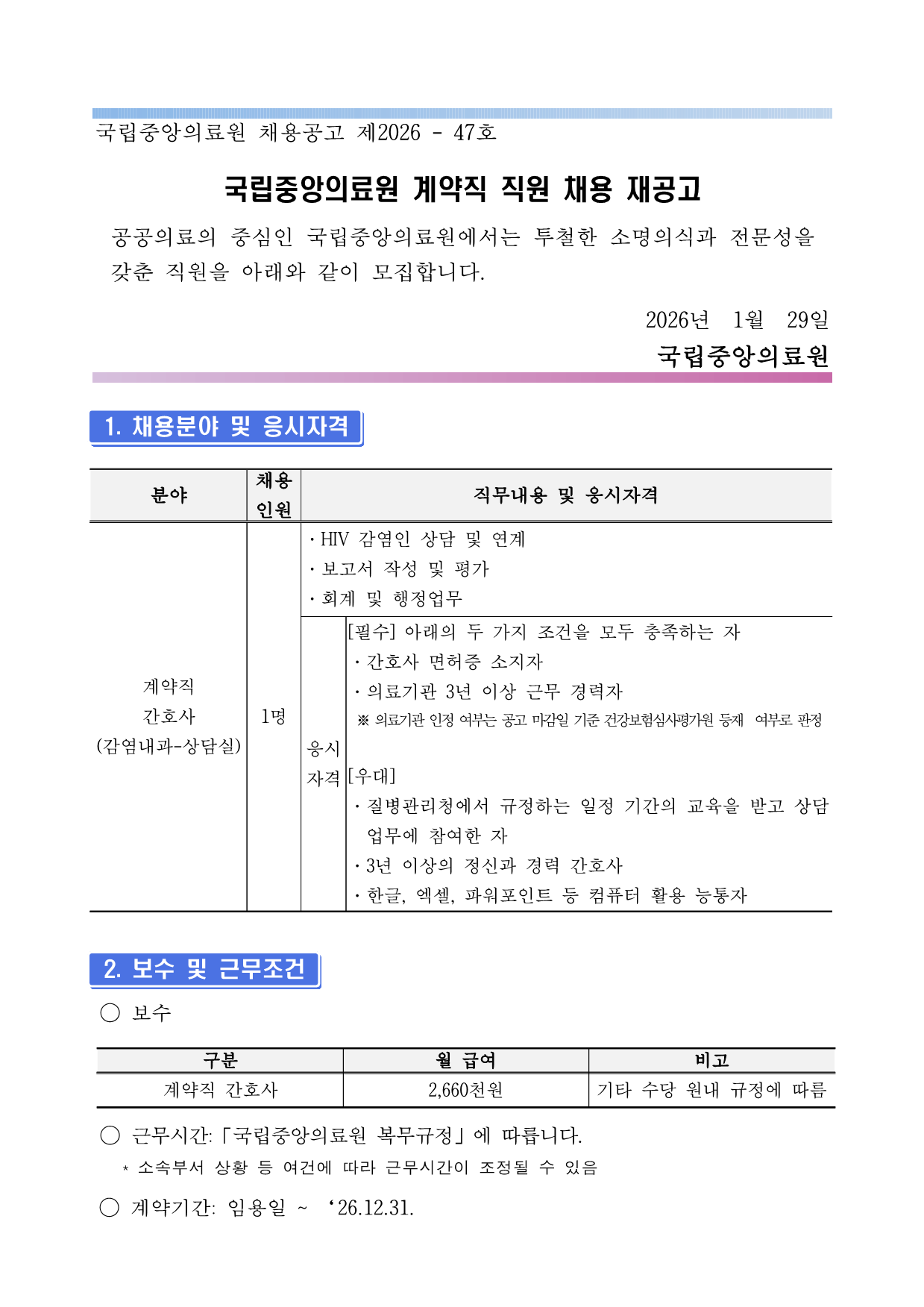 ±¹¸³Áß¾ÓÀÇ·á¿ø ä¿ë°ø°í Á¦2026 - 47È£ ±¹¸³Áß¾ÓÀÇ·á¿ø °è¾àÁ÷ Á÷¿ø ä¿ë Àç°ø°í °ø°øÀÇ·áÀÇ Áß½ÉÀÎ ±¹¸³Áß¾ÓÀÇ·á¿ø¿¡¼´Â ÅõöÇÑ ¼Ò¸íÀǽİú Àü¹®¼ºÀ»°®Ãá Á÷¿øÀ» ¾Æ·¡¿Í °°ÀÌ ¸ðÁýÇÕ´Ï´Ù. 2026³â 1¿ù 29Àϱ¹¸³Áß¾ÓÀÇ·á¿ø1. ä¿ëºÐ¾ß ¹× ÀÀ½ÃÀÚ°Ý ºÐ¾ß ä¿ë Àοø Á÷¹«³»¿ë ¹× ÀÀ½ÃÀÚ°Ý °è¾àÁ÷ °£È£»ç (°¨¿°³»°ú-»ó´ã½Ç) 1¸í ¡¤HIV °¨¿°ÀÎ »ó´ã ¹× ¿¬°è ¡¤º¸°í¼ ÀÛ¼º ¹× Æò°¡ ¡¤È¸°è ¹× ÇàÁ¤¾÷¹« ÀÀ½Ã ÀÚ°Ý [Çʼö] ¾Æ·¡ÀÇ µÎ °¡Áö Á¶°ÇÀ» ¸ðµÎ ÃæÁ·ÇÏ´Â ÀÚ ¡¤°£È£»ç ¸éÇãÁõ ¼ÒÁöÀÚ ¡¤ÀÇ·á±â°ü 3³â ÀÌ»ó ±Ù¹« °æ·ÂÀÚ ¡Ø ÀÇ·á±â°ü ÀÎÁ¤ ¿©ºÎ´Â °ø°í ¸¶°¨ÀÏ ±âÁØ °Ç°º¸Çè½É»çÆò°¡¿ø µîÀç ¿©ºÎ·Î ÆÇÁ¤[¿ì´ë] ¡¤Áúº´°ü¸®Ã»¿¡¼ ±ÔÁ¤ÇÏ´Â ÀÏÁ¤ ±â°£ÀÇ ±³À°À» ¹Þ°í »ó´ã ¾÷¹«¿¡ Âü¿©ÇÑ ÀÚ ¡¤3³â ÀÌ»óÀÇ Á¤½Å°ú °æ·Â °£È£»ç ¡¤ÇѱÛ, ¿¢¼¿, ÆÄ¿öÆ÷ÀÎÆ® µî ÄÄÇ»ÅÍ È°¿ë ´ÉÅëÀÚ 2. º¸¼ö ¹× ±Ù¹«Á¶°Ç ¡Û º¸¼ö ±¸ºÐ ¿ù ±Þ¿© ºñ°í °è¾àÁ÷ °£È£»ç 2,660õ¿ø ±âŸ ¼ö´ç ¿ø³» ±ÔÁ¤¿¡ µû¸§¡Û ±Ù¹«½Ã°£:¡¸±¹¸³Áß¾ÓÀÇ·á¿ø º¹¹«±ÔÁ¤¡¹¿¡ µû¸¨´Ï´Ù. * ¼Ò¼ÓºÎ¼ »óȲ µî ¿©°Ç¿¡ µû¶ó ±Ù¹«½Ã°£ÀÌ Á¶Á¤µÉ ¼ö ÀÖÀ½ ¡Û °è¾à±â°£: ÀÓ¿ëÀÏ ~ ¡®26.12.31.