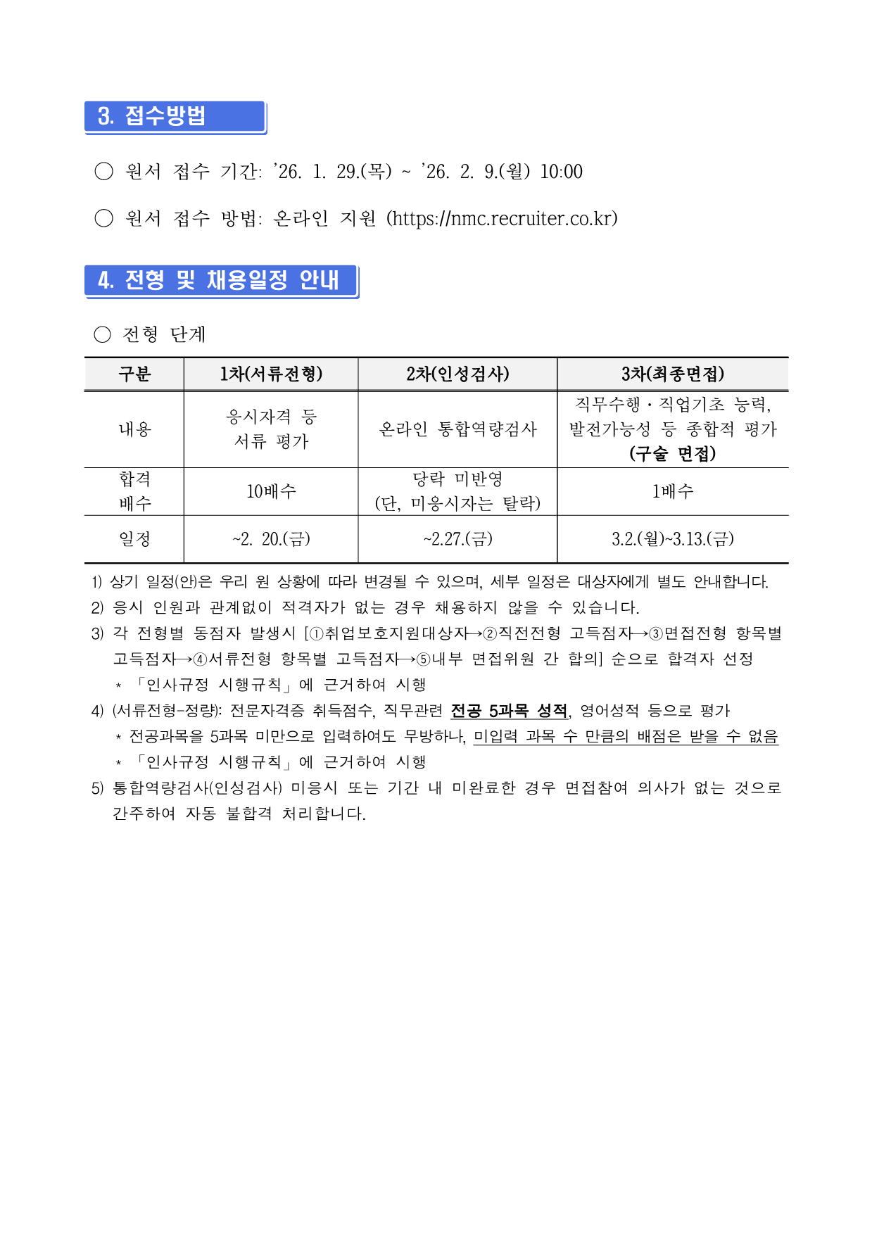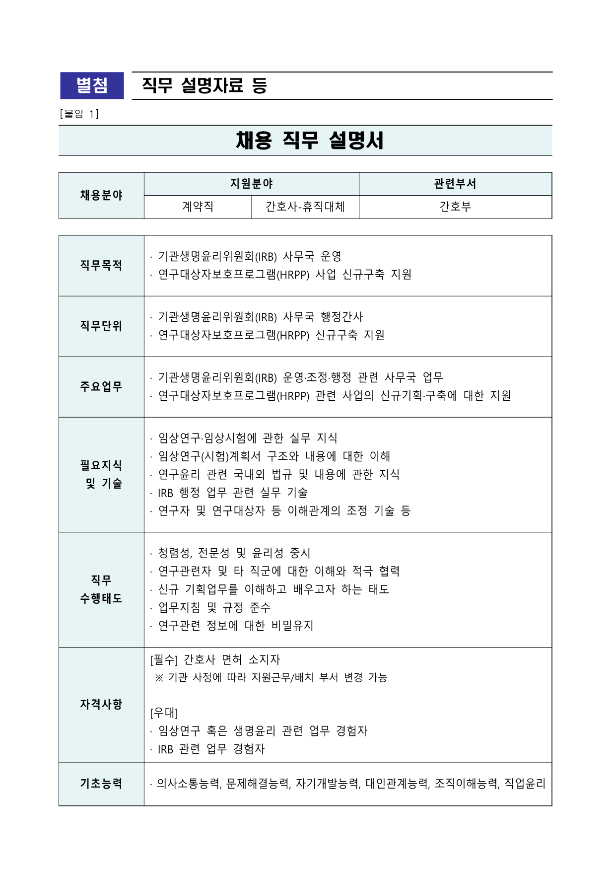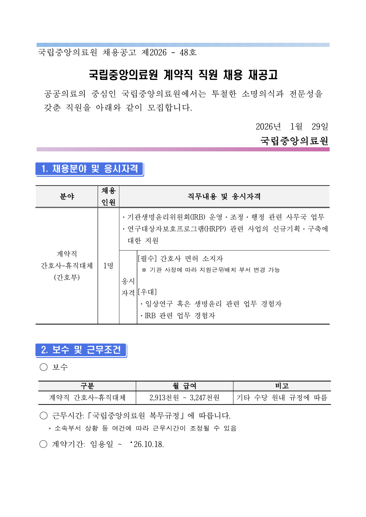 ±¹¸³Áß¾ÓÀÇ·á¿ø ä¿ë°ø°í Á¦2026 - 48È£ ±¹¸³Áß¾ÓÀÇ·á¿ø °è¾àÁ÷ Á÷¿ø ä¿ë Àç°ø°í °ø°øÀÇ·áÀÇ Áß½ÉÀÎ ±¹¸³Áß¾ÓÀÇ·á¿ø¿¡¼´Â ÅõöÇÑ ¼Ò¸íÀǽİú Àü¹®¼ºÀ»°®Ãá Á÷¿øÀ» ¾Æ·¡¿Í °°ÀÌ ¸ðÁýÇÕ´Ï´Ù. 2026³â 1¿ù 29Àϱ¹¸³Áß¾ÓÀÇ·á¿ø1. ä¿ëºÐ¾ß ¹× ÀÀ½ÃÀÚ°Ý ºÐ¾ß ä¿ë Àοø Á÷¹«³»¿ë ¹× ÀÀ½ÃÀÚ°Ý °è¾àÁ÷ °£È£»ç-ÈÞÁ÷´ëü (°£È£ºÎ) 1¸í ¡¤±â°ü»ý¸íÀ±¸®À§¿øÈ¸(IRB) ¿î¿µ¡¤Á¶Á¤¡¤ÇàÁ¤ °ü·Ã »ç¹«±¹ ¾÷¹« ¡¤¿¬±¸´ë»óÀÚº¸È£ÇÁ·Î±×·¥(HRPP) °ü·Ã »ç¾÷ÀÇ ½Å±Ô±âȹ¡¤±¸Ãà¿¡ ´ëÇÑ Áö¿ø ÀÀ½Ã ÀÚ°Ý [Çʼö] °£È£»ç ¸éÇã ¼ÒÁöÀÚ ¡Ø ±â°ü »çÁ¤¿¡ µû¶ó Áö¿ø±Ù¹«/¹èÄ¡ ºÎ¼ º¯°æ °¡´É [¿ì´ë] ¡¤Àӻ󿬱¸ ȤÀº »ý¸íÀ±¸® °ü·Ã ¾÷¹« °æÇèÀÚ ¡¤IRB °ü·Ã ¾÷¹« °æÇèÀÚ 2. º¸¼ö ¹× ±Ù¹«Á¶°Ç ¡Û º¸¼ö ±¸ºÐ ¿ù ±Þ¿© ºñ°í °è¾àÁ÷ °£È£»ç-ÈÞÁ÷´ëü 2,913õ¿ø ~ 3,247õ¿ø ±âŸ ¼ö´ç ¿ø³» ±ÔÁ¤¿¡ µû¸§¡Û ±Ù¹«½Ã°£:¡¸±¹¸³Áß¾ÓÀÇ·á¿ø º¹¹«±ÔÁ¤¡¹¿¡ µû¸¨´Ï´Ù. * ¼Ò¼ÓºÎ¼ »óȲ µî ¿©°Ç¿¡ µû¶ó ±Ù¹«½Ã°£ÀÌ Á¶Á¤µÉ ¼ö ÀÖÀ½ ¡Û °è¾à±â°£: ÀÓ¿ëÀÏ ~ ¡®26.10.18.