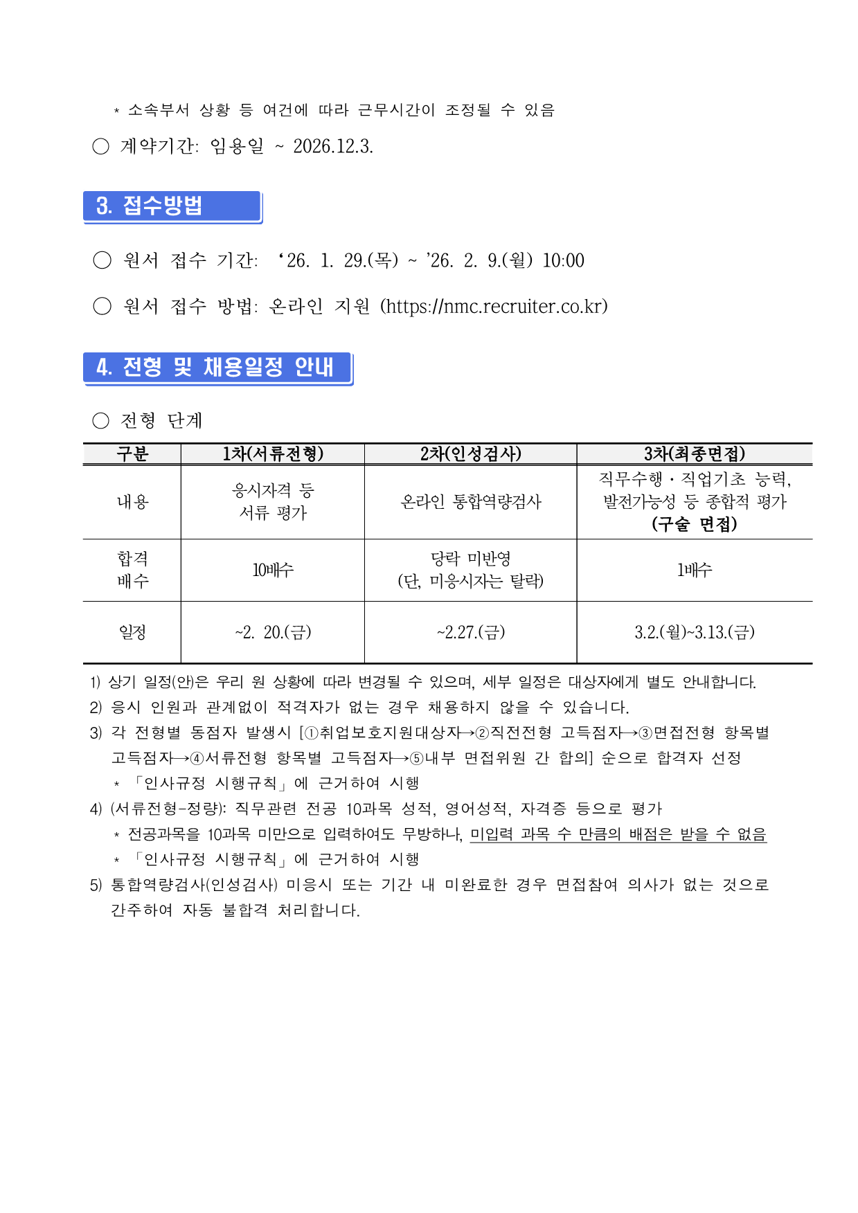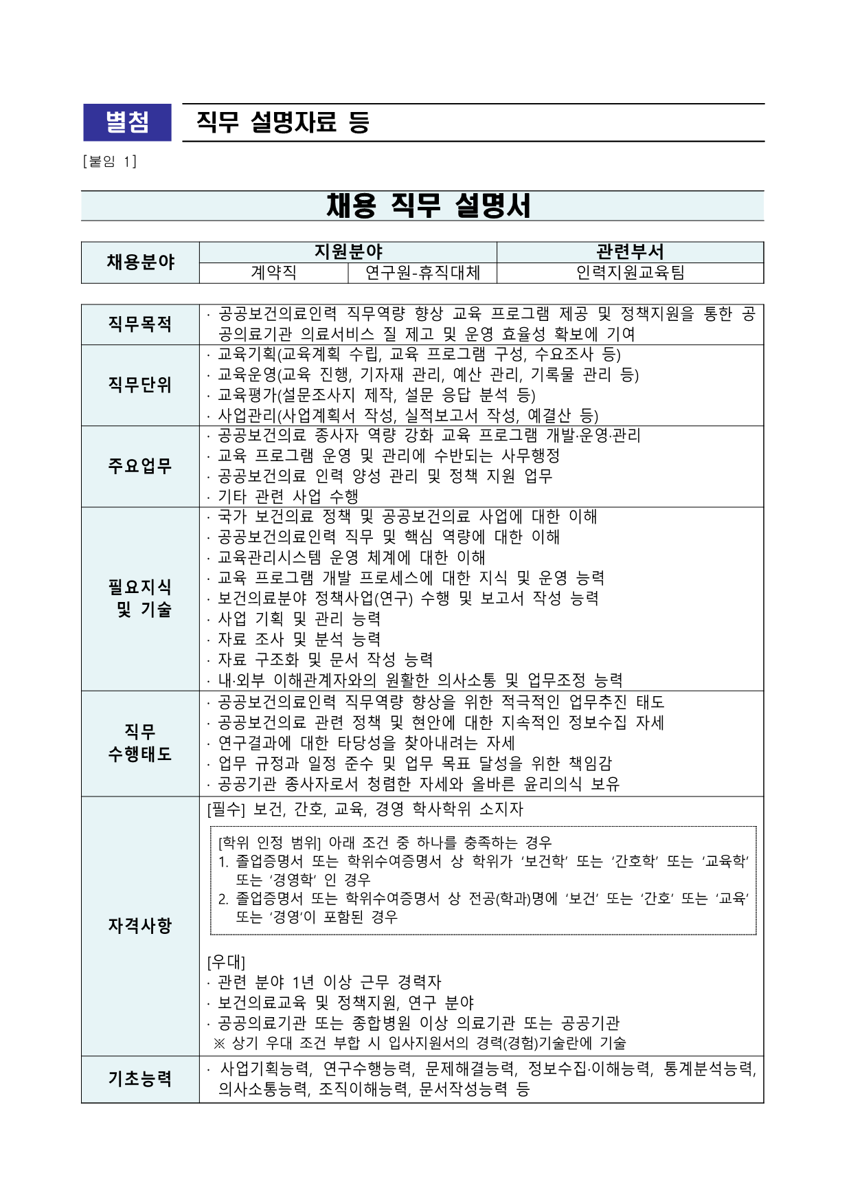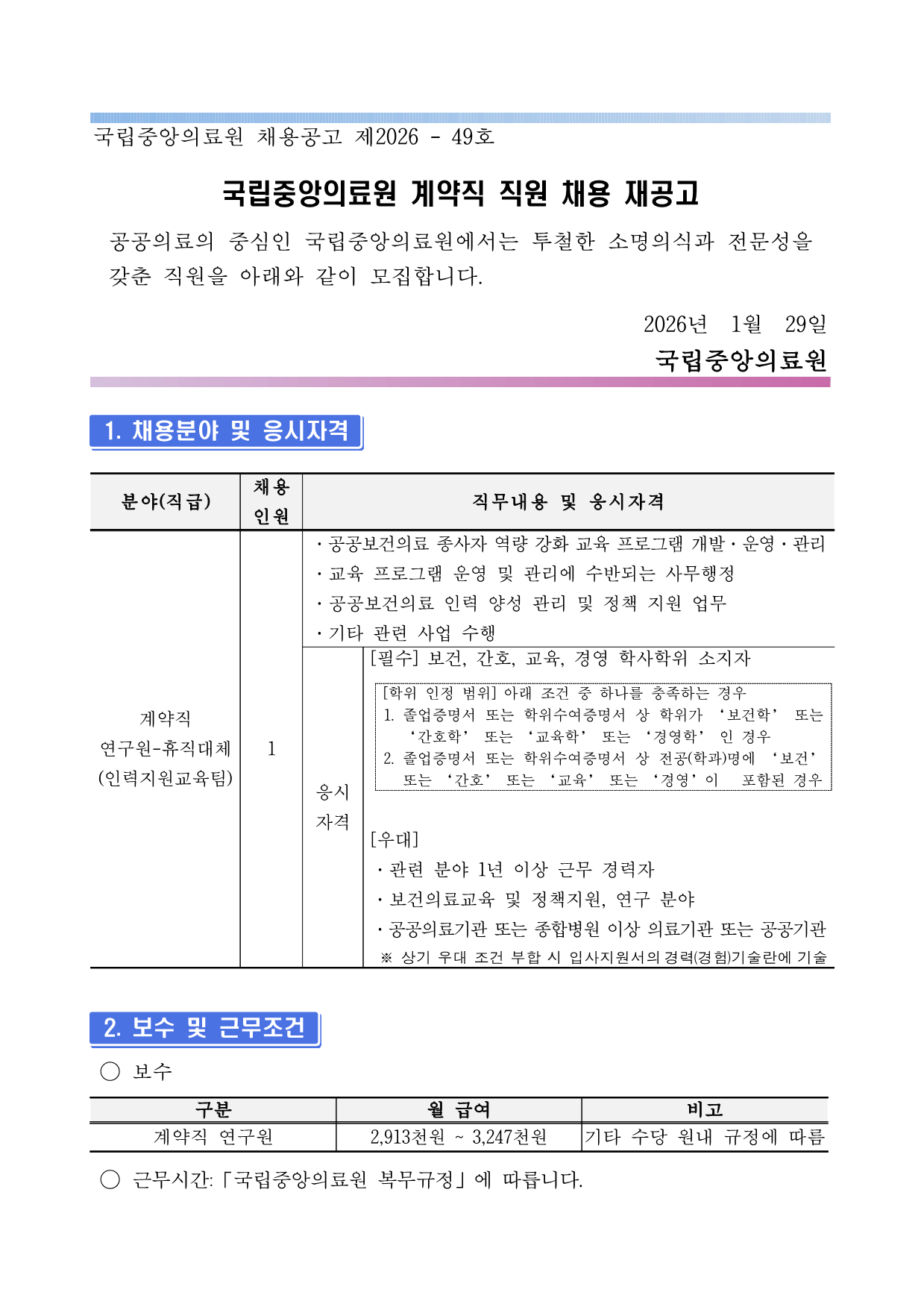 ±¹¸³Áß¾ÓÀÇ·á¿ø ä¿ë°ø°í Á¦2026 - 49È£ ±¹¸³Áß¾ÓÀÇ·á¿ø °è¾àÁ÷ Á÷¿ø ä¿ë Àç°ø°í °ø°øÀÇ·áÀÇ Áß½ÉÀÎ ±¹¸³Áß¾ÓÀÇ·á¿ø¿¡¼´Â ÅõöÇÑ ¼Ò¸íÀǽİú Àü¹®¼ºÀ»°®Ãá Á÷¿øÀ» ¾Æ·¡¿Í °°ÀÌ ¸ðÁýÇÕ´Ï´Ù. 2026³â 1¿ù 29Àϱ¹¸³Áß¾ÓÀÇ·á¿ø1. ä¿ëºÐ¾ß ¹× ÀÀ½ÃÀÚ°Ý ºÐ¾ß(Á÷±Þ) ä¿ë Àοø Á÷¹«³»¿ë ¹× ÀÀ½ÃÀÚ°Ý °è¾àÁ÷ ¿¬±¸¿ø-ÈÞÁ÷´ëü (ÀηÂÁö¿ø±³À°ÆÀ) 1 ¡¤°ø°øº¸°ÇÀÇ·á Á¾»çÀÚ ¿ª·® °È ±³À° ÇÁ·Î±×·¥ °³¹ß¡¤¿î¿µ¡¤°ü¸®¡¤±³À° ÇÁ·Î±×·¥ ¿î¿µ ¹× °ü¸®¿¡ ¼ö¹ÝµÇ´Â »ç¹«ÇàÁ¤ ¡¤°ø°øº¸°ÇÀÇ·á Àη ¾ç¼º °ü¸® ¹× Á¤Ã¥ Áö¿ø ¾÷¹« ¡¤±âŸ °ü·Ã »ç¾÷ ¼öÇà ÀÀ½Ã ÀÚ°Ý [Çʼö] º¸°Ç, °£È£, ±³À°, °æ¿µ ÇлçÇÐÀ§ ¼ÒÁöÀÚ [ÇÐÀ§ ÀÎÁ¤ ¹üÀ§] ¾Æ·¡ Á¶°Ç Áß Çϳª¸¦ ÃæÁ·ÇÏ´Â °æ¿ì 1. Á¹¾÷Áõ¸í¼ ¶Ç´Â ÇÐÀ§¼ö¿©Áõ¸í¼ »ó ÇÐÀ§°¡ ¡®º¸°ÇÇС¯ ¶Ç´Â ¡®°£È£ÇС¯ ¶Ç´Â ¡®±³À°ÇС¯ ¶Ç´Â ¡®°æ¿µÇС¯ ÀÎ °æ¿ì 2. Á¹¾÷Áõ¸í¼ ¶Ç´Â ÇÐÀ§¼ö¿©Áõ¸í¼ »ó Àü°ø(Çаú)¸í¿¡ ¡®º¸°Ç¡¯ ¶Ç´Â ¡®°£È£¡¯ ¶Ç´Â ¡®±³À°¡¯ ¶Ç´Â ¡®°æ¿µ¡¯ÀÌ Æ÷ÇÔµÈ °æ¿ì[¿ì´ë] ¡¤°ü·Ã ºÐ¾ß 1³â ÀÌ»ó ±Ù¹« °æ·ÂÀÚ ¡¤º¸°ÇÀÇ·á±³À° ¹× Á¤Ã¥Áö¿ø, ¿¬±¸ ºÐ¾ß ¡¤°ø°øÀÇ·á±â°ü ¶Ç´Â Á¾ÇÕº´¿ø ÀÌ»ó ÀÇ·á±â°ü ¶Ç´Â °ø°ø±â°ü ¡Ø »ó±â ¿ì´ë Á¶°Ç ºÎÇÕ ½Ã ÀÔ»çÁö¿ø¼ÀÇ °æ·Â(°æÇè)±â¼ú¶õ¿¡ ±â¼ú