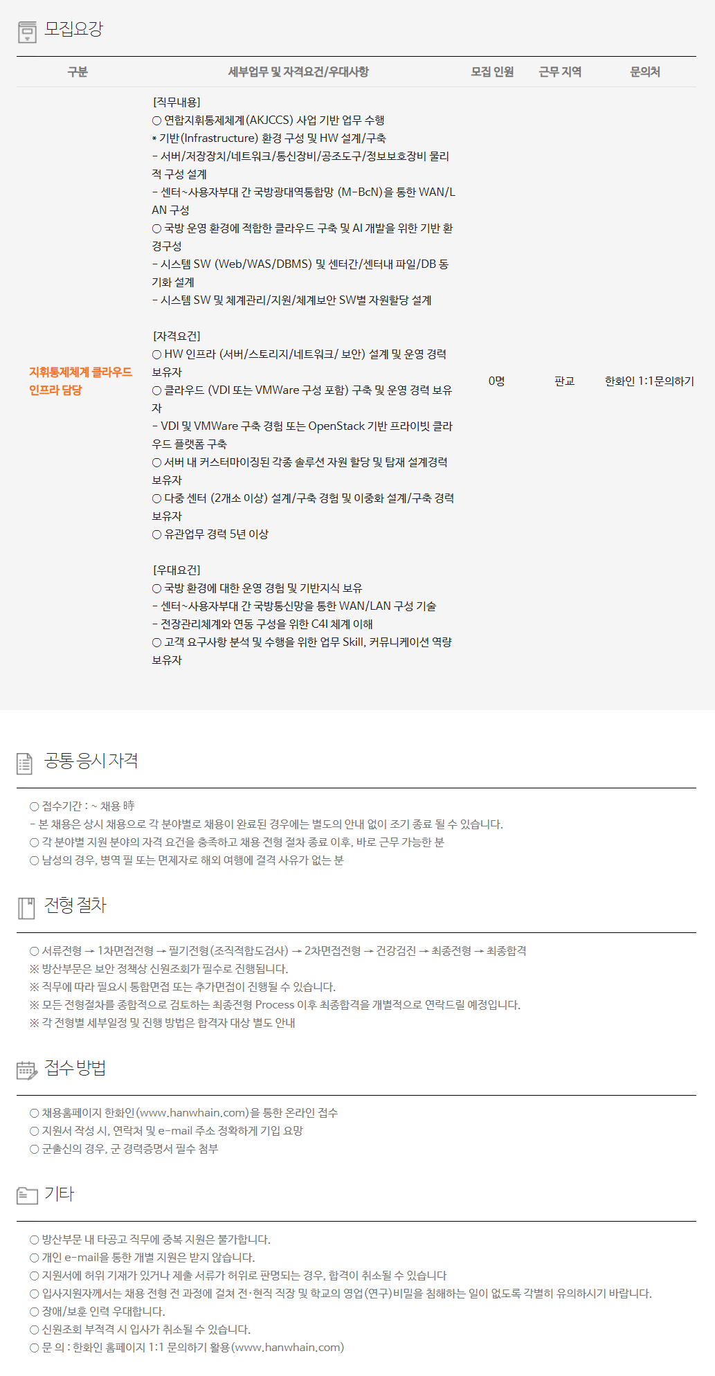 ±¸ºÐ ¼¼ºÎ¾÷¹« ¹× ÀÚ°Ý¿ä°Ç/¿ì´ë»çÇ× ¸ðÁý Àοø ±Ù¹« Áö¿ª ¹®ÀÇó ÁöÈÖÅëÁ¦Ã¼°è Ŭ¶ó¿ìµå ÀÎÇÁ¶ó ´ã´ç [Á÷¹«³»¿ë] ¡Û ¿¬ÇÕÁöÈÖÅëÁ¦Ã¼°è(AKJCCS) »ç¾÷ ±â¹Ý ¾÷¹« ¼öÇà * ±â¹Ý(Infrastructure) ȯ°æ ±¸¼º ¹× HW ¼³°è/±¸Ãà - ¼­¹ö/ÀúÀåÀåÄ¡/³×Æ®¿öÅ©/Åë½ÅÀåºñ/°øÁ¶µµ±¸/Á¤º¸º¸È£Àåºñ ¹°¸®Àû ±¸¼º ¼³°è - ¼¾ÅÍ~»ç¿ëÀÚºÎ´ë °£ ±¹¹æ±¤´ë¿ªÅëÇÕ¸Á (M-BcN)À» ÅëÇÑ WAN/LAN ±¸¼º ¡Û ±¹¹æ ¿î¿µ ȯ°æ¿¡ ÀûÇÕÇÑ Å¬¶ó¿ìµå ±¸Ãà ¹× AI °³¹ßÀ» À§ÇÑ ±â¹Ý ȯ°æ±¸¼º - ½Ã½ºÅÛ SW (Web/WAS/DBMS) ¹× ¼¾ÅͰ£/¼¾Åͳ» ÆÄÀÏ/DB µ¿±âÈ­ ¼³°è - ½Ã½ºÅÛ SW ¹× ü°è°ü¸®/Áö¿ø/ü°èº¸¾È SWº° ÀÚ¿øÇÒ´ç ¼³°è [ÀÚ°Ý¿ä°Ç] ¡Û HW ÀÎÇÁ¶ó (¼­¹ö/½ºÅ丮Áö/³×Æ®¿öÅ©/ º¸¾È) ¼³°è ¹× ¿î¿µ °æ·Â º¸À¯ÀÚ ¡Û Ŭ¶ó¿ìµå (VDI ¶Ç´Â VMWare ±¸¼º Æ÷ÇÔ) ±¸Ãà ¹× ¿î¿µ °æ·Â º¸À¯ÀÚ - VDI ¹× VMWare ±¸Ãà °æÇè ¶Ç´Â OpenStack ±â¹Ý ÇÁ¶óÀ̺ø Ŭ¶ó¿ìµå Ç÷§Æû ±¸Ãà ¡Û ¼­¹ö ³» Ä¿½ºÅ͸¶ÀÌ¡µÈ °¢Á¾ ¼Ö·ç¼Ç ÀÚ¿ø ÇÒ´ç ¹× Å¾Àç ¼³°è°æ·Â º¸À¯ÀÚ ¡Û ´ÙÁß ¼¾ÅÍ (2°³¼Ò ÀÌ»ó) ¼³°è/±¸Ãà °æÇè ¹× ÀÌÁßÈ­ ¼³°è/±¸Ãà °æ·Â º¸À¯ÀÚ ¡Û À¯°ü¾÷¹« °æ·Â 5³â ÀÌ»ó [¿ì´ë¿ä°Ç] ¡Û ±¹¹æ ȯ°æ¿¡ ´ëÇÑ ¿î¿µ °æÇè ¹× ±â¹ÝÁö½Ä º¸À¯ - ¼¾ÅÍ~»ç¿ëÀÚºÎ´ë °£ ±¹¹æÅë½Å¸ÁÀ» ÅëÇÑ WAN/LAN ±¸¼º ±â¼ú - ÀüÀå°ü¸®Ã¼°è¿Í ¿¬µ¿ ±¸¼ºÀ» À§ÇÑ C4I ü°è ÀÌÇØ ¡Û °í°´ ¿ä±¸»çÇ× ºÐ¼® ¹× ¼öÇàÀ» À§ÇÑ ¾÷¹« Skill, Ä¿¹Â´ÏÄÉÀÌ¼Ç ¿ª·® º¸À¯ÀÚ 0¸í ÆÇ±³ ÇÑÈ­ÀÎ 1:1¹®ÀÇÇϱâ