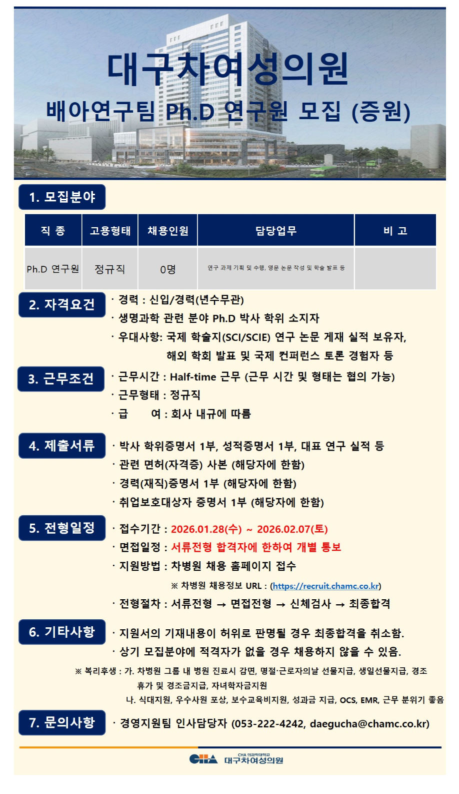 [Â÷¿©¼ºÀÇÇבּ¸¼Ò ´ë±¸] ´ë±¸Â÷¿©¼ºÀÇ¿ø ¹è¾Æ¿¬±¸ÆÀ Ph.D¿¬±¸¿ø ¸ðÁý (Áõ¿ø)