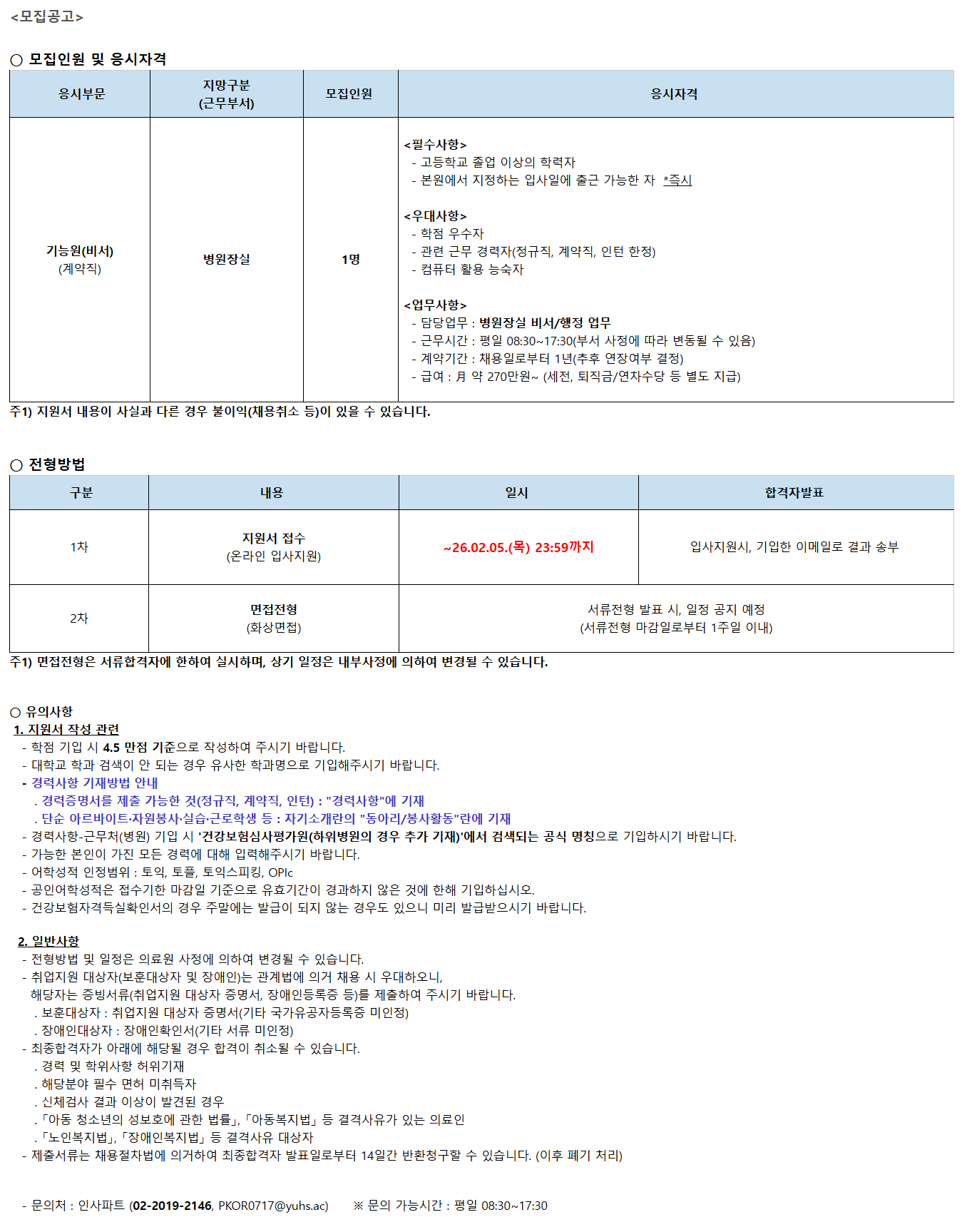 <¸ðÁý°ø°í> ¡Û ¸ðÁýÀοø ¹× ÀÀ½ÃÀÚ°Ý ÀÀ½ÃºÎ¹® Áö¸Á±¸ºÐ (±Ù¹«ºÎ¼­) ¸ðÁýÀοø ÀÀ½ÃÀÚ°Ý ±â´É¿ø(ºñ¼­) (°è¾àÁ÷) º´¿øÀå½Ç 1¸í <Çʼö»çÇ×> - °íµîÇб³ Á¹¾÷ ÀÌ»óÀÇ ÇзÂÀÚ - º»¿ø¿¡¼­ ÁöÁ¤ÇÏ´Â ÀÔ»çÀÏ¿¡ Ãâ±Ù °¡´ÉÇÑ ÀÚ *Áï½Ã <¿ì´ë»çÇ×> - ÇÐÁ¡ ¿ì¼öÀÚ - °ü·Ã ±Ù¹« °æ·ÂÀÚ(Á¤±ÔÁ÷, °è¾àÁ÷, ÀÎÅÏ ÇÑÁ¤) - ÄÄÇ»ÅÍ È°¿ë ´É¼÷ÀÚ <¾÷¹«»çÇ×> - ´ã´ç¾÷¹« : º´¿øÀå½Ç ºñ¼­/ÇàÁ¤ ¾÷¹« - ±Ù¹«½Ã°£ : ÆòÀÏ 08:30~17:30(ºÎ¼­ »çÁ¤¿¡ µû¶ó º¯µ¿µÉ ¼ö ÀÖÀ½) - °è¾à±â°£ : ä¿ëÀϷκÎÅÍ 1³â(ÃßÈÄ ¿¬Àå¿©ºÎ °áÁ¤) - ±Þ¿© : êÅ ¾à 270¸¸¿ø~ (¼¼Àü, ÅðÁ÷±Ý/¿¬Â÷¼ö´ç µî º°µµ Áö±Þ) ÁÖ1) Áö¿ø¼­ ³»¿ëÀÌ »ç½Ç°ú ´Ù¸¥ °æ¿ì ºÒÀÌÀÍ(ä¿ëÃë¼Ò µî)ÀÌ ÀÖÀ» ¼ö ÀÖ½À´Ï´Ù. ¡Û ÀüÇü¹æ¹ý ±¸ºÐ ³»¿ë ÀϽà ÇÕ°ÝÀÚ¹ßÇ¥ 1Â÷ Áö¿ø¼­ Á¢¼ö (¿Â¶óÀÎ ÀÔ»çÁö¿ø) ~26.02.05.(¸ñ) 23:59±îÁö ÀÔ»çÁö¿ø½Ã, ±âÀÔÇÑ À̸ÞÀÏ·Î °á°ú ¼ÛºÎ 2Â÷ ¸éÁ¢ÀüÇü (È­»ó¸éÁ¢) ¼­·ùÀüÇü ¹ßÇ¥ ½Ã, ÀÏÁ¤ °øÁö ¿¹Á¤ (¼­·ùÀüÇü ¸¶°¨ÀϷκÎÅÍ 1ÁÖÀÏ À̳») ÁÖ1) ¸éÁ¢ÀüÇüÀº ¼­·ùÇÕ°ÝÀÚ¿¡ ÇÑÇÏ¿© ½Ç½ÃÇϸç, »ó±â ÀÏÁ¤Àº ³»ºÎ»çÁ¤¿¡ ÀÇÇÏ¿© º¯°æµÉ ¼ö ÀÖ½À´Ï´Ù. ¡Û À¯ÀÇ»çÇ× 1. Áö¿ø¼­ ÀÛ¼º °ü·Ã - ÇÐÁ¡ ±âÀÔ ½Ã 4.5 ¸¸Á¡ ±âÁØÀ¸·Î ÀÛ¼ºÇÏ¿© Áֽñ⠹ٶø´Ï´Ù. - ´ëÇб³ Çаú °Ë»öÀÌ ¾È µÇ´Â °æ¿ì À¯»çÇÑ Çаú¸íÀ¸·Î ±âÀÔÇØÁֽñ⠹ٶø´Ï´Ù. - °æ·Â»çÇ× ±âÀç¹æ¹ý ¾È³» . °æ·ÂÁõ¸í¼­¸¦ Á¦Ãâ °¡´ÉÇÑ °Í(Á¤±ÔÁ÷, °è¾àÁ÷, ÀÎÅÏ) : "°æ·Â»çÇ×"¿¡ ±âÀç . ´Ü¼ø ¾Æ¸£¹ÙÀÌÆ®¡¤ÀÚ¿øºÀ»ç¡¤½Ç½À¡¤±Ù·ÎÇлý µî : ÀÚ±â¼Ò°³¶õÀÇ "µ¿¾Æ¸®/ºÀ»çȰµ¿"¶õ¿¡ ±âÀç - °æ·Â»çÇ×-±Ù¹«Ã³(º´¿ø) ±âÀÔ ½Ã '°Ç°­º¸Çè½É»çÆò°¡¿ø(ÇÏÀ§º´¿øÀÇ °æ¿ì Ãß°¡ ±âÀç)'¿¡¼­ °Ë»öµÇ´Â °ø½Ä ¸íĪÀ¸·Î ±âÀÔÇϽñ⠹ٶø´Ï´Ù. - °¡´ÉÇÑ º»ÀÎÀÌ °¡Áø ¸ðµç °æ·Â¿¡ ´ëÇØ ÀÔ·ÂÇØÁֽñ⠹ٶø´Ï´Ù. - ¾îÇмºÀû ÀÎÁ¤¹üÀ§ : ÅäÀÍ, ÅäÇÃ, ÅäÀͽºÇÇÅ·, OPIc - °øÀξîÇмºÀûÀº Á¢¼ö±âÇÑ ¸¶°¨ÀÏ ±âÁØÀ¸·Î À¯È¿±â°£ÀÌ °æ°úÇÏÁö ¾ÊÀº °Í¿¡ ÇÑÇØ ±âÀÔÇϽʽÿÀ. - °Ç°­º¸ÇèÀڰݵæ½ÇÈ®Àμ­ÀÇ °æ¿ì ÁÖ¸»¿¡´Â ¹ß±ÞÀÌ µÇÁö ¾Ê´Â °æ¿ìµµ ÀÖÀ¸´Ï ¹Ì¸® ¹ß±Þ¹ÞÀ¸½Ã±â ¹Ù¶ø´Ï´Ù. 2. ÀϹݻçÇ× - ÀüÇü¹æ¹ý ¹× ÀÏÁ¤Àº ÀÇ·á¿ø »çÁ¤¿¡ ÀÇÇÏ¿© º¯°æµÉ ¼ö ÀÖ½À´Ï´Ù. - Ãë¾÷Áö¿ø ´ë»óÀÚ(º¸ÈÆ´ë»óÀÚ ¹× Àå¾ÖÀÎ)´Â °ü°è¹ý¿¡ ÀǰŠä¿ë ½Ã ¿ì´ëÇÏ¿À´Ï, ÇØ´çÀÚ´Â Áõºù¼­·ù(Ãë¾÷Áö¿ø ´ë»óÀÚ Áõ¸í¼­, Àå¾ÖÀεî·ÏÁõ µî)¸¦ Á¦ÃâÇÏ¿© Áֽñ⠹ٶø´Ï´Ù. . º¸ÈÆ´ë»óÀÚ : Ãë¾÷Áö¿ø ´ë»óÀÚ Áõ¸í¼­(±âŸ ±¹°¡À¯°øÀÚµî·ÏÁõ ¹ÌÀÎÁ¤) . Àå¾ÖÀδë»óÀÚ : Àå¾ÖÀÎÈ®Àμ­(±âŸ ¼­·ù ¹ÌÀÎÁ¤) - ÃÖÁ¾ÇÕ°ÝÀÚ°¡ ¾Æ·¡¿¡ ÇØ´çµÉ °æ¿ì ÇÕ°ÝÀÌ Ãë¼ÒµÉ ¼ö ÀÖ½À´Ï´Ù. . °æ·Â ¹× ÇÐÀ§»çÇ× ÇãÀ§±âÀç . ÇØ´çºÐ¾ß Çʼö ¸éÇã ¹ÌÃëµæÀÚ . ½Åü°Ë»ç °á°ú ÀÌ»óÀÌ ¹ß°ßµÈ °æ¿ì . ¡¸¾Æµ¿ û¼Ò³âÀÇ ¼ºº¸È£¿¡ °üÇÑ ¹ý·ü¡¹, ¡¸¾Æµ¿º¹Áö¹ý¡¹ µî °á°Ý»çÀ¯°¡ ÀÖ´Â ÀÇ·áÀÎ . ¡¸³ëÀκ¹Áö¹ý¡¹, ¡¸Àå¾ÖÀκ¹Áö¹ý¡¹ µî °á°Ý»çÀ¯ ´ë»óÀÚ - Á¦Ãâ¼­·ù´Â ä¿ëÀýÂ÷¹ý¿¡ ÀǰÅÇÏ¿© ÃÖÁ¾ÇÕ°ÝÀÚ ¹ßÇ¥ÀϷκÎÅÍ 14Àϰ£ ¹Ýȯû±¸ÇÒ ¼ö ÀÖ½À´Ï´Ù. (ÀÌÈÄ Æó±â ó¸®) - ¹®ÀÇó : ÀλçÆÄÆ® (***-****-****, ******@*******.***) ¡Ø ¹®ÀÇ °¡´É½Ã°£ : ÆòÀÏ 08:30~17:30