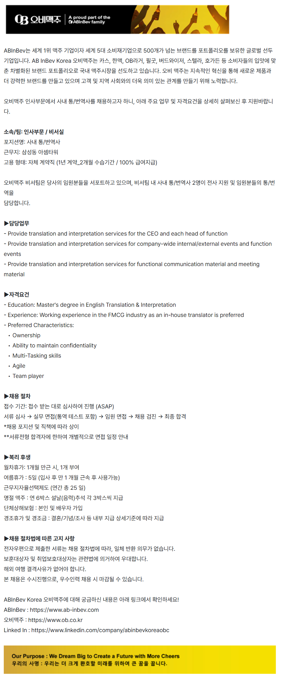 ABInBev´Â ¼¼°è ​1À§ ​¸ÆÁÖ ​±â¾÷ÀÌÀÚ ¼¼°è ​5´ë ¼ÒºñÀç±â¾÷À¸·Î 500°³°¡ ³Ñ´Â ​ºê·£µå¸¦ ​Æ÷Æ®Æú¸®¿À¸¦ º¸À¯ÇÑ ​±Û·Î¹ú ¼±µÎ ±â¾÷ÀÔ´Ï´Ù. ​AB InBev ​Korea ​¿Àºñ¸ÆÁÖ´Â Ä«½º, ​ÇѸÆ, ​OB¶ó°Å, ​ÇʱÂ, ¹öµå¿ÍÀÌÀú, ½ºÅÚ¶ó, ​È£°¡µç ​µî ¼ÒºñÀÚµéÀÇ ÀÔ¸À¿¡ ​¸ÂÃá ​Â÷º°È­µÈ ​ºê·£µå Æ÷Æ®Æú¸®¿À·Î ±¹³» ​¸ÆÁÖ½ÃÀåÀ» ¼±µµÇϰí ​ÀÖ½À´Ï´Ù. ​¿Àºñ ¸ÆÁÖ´Â ​Áö¼ÓÀûÀÎ Çõ½ÅÀ» ​ÅëÇØ ​»õ·Î¿î Á¦Ç°°ú ´õ ​°­·ÂÇÑ ºê·£µå¸¦ ​¸¸µé°í ÀÖÀ¸¸ç °í°´ ¹× Áö¿ª »çȸ¿ÍÀÇ ´õ¿í ÀÇ¹Ì ÀÖ´Â °ü°è¸¦ ¸¸µé±â À§ÇØ ³ë·ÂÇÕ´Ï´Ù. ¿Àºñ¸ÆÁÖ ÀλçºÎ¹®¿¡¼­ »ç³» Åë/¹ø¿ª»ç¸¦ ä¿ëÇϰíÀÚ ÇÏ´Ï, ¾Æ·¡ ÁÖ¿ä ¾÷¹« ¹× ÀÚ°Ý¿ä°ÇÀ» »ó¼¼È÷ »ìÆìº¸½Å ÈÄ Áö¿ø¹Ù¶ø´Ï´Ù. ¼Ò¼Ó/ÆÀ: ÀλçºÎ¹® / ºñ¼­½Ç Æ÷Áö¼Ç¸í: »ç³» Åë/¹ø¿ª»ç ±Ù¹«Áö: »ï¼ºµ¿ ¾Æ¼ÀŸ¿ö °í¿ë ÇüÅÂ: ÀÚü °è¾àÁ÷ (1³â °è¾à_2°³¿ù ¼ö½À±â°£ / 100% ±Þ¿©Áö±Þ) ¿Àºñ¸ÆÁÖ ºñ¼­ÆÀÀº ´ç»çÀÇ ÀÓ¿øºÐµéÀ» ¼­Æ÷Æ®Çϰí ÀÖÀ¸¸ç, ºñ¼­ÆÀ ³» »ç³» Åë/¹ø¿ª»ç 2¸íÀÌ Àü»ç Áö¿ø ¹× ÀÓ¿øºÐµéÀÇ Åë/¹ø¿ªÀ» ´ã´çÇÕ´Ï´Ù. ¢º´ã´ç¾÷¹« - Provide translation and interpretation services for the CEO and each head of function - Provide translation and interpretation services for company-wide internal/external events and function events - Provide translation and interpretation services for functional communication material and meeting material ¢ºÀÚ°Ý¿ä°Ç - Education: Master's degree in English Translation & Interpretation - Experience: Working experience in the FMCG industry as an in-house translator is preferred - Preferred Characteristics: Ownership Ability to maintain confidentiality Multi-Tasking skills Agile Team player ¢ºÃ¤¿ë ÀýÂ÷ Á¢¼ö ±â°£: Á¢¼ö ¹Þ´Â ´ë·Î ½É»çÇÏ¿© ÁøÇà (ASAP) ¼­·ù ½É»ç -> ½Ç¹« ¸éÁ¢(Å뿪 Å×½ºÆ® Æ÷ÇÔ) -> ÀÓ¿ø ¸éÁ¢ -> ä¿ë °ËÁø -> ÃÖÁ¾ ÇÕ°Ý *ä¿ë Æ÷Áö¼Ç ¹× Á÷Ã¥¿¡ µû¶ó »óÀÌ **¼­·ùÀüÇü ÇÕ°ÝÀÚ¿¡ ÇÑÇÏ¿© °³º°ÀûÀ¸·Î ¸éÁ¢ ÀÏÁ¤ ¾È³» ¢ºº¹¸® ÈÄ»ý ¿ùÂ÷ÈÞ°¡: 1°³¿ù ¸¸±Ù ½Ã, 1°³ ºÎ¿© ¿©¸§ÈÞ°¡ : 5ÀÏ (ÀÔ»ç ÈÄ ¸¸ 1 °³¿ù ±Ù¼Ó ÈÄ »ç¿ë°¡´É) ±Ù¹«ÁöÀÚÀ²¼±ÅÃÁ¦µµ (¿¬°£ ÃÑ 25 ÀÏ) ¸íÀý ¸ÆÁÖ : ¿¬ 6¹Ú½º ¼³³¯(À½·Â)Ãß¼® °¢ 3¹Ú½º¾¿ Áö±Þ ´Üü»óÇØº¸Çè : º»ÀÎ ¹× ¹è¿ìÀÚ °¡ÀÔ °æÁ¶ÈÞ°¡ ¹× °æÁ¶±Ý : °áÈ¥/±â³ä/Á¶»ç µî ³»ºÎ Áö±Þ »ó¼¼±âÁØ¿¡ µû¶ó Áö±Þ ¢ºÃ¤¿ë ÀýÂ÷¹ý¿¡ µû¸¥ °íÁö »çÇ× ÀüÀÚ¿ìÆíÀ¸·Î Á¦ÃâÇÑ ¼­·ù´Â ä¿ë ÀýÂ÷¹ý¿¡ µû¶ó, ÀÏü ¹Ýȯ Àǹ«°¡ ¾ø½À´Ï´Ù. º¸ÈÆ´ë»óÀÚ ¹× Ãë¾÷º¸È£´ë»óÀÚ´Â °ü·Ã¹ý¿¡ ÀǰÅÇÏ¿© ¿ì´ëÇÕ´Ï´Ù. ÇØ¿Ü ¿©Çà °á°Ý»çÀ¯°¡ ¾ø¾î¾ß ÇÕ´Ï´Ù. º» ä¿ëÀº ¼ö½ÃÁøÇàÀ¸·Î, ¿ì¼öÀη ä¿ë ½Ã ¸¶°¨µÉ ¼ö ÀÖ½À´Ï´Ù. ABInBev Korea ¿Àºñ¸ÆÁÖ¿¡ ´ëÇØ ±Ã±ÝÇϽг»¿ëÀº ¾Æ·¡ ¸µÅ©¿¡¼­ È®ÀÎÇϼ¼¿ä! ABInBev : https://www.ab-inbev.com ¿Àºñ¸ÆÁÖ : https://www.ob.co.kr Linked In : https://www.linkedin.com/company/abinbevkoreaobc