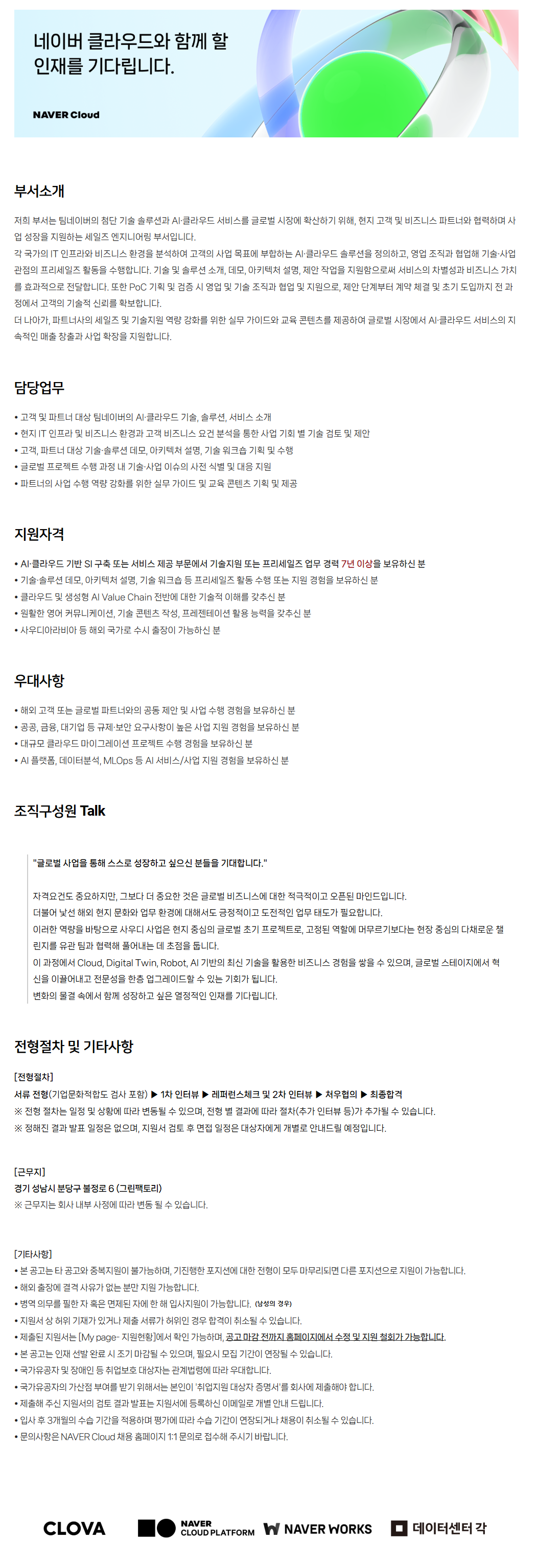 • AI¡¤Å¬¶ó¿ìµå ±â¹Ý SI ±¸Ãà ¶Ç´Â ¼ºñ½º Á¦°ø ºÎ¹®¿¡¼ ±â¼úÁö¿ø ¶Ç´Â ÇÁ¸®¼¼ÀÏÁî ¾÷¹« °æ·Â 7³â ÀÌ»óÀ» º¸À¯ÇϽŠºÐ