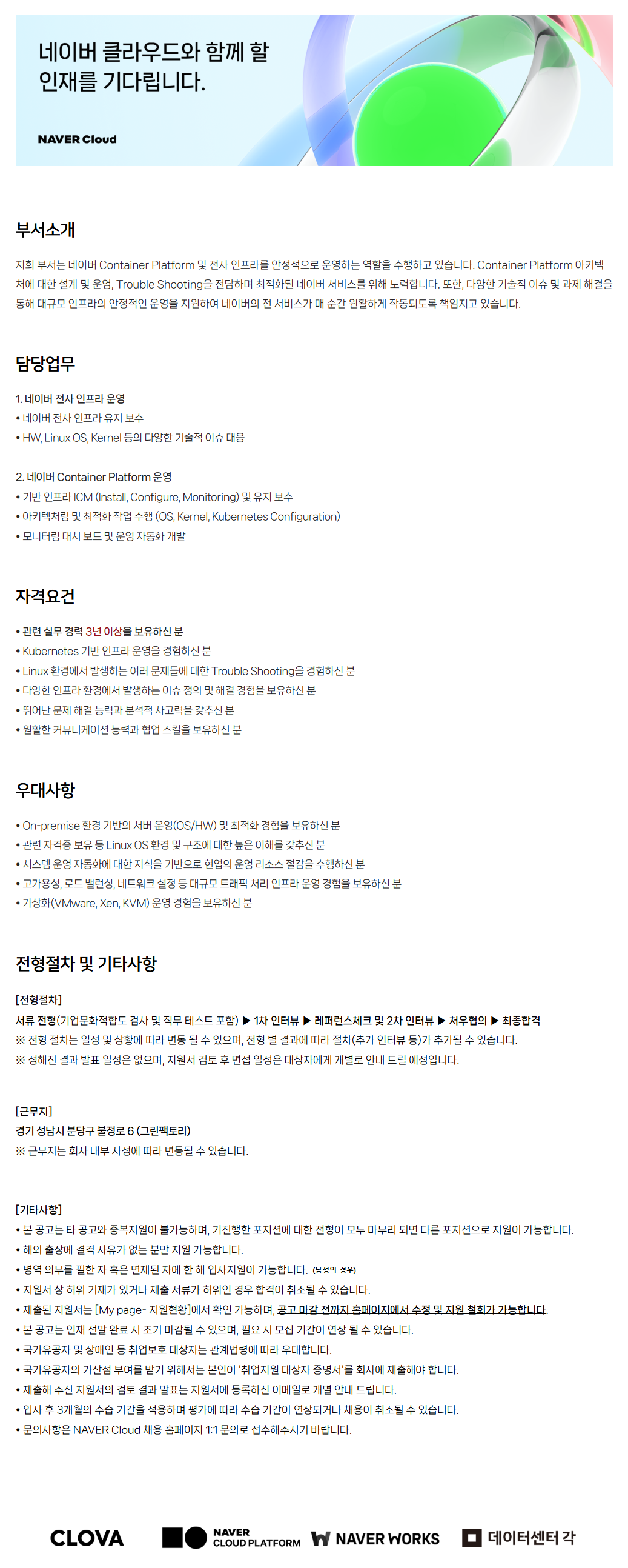 ÀúÈñ ºÎ¼´Â ³×À̹ö Container Platform ¹× Àü»ç ÀÎÇÁ¶ó¸¦ ¾ÈÁ¤ÀûÀ¸·Î ¿î¿µÇÏ´Â ¿ªÇÒÀ» ¼öÇàÇϰí ÀÖ½À´Ï´Ù. Container Platform ¾ÆÅ°ÅØÃ³¿¡ ´ëÇÑ ¼³°è ¹× ¿î¿µ, Trouble ShootingÀ» Àü´ãÇϸç ÃÖÀûÈµÈ ³×À̹ö ¼ºñ½º¸¦ À§ÇØ ³ë·ÂÇÕ´Ï´Ù. ¶ÇÇÑ, ´Ù¾çÇÑ ±â¼úÀû À̽´ ¹× °úÁ¦ ÇØ°áÀ» ÅëÇØ ´ë±Ô¸ð ÀÎÇÁ¶óÀÇ ¾ÈÁ¤ÀûÀÎ ¿î¿µÀ» Áö¿øÇÏ¿© ³×À̹öÀÇ Àü ¼ºñ½º°¡ ¸Å ¼ø°£ ¿øÈ°ÇÏ°Ô ÀÛµ¿µÇµµ·Ï Ã¥ÀÓÁö°í ÀÖ½À´Ï´Ù.
