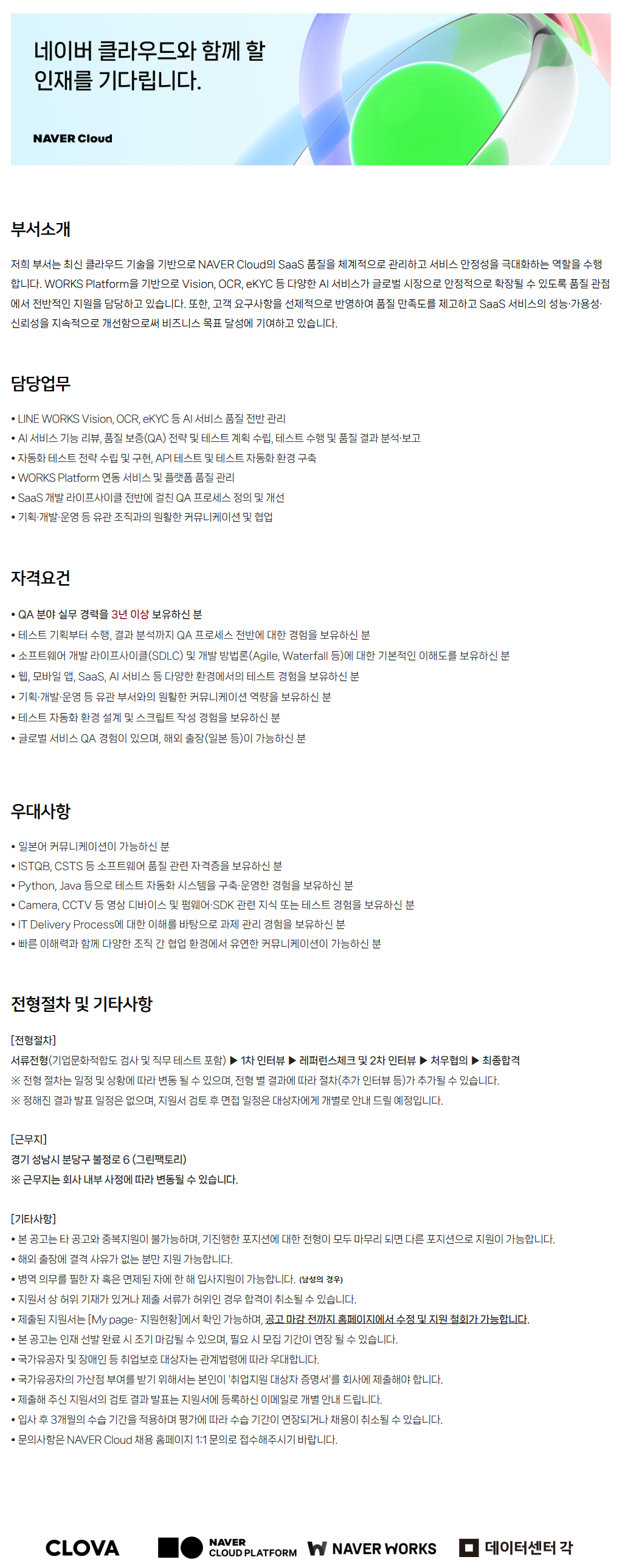 ÀúÈñ ºÎ¼´Â ÃֽŠŬ¶ó¿ìµå ±â¼úÀ» ±â¹ÝÀ¸·Î NAVER CloudÀÇ SaaS ǰÁúÀ» ü°èÀûÀ¸·Î °ü¸®ÇÏ°í ¼ºñ½º ¾ÈÁ¤¼ºÀ» ±Ø´ëÈÇÏ´Â ¿ªÇÒÀ» ¼öÇàÇÕ´Ï´Ù. WORKS PlatformÀ» ±â¹ÝÀ¸·Î Vision, OCR, eKYC µî ´Ù¾çÇÑ AI ¼ºñ½º°¡ ±Û·Î¹ú ½ÃÀåÀ¸·Î ¾ÈÁ¤ÀûÀ¸·Î È®ÀåµÉ ¼ö ÀÖµµ·Ï ǰÁú °üÁ¡¿¡¼ Àü¹ÝÀûÀÎ Áö¿øÀ» ´ã´çÇϰí ÀÖ½À´Ï´Ù. ¶ÇÇÑ, °í°´ ¿ä±¸»çÇ×À» ¼±Á¦ÀûÀ¸·Î ¹Ý¿µÇÏ¿© ǰÁú ¸¸Á·µµ¸¦ Á¦°íÇϰí SaaS ¼ºñ½ºÀÇ ¼º´É¡¤°¡¿ë¼º¡¤½Å·Ú¼ºÀ» Áö¼ÓÀûÀ¸·Î °³¼±ÇÔÀ¸·Î½á ºñÁî´Ï½º ¸ñÇ¥ ´Þ¼º¿¡ ±â¿©Çϰí ÀÖ½À´Ï´Ù.