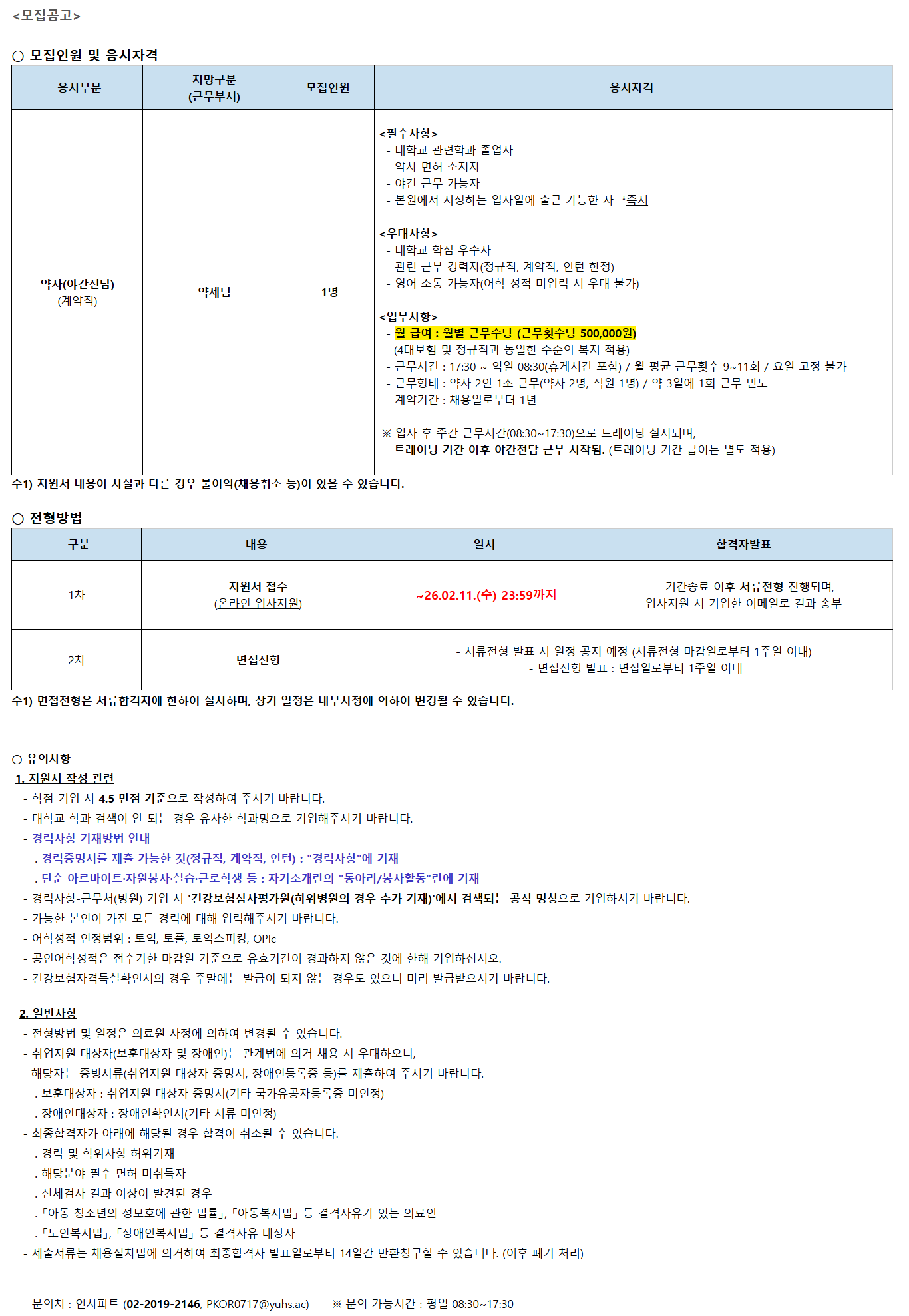 <¸ðÁý°ø°í> ¡Û ¸ðÁýÀοø ¹× ÀÀ½ÃÀÚ°Ý ÀÀ½ÃºÎ¹® Áö¸Á±¸ºÐ (±Ù¹«ºÎ¼­) ¸ðÁýÀοø ÀÀ½ÃÀÚ°Ý ¾à»ç(¾ß°£Àü´ã) (°è¾àÁ÷) ¾àÁ¦ÆÀ 1¸í <Çʼö»çÇ×> - ´ëÇб³ °ü·ÃÇаú Á¹¾÷ÀÚ - ¾à»ç ¸éÇã ¼ÒÁöÀÚ - ¾ß°£ ±Ù¹« °¡´ÉÀÚ - º»¿ø¿¡¼­ ÁöÁ¤ÇÏ´Â ÀÔ»çÀÏ¿¡ Ãâ±Ù °¡´ÉÇÑ ÀÚ *Áï½Ã <¿ì´ë»çÇ×> - ´ëÇб³ ÇÐÁ¡ ¿ì¼öÀÚ - °ü·Ã ±Ù¹« °æ·ÂÀÚ(Á¤±ÔÁ÷, °è¾àÁ÷, ÀÎÅÏ ÇÑÁ¤) - ¿µ¾î ¼ÒÅë °¡´ÉÀÚ(¾îÇÐ ¼ºÀû ¹ÌÀÔ·Â ½Ã ¿ì´ë ºÒ°¡) <¾÷¹«»çÇ×> - ¿ù ±Þ¿© : ¿ùº° ±Ù¹«¼ö´ç (±Ù¹«È½¼ö´ç 500,000¿ø) (4´ëº¸Çè ¹× Á¤±ÔÁ÷°ú µ¿ÀÏÇÑ ¼öÁØÀÇ º¹Áö Àû¿ë) - ±Ù¹«½Ã°£ : 17:30 ~ ÀÍÀÏ 08:30(ÈްԽð£ Æ÷ÇÔ) / ¿ù Æò±Õ ±Ù¹«È½¼ö 9~11ȸ / ¿äÀÏ °íÁ¤ ºÒ°¡ - ±Ù¹«ÇüÅ : ¾à»ç 2ÀÎ 1Á¶ ±Ù¹«(¾à»ç 2¸í, Á÷¿ø 1¸í) / ¾à 3ÀÏ¿¡ 1ȸ ±Ù¹« ºóµµ - °è¾à±â°£ : ä¿ëÀϷκÎÅÍ 1³â ¡Ø ÀÔ»ç ÈÄ ÁÖ°£ ±Ù¹«½Ã°£(08:30~17:30)À¸·Î Æ®·¹ÀÌ´× ½Ç½ÃµÇ¸ç, Æ®·¹ÀÌ´× ±â°£ ÀÌÈÄ ¾ß°£Àü´ã ±Ù¹« ½ÃÀÛµÊ. (Æ®·¹ÀÌ´× ±â°£ ±Þ¿©´Â º°µµ Àû¿ë) ÁÖ1) Áö¿ø¼­ ³»¿ëÀÌ »ç½Ç°ú ´Ù¸¥ °æ¿ì ºÒÀÌÀÍ(ä¿ëÃë¼Ò µî)ÀÌ ÀÖÀ» ¼ö ÀÖ½À´Ï´Ù. ¡Û ÀüÇü¹æ¹ý ±¸ºÐ ³»¿ë ÀϽà ÇÕ°ÝÀÚ¹ßÇ¥ 1Â÷ Áö¿ø¼­ Á¢¼ö (¿Â¶óÀÎ ÀÔ»çÁö¿ø) ~26.02.11.(¼ö) 23:59±îÁö - ±â°£Á¾·á ÀÌÈÄ ¼­·ùÀüÇü ÁøÇàµÇ¸ç, ÀÔ»çÁö¿ø ½Ã ±âÀÔÇÑ À̸ÞÀÏ·Î °á°ú ¼ÛºÎ 2Â÷ ¸éÁ¢ÀüÇü - ¼­·ùÀüÇü ¹ßÇ¥ ½Ã ÀÏÁ¤ °øÁö ¿¹Á¤ (¼­·ùÀüÇü ¸¶°¨ÀϷκÎÅÍ 1ÁÖÀÏ À̳») - ¸éÁ¢ÀüÇü ¹ßÇ¥ : ¸éÁ¢ÀϷκÎÅÍ 1ÁÖÀÏ À̳» ÁÖ1) ¸éÁ¢ÀüÇüÀº ¼­·ùÇÕ°ÝÀÚ¿¡ ÇÑÇÏ¿© ½Ç½ÃÇϸç, »ó±â ÀÏÁ¤Àº ³»ºÎ»çÁ¤¿¡ ÀÇÇÏ¿© º¯°æµÉ ¼ö ÀÖ½À´Ï´Ù. ¡Û À¯ÀÇ»çÇ× 1. Áö¿ø¼­ ÀÛ¼º °ü·Ã - ÇÐÁ¡ ±âÀÔ ½Ã 4.5 ¸¸Á¡ ±âÁØÀ¸·Î ÀÛ¼ºÇÏ¿© Áֽñ⠹ٶø´Ï´Ù. - ´ëÇб³ Çаú °Ë»öÀÌ ¾È µÇ´Â °æ¿ì À¯»çÇÑ Çаú¸íÀ¸·Î ±âÀÔÇØÁֽñ⠹ٶø´Ï´Ù. - °æ·Â»çÇ× ±âÀç¹æ¹ý ¾È³» . °æ·ÂÁõ¸í¼­¸¦ Á¦Ãâ °¡´ÉÇÑ °Í(Á¤±ÔÁ÷, °è¾àÁ÷, ÀÎÅÏ) : "°æ·Â»çÇ×"¿¡ ±âÀç . ´Ü¼ø ¾Æ¸£¹ÙÀÌÆ®¡¤ÀÚ¿øºÀ»ç¡¤½Ç½À¡¤±Ù·ÎÇлý µî : ÀÚ±â¼Ò°³¶õÀÇ "µ¿¾Æ¸®/ºÀ»çȰµ¿"¶õ¿¡ ±âÀç - °æ·Â»çÇ×-±Ù¹«Ã³(º´¿ø) ±âÀÔ ½Ã '°Ç°­º¸Çè½É»çÆò°¡¿ø(ÇÏÀ§º´¿øÀÇ °æ¿ì Ãß°¡ ±âÀç)'¿¡¼­ °Ë»öµÇ´Â °ø½Ä ¸íĪÀ¸·Î ±âÀÔÇϽñ⠹ٶø´Ï´Ù. - °¡´ÉÇÑ º»ÀÎÀÌ °¡Áø ¸ðµç °æ·Â¿¡ ´ëÇØ ÀÔ·ÂÇØÁֽñ⠹ٶø´Ï´Ù. - ¾îÇмºÀû ÀÎÁ¤¹üÀ§ : ÅäÀÍ, ÅäÇÃ, ÅäÀͽºÇÇÅ·, OPIc - °øÀξîÇмºÀûÀº Á¢¼ö±âÇÑ ¸¶°¨ÀÏ ±âÁØÀ¸·Î À¯È¿±â°£ÀÌ °æ°úÇÏÁö ¾ÊÀº °Í¿¡ ÇÑÇØ ±âÀÔÇϽʽÿÀ. - °Ç°­º¸ÇèÀڰݵæ½ÇÈ®Àμ­ÀÇ °æ¿ì ÁÖ¸»¿¡´Â ¹ß±ÞÀÌ µÇÁö ¾Ê´Â °æ¿ìµµ ÀÖÀ¸´Ï ¹Ì¸® ¹ß±Þ¹ÞÀ¸½Ã±â ¹Ù¶ø´Ï´Ù. 2. ÀϹݻçÇ× - ÀüÇü¹æ¹ý ¹× ÀÏÁ¤Àº ÀÇ·á¿ø »çÁ¤¿¡ ÀÇÇÏ¿© º¯°æµÉ ¼ö ÀÖ½À´Ï´Ù. - Ãë¾÷Áö¿ø ´ë»óÀÚ(º¸ÈÆ´ë»óÀÚ ¹× Àå¾ÖÀÎ)´Â °ü°è¹ý¿¡ ÀǰŠä¿ë ½Ã ¿ì´ëÇÏ¿À´Ï, ÇØ´çÀÚ´Â Áõºù¼­·ù(Ãë¾÷Áö¿ø ´ë»óÀÚ Áõ¸í¼­, Àå¾ÖÀεî·ÏÁõ µî)¸¦ Á¦ÃâÇÏ¿© Áֽñ⠹ٶø´Ï´Ù. . º¸ÈÆ´ë»óÀÚ : Ãë¾÷Áö¿ø ´ë»óÀÚ Áõ¸í¼­(±âŸ ±¹°¡À¯°øÀÚµî·ÏÁõ ¹ÌÀÎÁ¤) . Àå¾ÖÀδë»óÀÚ : Àå¾ÖÀÎÈ®Àμ­(±âŸ ¼­·ù ¹ÌÀÎÁ¤) - ÃÖÁ¾ÇÕ°ÝÀÚ°¡ ¾Æ·¡¿¡ ÇØ´çµÉ °æ¿ì ÇÕ°ÝÀÌ Ãë¼ÒµÉ ¼ö ÀÖ½À´Ï´Ù. . °æ·Â ¹× ÇÐÀ§»çÇ× ÇãÀ§±âÀç . ÇØ´çºÐ¾ß Çʼö ¸éÇã ¹ÌÃëµæÀÚ . ½Åü°Ë»ç °á°ú ÀÌ»óÀÌ ¹ß°ßµÈ °æ¿ì . ¡¸¾Æµ¿ û¼Ò³âÀÇ ¼ºº¸È£¿¡ °üÇÑ ¹ý·ü¡¹, ¡¸¾Æµ¿º¹Áö¹ý¡¹ µî °á°Ý»çÀ¯°¡ ÀÖ´Â ÀÇ·áÀÎ . ¡¸³ëÀκ¹Áö¹ý¡¹, ¡¸Àå¾ÖÀκ¹Áö¹ý¡¹ µî °á°Ý»çÀ¯ ´ë»óÀÚ - Á¦Ãâ¼­·ù´Â ä¿ëÀýÂ÷¹ý¿¡ ÀǰÅÇÏ¿© ÃÖÁ¾ÇÕ°ÝÀÚ ¹ßÇ¥ÀϷκÎÅÍ 14Àϰ£ ¹Ýȯû±¸ÇÒ ¼ö ÀÖ½À´Ï´Ù. (ÀÌÈÄ Æó±â ó¸®) - ¹®ÀÇó : ÀλçÆÄÆ® (***-****-****, ******@*******.***) ¡Ø ¹®ÀÇ °¡´É½Ã°£ : ÆòÀÏ 08:30~17:30