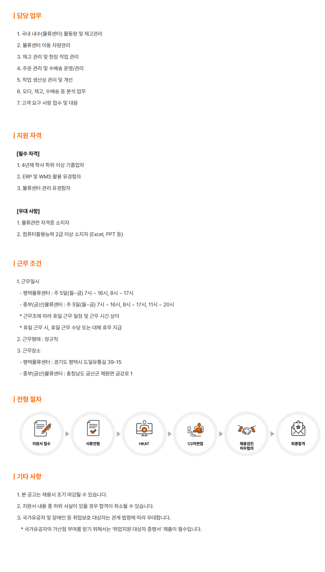 | ´ã´ç ¾÷¹« 1. ±¹³» ³»¼ö(¹°·ù¼¾ÅÍ) ¹°µ¿·® ¹× Àç°í°ü¸® 2. ¹°·ù¼¾ÅÍ À̵¿ Â÷·®°ü¸® 3. Àç°í °ü¸® ¹× ÇöÀå ÀÛ¾÷ °ü¸® 4. ÁÖ¹® °ü¸® ¹× ¼ö¹è¼Û ¿î¿µ/°ü¸® 5. ÀÛ¾÷ »ý»ê¼º °ü¸® ¹× °³¼± 6. ¿À´õ, Àç°í, ¼ö¹è¼Û µî ºÐ¼® ¾÷¹« 7. °í°´ ¿ä±¸ »çÇ× Á¢¼ö ¹× ´ëÀÀ | Áö¿ø ÀÚ°Ý [Çʼö ÀÚ°Ý] 1. 4³âÁ¦ Çлç ÇÐÀ§ ÀÌ»ó ±âÁ¹¾÷ÀÚ 2. ERP ¹× WMS Ȱ¿ë À¯°æÇèÀÚ 3. ¹°·ù¼¾ÅÍ °ü¸® À¯°æÇèÀÚ [¿ì´ë »çÇ×] 1. ¹°·ù°ü·Ã ÀÚ°ÝÁõ ¼ÒÁöÀÚ 2. ÄÄÇ»ÅÍȰ¿ë´É·Â 2±Þ ÀÌ»ó ¼ÒÁöÀÚ (Excel, PPT µî)