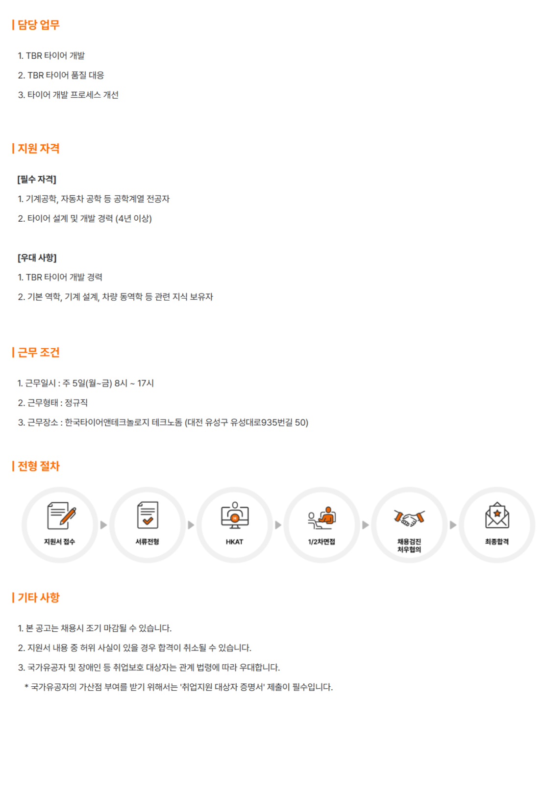 | ´ã´ç ¾÷¹« 1. TBR ŸÀÌ¾î °³¹ß 2. TBR ŸÀ̾î ǰÁú ´ëÀÀ 3. ŸÀÌ¾î °³¹ß ÇÁ·Î¼¼½º °³¼± | Áö¿ø ÀÚ°Ý [Çʼö ÀÚ°Ý] 1. ±â°è°øÇÐ, ÀÚµ¿Â÷ °øÇÐ µî °øÇа迭 Àü°øÀÚ 2. ŸÀÌ¾î ¼³°è ¹× °³¹ß °æ·Â (4³â ÀÌ»ó) [¿ì´ë »çÇ×] 1. TBR ŸÀÌ¾î °³¹ß °æ·Â 2. ±âº» ¿ªÇÐ, ±â°è ¼³°è, Â÷·® µ¿¿ªÇÐ µî °ü·Ã Áö½Ä º¸À¯ÀÚ | ±Ù¹« Á¶°Ç 1. ±Ù¹«ÀϽà : ÁÖ 5ÀÏ(¿ù~±Ý) 8½Ã ~ 17½Ã 2. ±Ù¹«ÇüÅ : Á¤±ÔÁ÷ 3. ±Ù¹«Àå¼Ò : Çѱ¹Å¸ÀÌ¾î¾ØÅ×Å©³î·ÎÁö Å×Å©³ëµ¼ (´ëÀü À¯¼º±¸ À¯¼º´ë·Î935¹ø±æ 50)