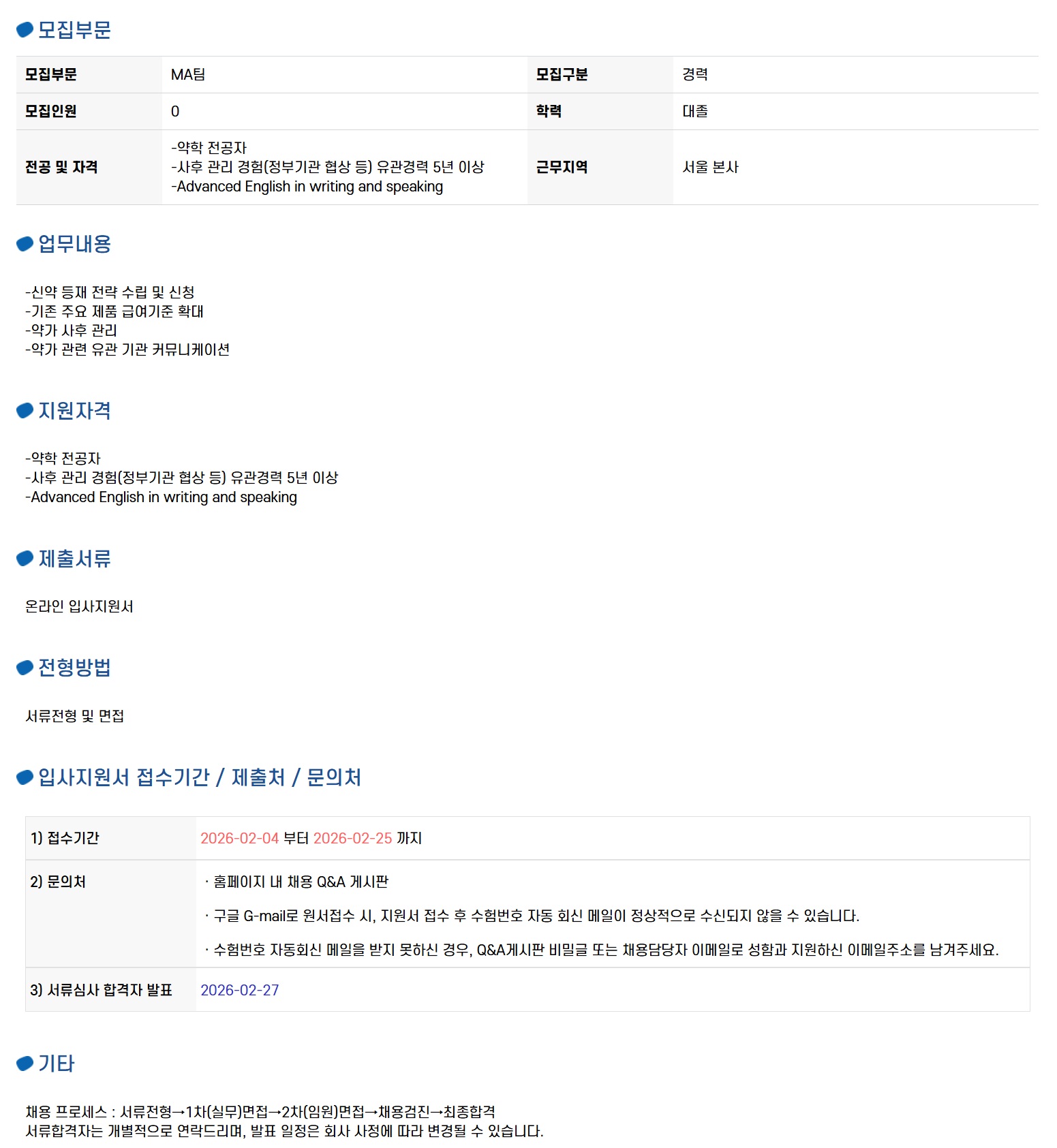 ¸ðÁýºÎ¹® ¸ðÁýºÎ¹® MAÆÀ ¸ðÁý±¸ºÐ °æ·Â ¸ðÁýÀοø 0 Çз ´ëÁ¹ Àü°ø ¹× ÀÚ°Ý -¾àÇÐ Àü°øÀÚ -»çÈÄ °ü¸® °æÇè(Á¤ºÎ±â°ü Çù»ó µî) À¯°ü°æ·Â 5³â ÀÌ»ó -Advanced English in writing and speaking ±Ù¹«Áö¿ª ¼¿ï º»»ç