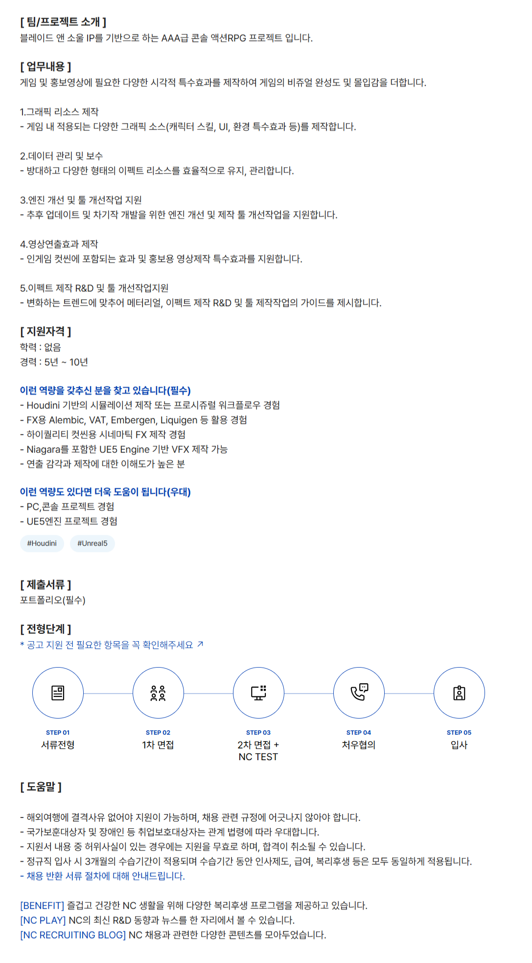[ ÆÀ/ÇÁ·ÎÁ§Æ® ¼Ò°³ ] ºí·¹ÀÌµå ¾Ø ¼Ò¿ï IP¸¦ ±â¹ÝÀ¸·Î ÇÏ´Â AAA±Þ ÄÜ¼Ö ¾×¼ÇRPG ÇÁ·ÎÁ§Æ® ÀÔ´Ï´Ù. [ ¾÷¹«³»¿ë ] °ÔÀÓ ¹× È«º¸¿µ»ó¿¡ ÇÊ¿äÇÑ ´Ù¾çÇÑ ½Ã°¢Àû Ư¼öÈ¿°ú¸¦ Á¦ÀÛÇÏ¿© °ÔÀÓÀÇ ºñÁê¾ó ¿Ï¼ºµµ ¹× ¸ôÀÔ°¨À» ´õÇÕ´Ï´Ù. 1.±×·¡ÇÈ ¸®¼Ò½º Á¦ÀÛ - °ÔÀÓ ³» Àû¿ëµÇ´Â ´Ù¾çÇÑ ±×·¡ÇÈ ¼Ò½º(ij¸¯ÅÍ ½ºÅ³, UI, ȯ°æ Ư¼öÈ¿°ú µî)¸¦ Á¦ÀÛÇÕ´Ï´Ù. 2.µ¥ÀÌÅÍ °ü¸® ¹× º¸¼ö - ¹æ´ëÇÏ°í ´Ù¾çÇÑ ÇüÅÂÀÇ ÀÌÆåÆ® ¸®¼Ò½º¸¦ È¿À²ÀûÀ¸·Î À¯Áö, °ü¸®ÇÕ´Ï´Ù. 3.¿£Áø °³¼± ¹× Åø °³¼±ÀÛ¾÷ Áö¿ø - ÃßÈÄ ¾÷µ¥ÀÌÆ® ¹× Â÷±âÀÛ °³¹ßÀ» À§ÇÑ ¿£Áø °³¼± ¹× Á¦ÀÛ Åø °³¼±ÀÛ¾÷À» Áö¿øÇÕ´Ï´Ù. 4.¿µ»ó¿¬ÃâÈ¿°ú Á¦ÀÛ - ÀΰÔÀÓ ÄÆ¾À¿¡ Æ÷ÇԵǴ ȿ°ú ¹× È«º¸¿ë ¿µ»óÁ¦ÀÛ Æ¯¼öÈ¿°ú¸¦ Áö¿øÇÕ´Ï´Ù. 5.ÀÌÆåÆ® Á¦ÀÛ R&D ¹× Åø °³¼±ÀÛ¾÷Áö¿ø - º¯È­ÇÏ´Â Æ®·»µå¿¡ ¸ÂÃß¾î ¸ÞÅ͸®¾ó, ÀÌÆåÆ® Á¦ÀÛ R&D ¹× Åø Á¦ÀÛÀÛ¾÷ÀÇ °¡À̵带 Á¦½ÃÇÕ´Ï´Ù. [ Áö¿øÀÚ°Ý ] Çз : ¾øÀ½ °æ·Â : 5³â ~ 10³â ÀÌ·± ¿ª·®À» °®Ã߽ŠºÐÀ» ã°í ÀÖ½À´Ï´Ù(Çʼö) - Houdini ±â¹ÝÀÇ ½Ã¹Ä·¹ÀÌ¼Ç Á¦ÀÛ ¶Ç´Â ÇÁ·Î½ÃÁê·² ¿öÅ©ÇÃ·Î¿ì °æÇè - FX¿ë Alembic, VAT, Embergen, Liquigen µî Ȱ¿ë °æÇè - ÇÏÀÌÄ÷¸®Æ¼ ÄÆ¾À¿ë ½Ã³×¸¶Æ½ FX Á¦ÀÛ °æÇè - Niagara¸¦ Æ÷ÇÔÇÑ UE5 Engine ±â¹Ý VFX Á¦ÀÛ °¡´É - ¿¬Ãâ °¨°¢°ú Á¦ÀÛ¿¡ ´ëÇÑ ÀÌÇØµµ°¡ ³ôÀº ºÐ