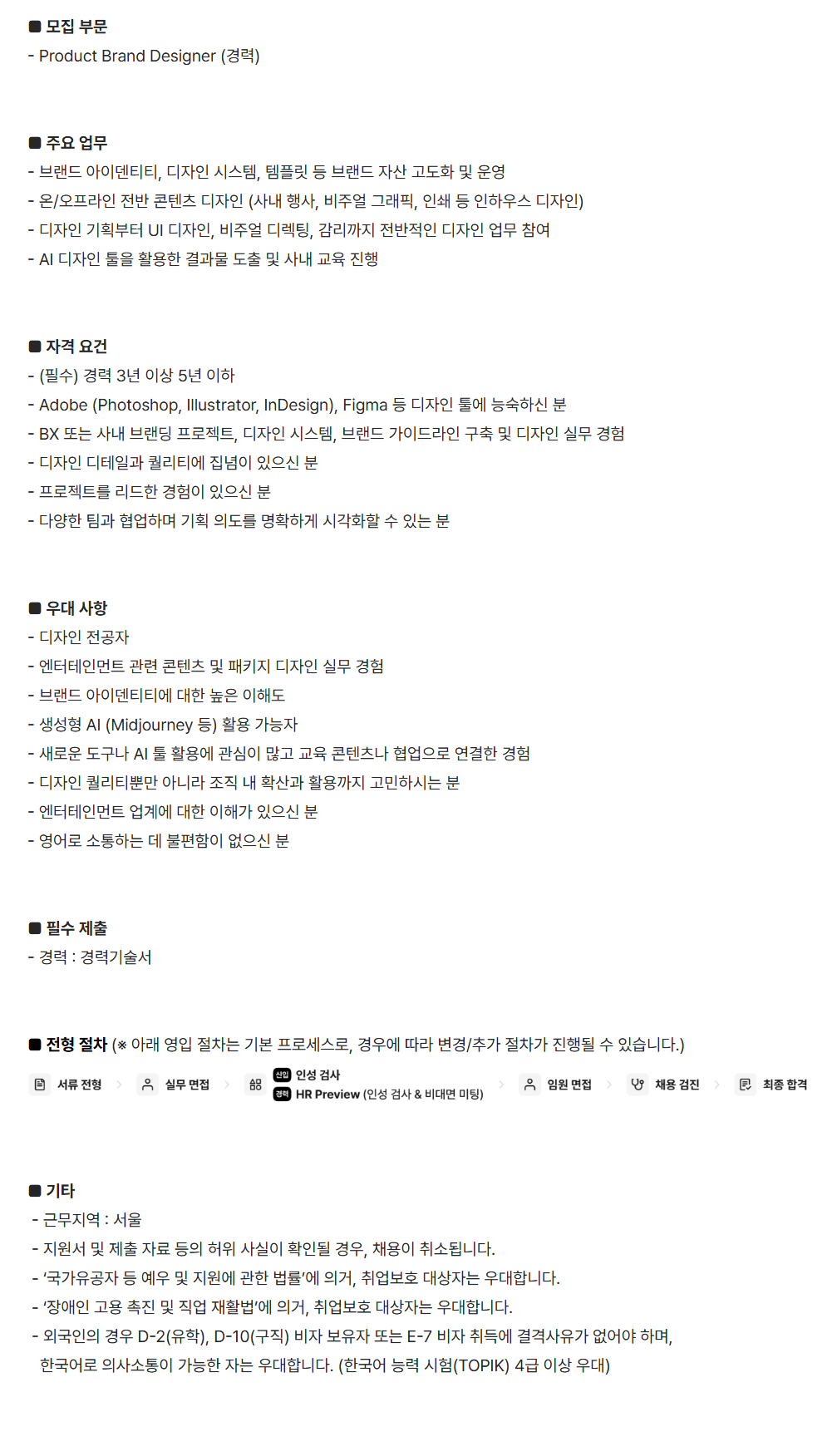 [JYP ENTERTAINMENT] Product Brand Designer (°æ·Â) ¡á ¸ðÁý ​ºÎ¹® - Product ​Brand ​Designer (°æ·Â) ¡á ​ÁÖ¿ä ¾÷¹« - ºê·£µå ¾ÆÀ̵§Æ¼Æ¼, µðÀÚÀÎ ​½Ã½ºÅÛ, ​ÅÛÇø´ µî ​ºê·£µå ÀÚ»ê °íµµÈ­ ​¹× ¿î¿µ - ¿Â/¿ÀÇÁ¶óÀÎ ​Àü¹Ý ​ÄÜÅÙÃ÷ µðÀÚÀÎ ​(»ç³» ​Çà»ç, ​ºñÁÖ¾ó ±×·¡ÇÈ, Àμâ ​µî ​ÀÎÇϿ콺 µðÀÚÀÎ) - µðÀÚÀÎ ±âȹºÎÅÍ ​UI ​µðÀÚÀÎ, ​ºñÁÖ¾ó µð·ºÆÃ, °¨¸®±îÁö ​Àü¹ÝÀûÀÎ µðÀÚÀÎ ​¾÷¹« ​Âü¿© - AI µðÀÚÀÎ ​ÅøÀ» Ȱ¿ëÇÑ ​°á°ú¹° ​µµÃâ ¹× »ç³» ​±³À° ÁøÇà ​ ¡á ÀÚ°Ý ¿ä°Ç - (Çʼö) °æ·Â 3³â ÀÌ»ó 5³â ÀÌÇÏ - Adobe (Photoshop, Illustrator, InDesign), Figma µî µðÀÚÀÎ Åø¿¡ ´É¼÷ÇϽŠºÐ - BX ¶Ç´Â »ç³» ºê·£µù ÇÁ·ÎÁ§Æ®, µðÀÚÀÎ ½Ã½ºÅÛ, ºê·£µå °¡À̵å¶óÀÎ ±¸Ãà ¹× µðÀÚÀÎ ½Ç¹« °æÇè - µðÀÚÀÎ µðÅ×Àϰú Ä÷¸®Æ¼¿¡ Áý³äÀÌ ÀÖÀ¸½Å ºÐ - ÇÁ·ÎÁ§Æ®¸¦ ¸®µåÇÑ °æÇèÀÌ ÀÖÀ¸½Å ºÐ - ´Ù¾çÇÑ ÆÀ°ú Çù¾÷ÇÏ¸ç ±âȹ Àǵµ¸¦ ¸íÈ®ÇÏ°Ô ½Ã°¢È­ÇÒ ¼ö ÀÖ´Â ºÐ ¡á ¿ì´ë »çÇ× - µðÀÚÀÎ Àü°øÀÚ - ¿£ÅÍÅ×ÀÎ¸ÕÆ® °ü·Ã ÄÜÅÙÃ÷ ¹× ÆÐŰÁö µðÀÚÀÎ ½Ç¹« °æÇè - ºê·£µå ¾ÆÀ̵§Æ¼Æ¼¿¡ ´ëÇÑ ³ôÀº ÀÌÇØµµ - »ý¼ºÇü AI (Midjourney µî) Ȱ¿ë °¡´ÉÀÚ - »õ·Î¿î µµ±¸³ª AI Åø Ȱ¿ë¿¡ °ü½ÉÀÌ ¸¹°í ±³À° ÄÜÅÙÃ÷³ª Çù¾÷À¸·Î ¿¬°áÇÑ °æÇè - µðÀÚÀÎ Ä÷¸®Æ¼»Ó¸¸ ¾Æ´Ï¶ó Á¶Á÷ ³» È®»ê°ú Ȱ¿ë±îÁö °í¹ÎÇϽô ºÐ - ¿£ÅÍÅ×ÀÎ¸ÕÆ® ¾÷°è¿¡ ´ëÇÑ ÀÌÇØ°¡ ÀÖÀ¸½Å ºÐ - ¿µ¾î·Î ¼ÒÅëÇÏ´Â µ¥ ºÒÆíÇÔÀÌ ¾øÀ¸½Å ºÐ ¡á Çʼö Á¦Ãâ - °æ·Â : °æ·Â±â¼ú¼­