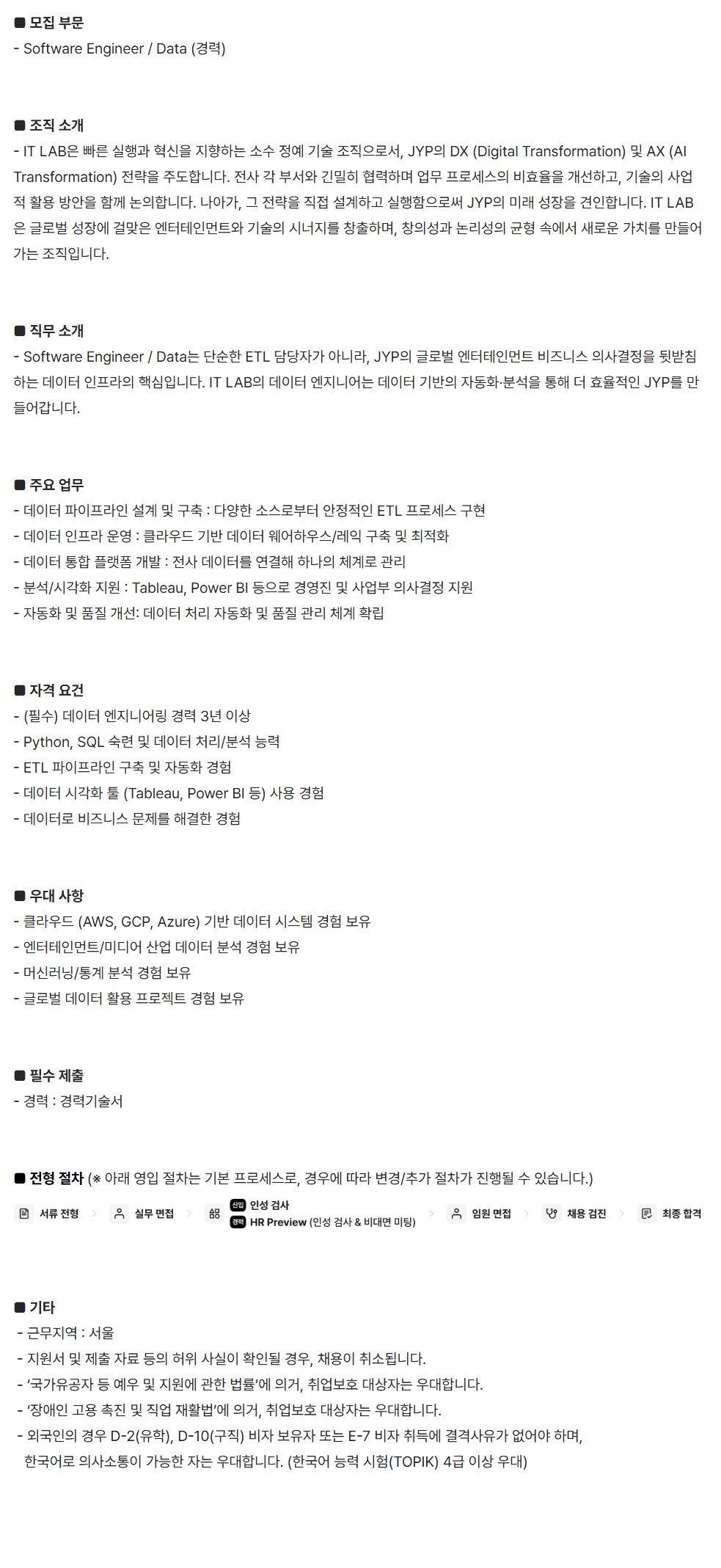 [JYP ENTERTAINMENT] Software ​Engineer ​/ Data (°æ·Â) ¡á ¸ðÁý ​ºÎ¹® - Software ​Engineer ​/ Data ​(°æ·Â) ¡á Á¶Á÷ ¼Ò°³ - IT ​LABÀº ​ºü¸¥ ½ÇÇà°ú ​Çõ½ÅÀ» ÁöÇâÇÏ´Â ¼Ò¼ö ​Á¤¿¹ ±â¼ú ​Á¶Á÷À¸·Î¼­, ​JYPÀÇ DX ​(Digital ​Transformation) ​¹× AX (AI ​Transformation) ​Àü·«À» ÁÖµµÇÕ´Ï´Ù. Àü»ç ​°¢ ​ºÎ¼­¿Í ​±ä¹ÐÈ÷ Çù·ÂÇÏ¸ç ¾÷¹« ​ÇÁ·Î¼¼½ºÀÇ ºñÈ¿À²À» ​°³¼±Çϰí, ​±â¼úÀÇ »ç¾÷Àû ​Ȱ¿ë ¹æ¾ÈÀ» ​ÇÔ²² ​³íÀÇÇÕ´Ï´Ù. ³ª¾Æ°¡, ±× ​Àü·«À» Á÷Á¢ ​¼³°èÇÏ°í ½ÇÇàÇÔÀ¸·Î½á JYPÀÇ ¹Ì·¡ ¼ºÀåÀ» °ßÀÎÇÕ´Ï´Ù. IT LABÀº ±Û·Î¹ú ¼ºÀå¿¡ °É¸ÂÀº ¿£ÅÍÅ×ÀÎ¸ÕÆ®¿Í ±â¼úÀÇ ½Ã³ÊÁö¸¦ âÃâÇϸç, âÀǼº°ú ³í¸®¼ºÀÇ ±ÕÇü ¼Ó¿¡¼­ »õ·Î¿î °¡Ä¡¸¦ ¸¸µé¾î°¡´Â Á¶Á÷ÀÔ´Ï´Ù. ¡á Á÷¹« ¼Ò°³ - Software Engineer / Data´Â ´Ü¼øÇÑ ETL ´ã´çÀÚ°¡ ¾Æ´Ï¶ó, JYPÀÇ ±Û·Î¹ú ¿£ÅÍÅ×ÀÎ¸ÕÆ® ºñÁî´Ï½º ÀÇ»ç°áÁ¤À» µÞ¹ÞħÇÏ´Â µ¥ÀÌÅÍ ÀÎÇÁ¶óÀÇ ÇÙ½ÉÀÔ´Ï´Ù. IT LABÀÇ µ¥ÀÌÅÍ ¿£Áö´Ï¾î´Â µ¥ÀÌÅÍ ±â¹ÝÀÇ ÀÚµ¿È­¡¤ºÐ¼®À» ÅëÇØ ´õ È¿À²ÀûÀÎ JYP¸¦ ¸¸µé¾î°©´Ï´Ù. ¡á ÁÖ¿ä ¾÷¹« - µ¥ÀÌÅÍ ÆÄÀÌÇÁ¶óÀÎ ¼³°è ¹× ±¸Ãà : ´Ù¾çÇÑ ¼Ò½º·ÎºÎÅÍ ¾ÈÁ¤ÀûÀÎ ETL ÇÁ·Î¼¼½º ±¸Çö - µ¥ÀÌÅÍ ÀÎÇÁ¶ó ¿î¿µ : Ŭ¶ó¿ìµå ±â¹Ý µ¥ÀÌÅÍ ¿þ¾îÇϿ콺/·¹ÀÍ ±¸Ãà ¹× ÃÖÀûÈ­ - µ¥ÀÌÅÍ ÅëÇÕ Ç÷§Æû °³¹ß : Àü»ç µ¥ÀÌÅ͸¦ ¿¬°áÇØ ÇϳªÀÇ Ã¼°è·Î °ü¸® - ºÐ¼®/½Ã°¢È­ Áö¿ø : Tableau, Power BI µîÀ¸·Î °æ¿µÁø ¹× »ç¾÷ºÎ ÀÇ»ç°áÁ¤ Áö¿ø - ÀÚµ¿È­ ¹× ǰÁú °³¼±: µ¥ÀÌÅÍ Ã³¸® ÀÚµ¿È­ ¹× ǰÁú °ü¸® ü°è È®¸³ ¡á ÀÚ°Ý ¿ä°Ç - (Çʼö) µ¥ÀÌÅÍ ¿£Áö´Ï¾î¸µ °æ·Â 3³â ÀÌ»ó - Python, SQL ¼÷·Ã ¹× µ¥ÀÌÅÍ Ã³¸®/ºÐ¼® ´É·Â - ETL ÆÄÀÌÇÁ¶óÀÎ ±¸Ãà ¹× ÀÚµ¿È­ °æÇè - µ¥ÀÌÅÍ ½Ã°¢È­ Åø (Tableau, Power BI µî) »ç¿ë °æÇè - µ¥ÀÌÅÍ·Î ºñÁî´Ï½º ¹®Á¦¸¦ ÇØ°áÇÑ °æÇè ¡á ¿ì´ë »çÇ× - Ŭ¶ó¿ìµå (AWS, GCP, Azure) ±â¹Ý µ¥ÀÌÅÍ ½Ã½ºÅÛ °æÇè º¸À¯ - ¿£ÅÍÅ×ÀÎ¸ÕÆ®/¹Ìµð¾î »ê¾÷ µ¥ÀÌÅÍ ºÐ¼® °æÇè º¸À¯ - ¸Ó½Å·¯´×/Åë°è ºÐ¼® °æÇè º¸À¯ - ±Û·Î¹ú µ¥ÀÌÅÍ È°¿ë ÇÁ·ÎÁ§Æ® °æÇè º¸À¯ ¡á Çʼö Á¦Ãâ - °æ·Â : °æ·Â±â¼ú¼­