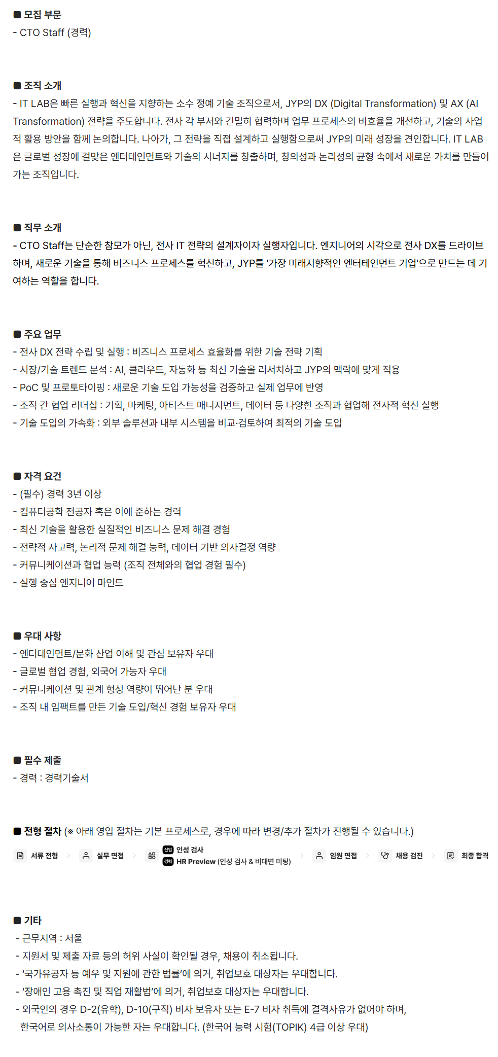 - CTO Staff´Â ´Ü¼øÇÑ Âü¸ð°¡ ¾Æ´Ñ, Àü»ç IT Àü·«ÀÇ ¼³°èÀÚÀÌÀÚ ½ÇÇàÀÚÀÔ´Ï´Ù. ¿£Áö´Ï¾îÀÇ ½Ã°¢À¸·Î Àü»ç DX¸¦ µå¶óÀ̺êÇϸç, »õ·Î¿î ±â¼úÀ» ÅëÇØ ºñÁî´Ï½º ÇÁ·Î¼¼½º¸¦ Çõ½ÅÇϰí, JYP¸¦ '°¡Àå ¹Ì·¡ÁöÇâÀûÀÎ ¿£ÅÍÅ×ÀÎ¸ÕÆ® ±â¾÷'À¸·Î ¸¸µå´Â µ¥ ±â¿©ÇÏ´Â ¿ªÇÒÀ» ÇÕ´Ï´Ù.