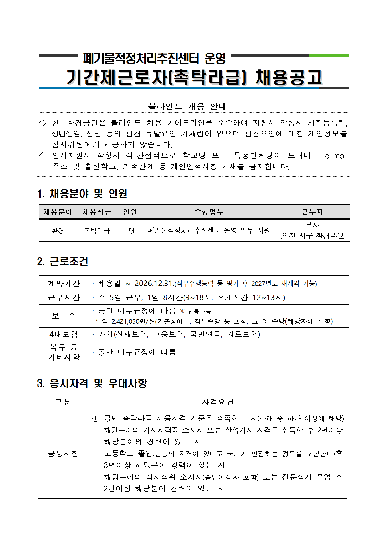 Çѱ¹È¯°æ°ø´Ü(º»»ç) Æó±â¹°ÀûÁ¤Ã³¸®ÃßÁø¼¾ÅÍ ¿î¿µ ±â°£Á¦±Ù·ÎÀÚ Ã¤¿ë°ø°í