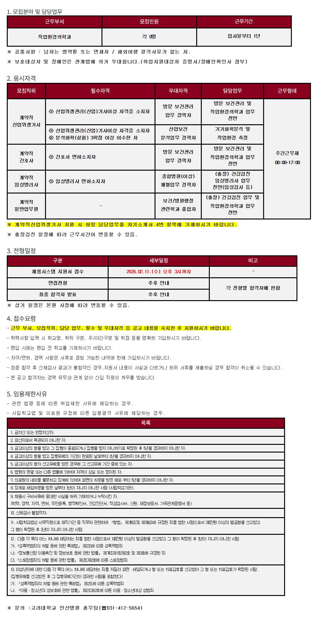 [¾È»êº´¿ø25-241] Á÷¾÷ȯ°æÀÇÇаú °è¾àÁ÷»ê¾÷À§»ý±â»ç/°è¾àÁ÷°£È£»ç/°è¾àÁ÷ÀÓ»óº´¸®»ç/°è¾àÁ÷ÀϹݾ÷¹«¿ø ¸ðÁý 1. ¸ðÁýºÐ¾ß ¹× ´ã´ç¾÷¹« ±Ù¹«ºÎ¼­ ¸ðÁýÀοø ±Ù¹«±â°£ Á÷¾÷ȯ°æÀÇÇаú °¢ 0¸í ÀÔ»çÀϺÎÅÍ 1³â ¡Ø °øÅë»çÇ× : ³²ÀÚ´Â º´¿ªÇÊ ¶Ç´Â ¸éÁ¦ÀÚ / ÇØ¿Ü¿©Çà °á°Ý»çÀ¯°¡ ¾ø´Â ÀÚ. ¡Ø º¸ÈÆ´ë»óÀÚ ¹× Àå¾ÖÀÎÀº °ü°è¹ý¿¡ ÀǰŠ¿ì´ëÇÕ´Ï´Ù.(Ãë¾÷Áö¿ø´ë»óÀÚ Áõ¸í¼­/Àå¾ÖÀÎÈ®Àμ­ ÷ºÎ) 2. ÀÀ½ÃÀÚ°Ý ¸ðÁýÁ÷À§ ÇʼöÀÚ°Ý ¿ì´ëÀÚ°Ý ´ã´ç¾÷¹« ±Ù¹«ÇüÅ °è¾àÁ÷ »ê¾÷À§»ý±â»ç ¨ç »ê¾÷À§»ý°ü¸®(»ê¾÷)±â»çÀÌ»ó ÀÚ°ÝÁõ ¼ÒÁöÀÚ ¹æ¹® º¸°Ç°ü¸® ¾÷¹« °æ·ÂÀÚ ¹æ¹® º¸°Ç°ü¸® ¹× Á÷¾÷ȯ°æÀÇÇаú ¾÷¹« Àü¹Ý ÁÖ°£±Ù¹«Á¦ 08:00~17:00 ¨ç »ê¾÷À§»ý°ü¸®(»ê¾÷)±â»çÀÌ»ó ÀÚ°ÝÁõ ¼ÒÁöÀÚ ¨è ºÐ¼®È­ÇÐ(½ÇÇè) 3ÇÐÁ¡ ÀÌ»ó À̼öÇÑ ÀÚ »ê¾÷º¸°Ç ºÐ¼®¾÷¹« °æ·ÂÀÚ ±â±âÈ­Çкм® ¹× ÀÛ¾÷ȯ°æ ÃøÁ¤ °è¾àÁ÷ °£È£»ç ¨ç °£È£»ç ¸éÇã¼ÒÁöÀÚ ¹æ¹® º¸°Ç°ü¸® ¾÷¹« °æ·ÂÀÚ ¹æ¹® º¸°Ç°ü¸® ¹× Á÷¾÷ȯ°æÀÇÇаú ¾÷¹« Àü¹Ý °è¾àÁ÷ ÀÓ»óº´¸®»ç ¨ç ÀÓ»óº´¸®»ç ¸éÇã¼ÒÁöÀÚ Á¾ÇÕº´¿ø(ÀÌ»ó) äÇ÷¾÷¹« °æ·ÂÀÚ (ÃâÀå) °Ç°­°ËÁø ÀÓ»óº´¸®»ç ¾÷¹« Àü¹Ý(ÀÓ»ó°Ë»ç µî) °è¾àÁ÷ ÀϹݾ÷¹«¿ø - º¸°Ç/º´¿øÇàÁ¤ °ü·ÃÇаú Á¹¾÷ÀÚ (ÃâÀå) °Ç°­°ËÁø ¾÷¹« ¹× Á÷¾÷ȯ°æÀÇÇаú ¾÷¹« Àü¹Ý ¡Ø °è¾àÁ÷»ê¾÷À§»ý±â»ç Áö¿ø ½Ã Èñ¸Á ´ã´ç¾÷¹«¸¦ ÀÚ±â¼Ò°³¼­ 4¹ø Ç׸ñ¿¡ ±âÀçÇϽñ⠹ٶø´Ï´Ù. ¡Ø ÃâÀå°ËÁø ÀÏÁ¤¿¡ µû¶ó ±Ù¹«½Ã°£ÀÌ º¯µ¿µÉ ¼ö ÀÖÀ½. 3. ÀüÇüÀÏÁ¤ ±¸ºÐ ¼¼ºÎÀÏÁ¤ ºñ°í ä¿ë½Ã½ºÅÛ Áö¿ø¼­ Á¢¼ö 2026.02.11.(¼ö) ¿ÀÈÄ 3½Ã±îÁö - ¸éÁ¢ÀüÇü ÃßÈÄ ¾È³» °¢ ÀüÇüº° ÇÕ°ÝÀÚ¿¡ ÇÑÇÔ ÃÖÁ¾ ÇÕ°ÝÀÚ ¹ßÇ¥ ÃßÈÄ ¾È³» ¡Ø »ó±â ÀÏÁ¤Àº º»¿ø »çÁ¤¿¡ µû¶ó º¯µ¿µÉ ¼ö ÀÖÀ½. 4. Á¢¼ö¿ä·É - ±Ù¹« ºÎ¼­, ¸ðÁýÁ÷À§, ´ã´ç ¾÷¹«, Çʼö ¹× ¿ì´ëÀÚ°Ý µî °ø°í ³»¿ëÀ» ¼÷ÁöÇÑ ÈÄ Áö¿øÇϽñ⠹ٶø´Ï´Ù. - Çз»çÇ× ÀÔ·Â ½Ã Çб³¸í, ÇÐÀ§ ±¸ºÐ, ÁÖ/¾ß°£±¸ºÐ ¹× ÇÐÁ¡ µîÀ» ¸íÈ®È÷ ±âÀÔÇϽñ⠹ٶø´Ï´Ù. - ÆíÀÔ ½Ã¿¡´Â ÆíÀÔ Àü Çб³¸¦ ±âÀçÇϽñ⠹ٶø´Ï´Ù. - ÀÚ°Ý/¸éÇã, °æ·Â »çÇ×Àº ¼­·ù·Î Áõºù °¡´ÉÇÑ ³»¿ª¿¡ ÇÑÇØ ±âÀÔÇϽñ⠹ٶø´Ï´Ù. - ÃÖÁ¾ ÇÕ°Ý ÈÄ ½Åü°Ë»ç °á°ú°¡ ºÒÇÕ°ÝÀÎ °æ¿ì,Áö¿ø¼­ ³»¿ëÀÌ »ç½Ç°ú ´Ù¸£°Å³ª ÇãÀ§ ¼­·ù¸¦ Á¦ÃâÇÏ½Ç °æ¿ì ÇÕ°ÝÀÌ Ãë¼ÒµÉ ¼ö ÀÖ½À´Ï´Ù. - º» °ø°í ÇÕ°ÝÀÚ´Â °æ·Â À¯¹«¿Í °ü°è ¾øÀÌ ½ÅÀÔ Á÷¿øÀÇ Ã³¿ì¸¦ ¹Þ½À´Ï´Ù. 5. ÀÓ¿ëÁ¦ÇÑ»çÀ¯ - °ü·Ã ¹ý·É µî¿¡ µû¸¥ Ãë¾÷Á¦ÇÑ »çÀ¯¿¡ ÇØ´çÇÏ´Â °æ¿ì. - »ç¸³Çб³¹ý ¹× ÀÇ·á¿ø ±ÔÁ¤¿¡ µû¸¥ ÀÓ¿ë°á°Ý »çÀ¯¿¡ ÇØ´çÇÏ´Â °æ¿ì. ¸ñ·Ï 1. ±ÝÄ¡»ê ¶Ç´Â ÇÑÁ¤Ä¡»êÀÚ. 2. ÆÄ»êÀڷμ­ º¹±ÇµÇÁö ¾Æ´ÏÇÑ ÀÚ. 3. ±Ý°íÀÌ»óÀÇ ÇüÀ» ¹Þ°í ±× ÁýÇàÀÌ Á¾·áµÇ°Å³ª ÁýÇàÀ» ¹ÞÁö ¾Æ´ÏÇϱâ·Î È®Á¤µÈ ÈÄ 5³âÀ» °æ°úÇÏÁö ¾Æ´ÏÇÑ ÀÚ. 4. ±Ý°íÀÌ»óÀÇ ÇüÀ» ¹Þ°í ÁýÇàÀ¯¿¹ÀÇ ±â°£ÀÌ ¿Ï·áµÈ ³¯·ÎºÎÅÍ 2³âÀ» °æ°úÇÏÁö ¾Æ´ÏÇÑ ÀÚ. 5. ±Ý°íÀÌ»óÀÇ ÇüÀÇ ¼±°íÀ¯¿¹¸¦ ¹ÞÀº °æ¿ì¿¡ ±× ¼±°íÀ¯¿¹ ±â°£ Áß¿¡ ÀÖ´Â ÀÚ. 6. ¹ý¿øÀÇ ÆÇ°á ¶Ç´Â ´Ù¸¥ ¹ý·ü¿¡ ÀÇÇÏ¿© ÀÚ°ÝÀÌ »ó½Ç ¶Ç´Â Á¤ÁöµÈ ÀÚ. 7. ÀÇ·á¿øÀÇ ³»¿Ü¸¦ ºÒ¹®Çϰí ¡°è¿¡ ÀÇÇÏ¿© ÆÄ¸éÀÇ Ã³ºÐÀ» ¹ÞÀº ¶§·Î ºÎÅÍ 5³âÀ» °æ°úÇÏÁö ¾Æ´ÏÇÑ ÀÚ. 8. ¡°è·Î ÇØÀÓóºÐÀ» ¹ÞÀº ³¯ºÎÅÍ 3³âÀÌ Áö³ªÁö ¾Æ´ÏÇÑ »ç¶÷ (»ç¸³Çб³±â°ü). 9. ä¿ë½Ã ±¸ºñ¼­·ù¿¡ Áß´ëÇÑ »ç½ÇÀ» ÇãÀ§ ±âÀçÇϰųª ´©¶ô½ÃŲ ÀÚ. (ÇзÂ, °æ·Â, ÀÚ°Ý, ¸éÇã, Áֹεî·Ï, º´ÀûÈ®Àμ­, °Ç°­Áø´Ü¼­, Àû¼º°Ë»ç¼­, ½Å¿ø, ÀçÁ¤º¸Áõ¼­, °¡Á·°ü°èÁõ¸í¼­ µî) 10. ½Åü°Ë»ç ºÒÇÕ°ÝÀÚ. 11. »ç¸³Çб³¹ý»ó »ç¹«Á÷¿øÀ¸·Î ÀçÁ÷±â°£ Áß Á÷¹«¿Í °ü·ÃÇÏ¿© ¡¸Çü¹ý¡¹ Á¦355Á¶¹× Á¦356Á¶¿¡ ±ÔÁ¤µÈ Á˸¦ ¹üÇÑ »ç¶÷À¸·Î¼­ 300¸¸¿ø ÀÌ»óÀÇ ¹ú±ÝÇüÀ» ¼±°í¹Þ°í ±× ÇüÀÌ È®Á¤µÈ ÈÄ 2³âÀÌ Áö³ªÁö ¾Æ´ÏÇÑ »ç¶÷. 12 . ´ÙÀ½ °¢ ¸ñÀÇ ¾î´À Çϳª¿¡ ÇØ´çÇÏ´Â Á˸¦ ¹üÇÑ »ç¶÷À¸·Î¼­ 100¸¸¿ø ÀÌ»óÀÇ ¹ú±ÝÇüÀ» ¼±°í¹Þ°í ±× ÇüÀÌ È®Á¤µÈ ÈÄ 3³âÀÌ Áö³ªÁö ¾Æ´ÏÇÑ »ç¶÷. °¡.¡¸¼ºÆø·Â¹üÁËÀÇ Ã³¹ú µî¿¡ °üÇÑ Æ¯·Ê¹ý¡¹ Á¦2Á¶¿¡ µû¸¥ ¼ºÆø·Â¹üÁË ³ª.¡¸Á¤º¸Åë½Å¸Á ÀÌ¿ëÃËÁø ¹× Á¤º¸º¸È£ µî¿¡ °üÇÑ ¹ý·ü¡¹ Á¦74Á¶Á¦1Ç×Á¦2È£ ¹× Á¦3È£¿¡ ±ÔÁ¤µÈ ÁË ´Ù.¡¸½ºÅäÅ·¹üÁËÀÇ Ã³¹ú µî¿¡ °üÇÑ ¹ý·ü¡¹ Á¦2Á¶Á¦2È£¿¡ µû¸¥ ½ºÅäÅ·¹üÁË 13. ¹Ì¼º³âÀÚ¿¡ ´ëÇÑ ´ÙÀ½ °¢ ¸ñÀÇ ¾î´À Çϳª¿¡ ÇØ´çÇÏ´Â Á˸¦ 