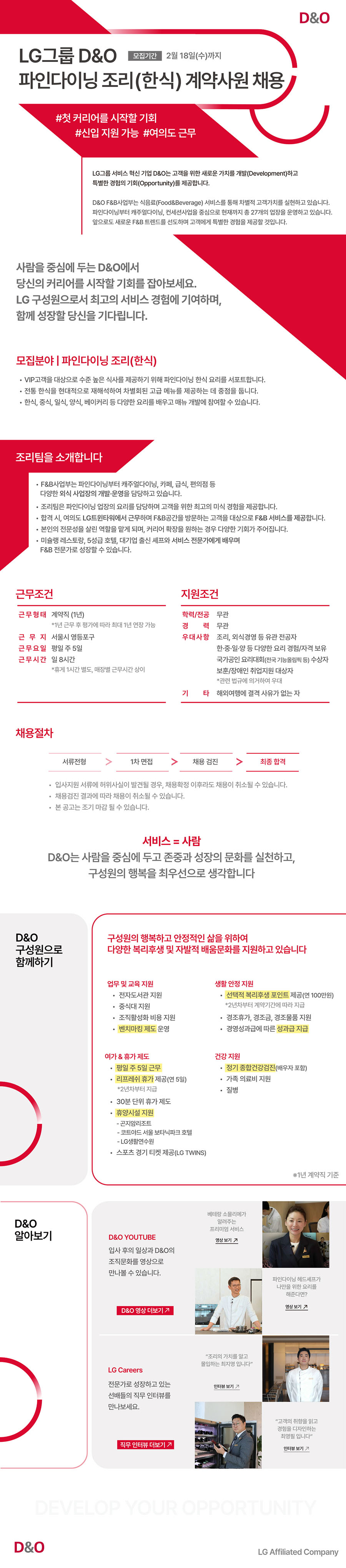 D&O LG±×·ì D&O ¸ðÁý±â°£ 2¿ù 18ÀÏ(¼ö)±îÁö ÆÄÀδÙÀÌ´× Á¶¸® (ÇѽÄ) °è¾à»ç¿ø ä¿ë #ù Ä¿¸®¾î¸¦ ½ÃÀÛÇÒ ±âȸ #½ÅÀÔ Áö¿ø °¡´É #¿©Àǵµ ±Ù¹« LG±×·ì ¼ºñ½º Çõ½Å ±â¾÷ D&O´Â °í°´À» À§ÇÑ »õ·Î¿î °¡Ä¡¸¦ °³¹ß(Development)ÇÏ°í Æ¯º°ÇÑ °æÇèÀÇ ±âȸ(Opportunity)¸¦ Á¦°øÇÕ´Ï´Ù. D&O F&B»ç¾÷ºÎ´Â ½ÄÀ½·á(Food&Beverage) ¼ºñ½º¸¦ ÅëÇØ Â÷º°Àû °í°´°¡Ä¡¸¦ ½ÇÇöÇϰí ÀÖ½À´Ï´Ù. ÆÄÀδÙÀ̴׺ÎÅÍ Ä³ÁÖ¾ó´ÙÀÌ´×, ÄÁ¼¼¼Ç»ç¾÷À» Áß½ÉÀ¸·Î ÇöÀç±îÁö ÃÑ 27°³ÀÇ ¾÷ÀåÀ» ¿î¿µÇϰí ÀÖ½À´Ï´Ù. ¾ÕÀ¸·Îµµ »õ·Î¿î F&B Æ®·»µå¸¦ ¼±µµÇÏ¸ç °í°´¿¡°Ô Ưº°ÇÑ °æÇèÀ» Á¦°øÇÒ °ÍÀÔ´Ï´Ù. »ç¶÷À» Á߽ɿ¡ µÎ´Â D&O¿¡¼ ´ç½ÅÀÇ Ä¿¸®¾î¸¦ ½ÃÀÛÇÒ ±âȸ¸¦ Àâ¾Æº¸¼¼¿ä. LG ±¸¼º¿øÀ¸·Î¼ ÃÖ°íÀÇ ¼ºñ½º °æÇè¿¡ ±â¿©Çϸç, ÇÔ²² ¼ºÀåÇÒ ´ç½ÅÀ» ±â´Ù¸³´Ï´Ù. ¸ðÁýºÐ¾ß ÆÄÀδÙÀÌ´× Á¶¸®(ÇѽÄ) ¡¤ VIP°í°´À» ´ë»óÀ¸·Î ¼öÁØ ³ôÀº ½Ä»ç¸¦ Á¦°øÇϱâ À§ÇØ ÆÄÀδÙÀÌ´× ÇÑ½Ä ¿ä¸®¸¦ ¼Æ÷Æ®ÇÕ´Ï´Ù. ÀüÅë ÇѽÄÀ» Çö´ëÀûÀ¸·Î ÀçÇØ¼®ÇÏ¿© Â÷º°È¸µÈ °í±Þ ¸Þ´º¸¦ Á¦°øÇÏ´Â µ¥ ÁßÁ¡À» µÓ´Ï´Ù. ¡¤ ÇѽÄ, Áß½Ä, ÀϽÄ, ¾ç½Ä, º£ÀÌÄ¿¸® µî ´Ù¾çÇÑ ¿ä¸®¸¦ ¹è¿ì°í ¸Å´º °³¹ß¿¡ Âü¿©ÇÒ ¼ö ÀÖ½À´Ï´Ù. Á¶¸®ÆÀÀ» ¼Ò°³ÇÕ´Ï´Ù ¡¤ F&B»ç¾÷ºÎ´Â ÆÄÀδÙÀ̴׺ÎÅÍ Ä³ÁÖ¾ó´ÙÀÌ´×, Ä«Æä, ±Þ½Ä, ÆíÀÇÁ¡ µî ´Ù¾çÇÑ ¿Ü½Ä »ç¾÷ÀåÀÇ °³¹ß¡¤¿î¿µÀ» ´ã´çÇϰí ÀÖ½À´Ï´Ù. ¡¤ Á¶¸®ÆÀÀº ÆÄÀδÙÀÌ´× ¾÷ÀåÀÇ ¿ä¸®¸¦ ´ã´çÇÏ¸ç °í°´À» À§ÇÑ ÃÖ°íÀÇ ¹Ì½Ä °æÇèÀ» Á¦°øÇÕ´Ï´Ù. ¡¤ ÇÕ°Ý ½Ã, ¿©Àǵµ LGÆ®À©Å¸¿ö¿¡¼ ±Ù¹«Çϸç F&B°ø°£À» ¹æ¹®ÇÏ´Â °í°´À» ´ë»óÀ¸·Î F&B ¼ºñ½º¸¦ Á¦°øÇÕ´Ï´Ù. ¡¤ º»ÀÎÀÇ Àü¹®¼ºÀ» »ì¸° ¿ªÇÒÀ» ¸Ã°Ô µÇ¸ç, Ä¿¸®¾î È®ÀåÀ» ¿øÇÏ´Â °æ¿ì ´Ù¾çÇÑ ±âȸ°¡ ÁÖ¾îÁý´Ï´Ù. ¡¤ ¹Ì½¶·© ·¹½ºÅä¶û, 5¼º±Þ È£ÅÚ, ´ë±â¾÷ Ãâ½Å ¼ÎÇÁ¿Í ¼ºñ½º Àü¹®°¡¿¡°Ô ¹è¿ì¸ç F&B Àü¹®°¡·Î ¼ºÀåÇÒ ¼ö ÀÖ½À´Ï´Ù. ±Ù¹«Á¶°Ç Áö¿øÁ¶°Ç ±Ù¹«ÇüÅ °è¾àÁ÷ (1³â) ÇзÂ/Àü°ø ¹«°ü *1³â ±Ù¹« ÈÄ Æò°¡¿¡ µû¶ó ÃÖ´ë 1³â ¿¬Àå °¡´É °æ ·Â ¹«°ü ±Ù ¹« Áö ¼¿ï½Ã ¿µµîÆ÷±¸ ¿ì´ë»çÇ× Á¶¸®, ¿Ü½Ä°æ¿µ µî À¯°ü Àü°øÀÚ ±Ù¹«¿äÀÏ ÆòÀÏ ÁÖ 5ÀÏ ÇÑ¡¤Áß¡¤ÀÏ¡¤¾ç µî ´Ù¾çÇÑ ¿ä¸® °æÇè/ÀÚ°Ý º¸À¯ ±Ù¹«½Ã°£ ÀÏ 8½Ã°£ ±¹°¡°øÀÎ ¿ä¸®´ëȸ(Àü±¹ ±â´É¿Ã¸²ÇÈ µî) ¼ö»óÀÚ *ÈÞ°Ô 1½Ã°£ º°µµ, ¸ÅÀ庰 ±Ù¹«½Ã°£ »óÀÌ º¸ÈÆ/Àå¾ÖÀÎ Ãë¾÷Áö¿ø ´ë»óÀÚ *°ü·Ã ¹ý±Ô¿¡ ÀǰÅÇÏ¿© ¿ì´ë ±â Ÿ ÇØ¿Ü¿©Çà¿¡ °á°Ý »çÀ¯°¡ ¾ø´Â ÀÚ Ã¤¿ëÀýÂ÷ ¼·ùÀüÇü 1Â÷ ¸éÁ¢ ä¿ë °ËÁø ÃÖÁ¾ ÇÕ°Ý ¡¤ ÀÔ»çÁö¿ø ¼·ù¿¡ ÇãÀ§»ç½ÇÀÌ ¹ß°ßµÉ °æ¿ì, ä¿ëÈ®Á¤ ÀÌÈÄ¶óµµ Ã¤¿ëÀÌ Ãë¼ÒµÉ ¼ö ÀÖ½À´Ï´Ù. ¡¤ ä¿ë°ËÁø °á°ú¿¡ µû¶ó ä¿ëÀÌ Ãë¼ÒµÉ ¼ö ÀÖ½À´Ï´Ù. º» °ø°í´Â Á¶±â ¸¶°¨ µÉ ¼ö ÀÖ½À´Ï´Ù. ¼ºñ½º = »ç¶÷ D&O´Â »ç¶÷À» Á߽ɿ¡ µÎ°í Á¸Áß°ú ¼ºÀåÀÇ ¹®È¸¦ ½ÇõÇϰí, ±¸¼º¿øÀÇ ÇູÀ» ÃÖ¿ì¼±À¸·Î »ý°¢ÇÕ´Ï´Ù D&O ±¸¼º¿øÀÇ ÇູÇÏ°í ¾ÈÁ¤ÀûÀÎ »îÀ» À§ÇÏ¿© ±¸¼º¿øÀ¸·Î ´Ù¾çÇÑ º¹¸®ÈÄ»ý ¹× ÀÚ¹ßÀû ¹è¿ò¹®È¸¦ Áö¿øÇϰí ÀÖ½À´Ï´Ù ÇÔ²²Çϱ⠾÷¹« ¹× ±³À° Áö¿ø »ýȰ ¾ÈÁ¤ Áö¿ø ¡¤ ÀüÀÚµµ¼°ü Áö¿ø ¡¤ ¼±ÅÃÀû º¹¸®ÈÄ»ý Æ÷ÀÎÆ® Á¦°ø(¿¬ 100¸¸¿ø) Á߽Ĵë Áö¿ø *2³âÂ÷ºÎÅÍ °è¾à±â°£¿¡ µû¶ó Áö±Þ Á¶Á÷Ȱ¼ºÈ ºñ¿ë Áö¿ø °æÁ¶ÈÞ°¡, °æÁ¶±Ý, °æÁ¶¹°Ç° Áö¿ø ¡¤ º¥Ä¡¸¶Å· Á¦µµ ¿î¿µ ¡¤ °æ¿µ¼º°ú±Þ¿¡ µû¸¥ ¼º°ú±Þ Áö±Þ ¿©°¡ & ÈÞ°¡ Á¦µµ °Ç° Áö¿ø ¡¤ ÆòÀÏ ÁÖ 5ÀÏ ±Ù¹« ¡¤ Á¤±â Á¾Çհǰ°ËÁø(¹è¿ìÀÚ Æ÷ÇÔ) ¸®ÇÁ·¹½¬ ÈÞ°¡ Á¦°ø(¿¬ 5ÀÏ) °¡Á· ÀÇ·áºñ Áö¿ø *2³âÂ÷ºÎÅÍ Áö±Þ ¡¤ Áúº´ 30ºÐ ´ÜÀ§ ÈÞ°¡ Á¦µµ ÈÞ¾ç½Ã¼³ Áö¿ø -°ïÁö¾Ï¸®Á¶Æ® - ÄÚÆ®¾ßµå ¼¿ï º¸Å¸´ÐÆÄÅ© È£ÅÚ -LG»ýȰ¿¬¼ö¿ø ½ºÆ÷Ã÷ °æ±â ƼÄÏ Á¦°ø(LG TWINS) ¡Ø1³â °è¾àÁ÷ ±âÁØ º£Å×¶û ¼Ò¹É¸®¿¡°¡ D&O ¾Ë·ÁÁÖ´Â ÇÁ¸®¹Ì¾ö ¼ºñ½º ¾Ë¾Æº¸±â D&O YOUTUBE ¿µ»ó º¸±â ¢Ö ÀÔ»ç ÈÄÀÇ ÀÏ»ó°ú D&OÀÇ Á¶Á÷¹®È¸¦ ¿µ»óÀ¸·Î ¸¸³ªº¼ ¼ö ÀÖ½À´Ï´Ù. ÆÄÀδÙÀÌ´× Çìµå¼ÎÇÁ°¡ ³ª¸¸À» À§ÇÑ ¿ä¸®¸¦ ÇØÁشٸé? ¿µ»óº¸±â ¢Ö D&O ¿µ»ó ´õº¸±â ¢Ö "Á¶¸®ÀÇ °¡Ä¡¸¦ ¾Ë°í ¸ôÀÔÇÏ´Â ÃÖÁö¿µ ÀÔ´Ï´Ù" LG Careers Àü¹®°¡·Î ¼ºÀåÇϰí ÀÖ´Â ¢Ö ÀÎÅͺ亸±â ¼±¹èµéÀÇ Á÷¹« ÀÎÅͺ並 ¸¸³ªº¸¼¼¿ä. "°í°´ÀÇ ÃëÇâÀ» ÀÐ°í °æÇèÀ» µðÀÚÀÎÇÏ´Â ÃÖ¿µÇÊ ÀÔ´Ï´Ù" Á÷¹« ÀÎÅÍºä ´õº¸±â ¢Ö ÀÎÅÍºä º¸±â±â DEVELOP YOUR OPPORTUNITY D&O LG Affiliated Company