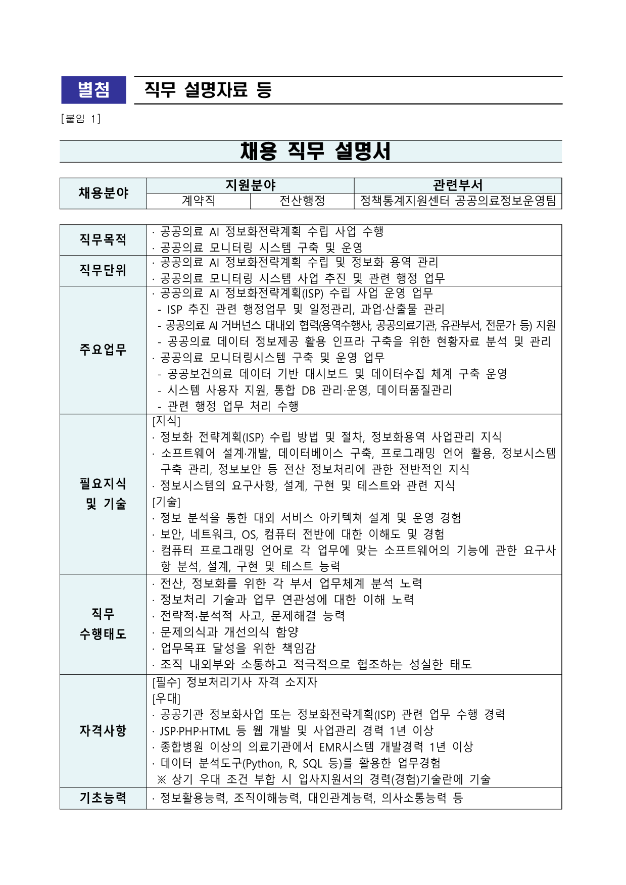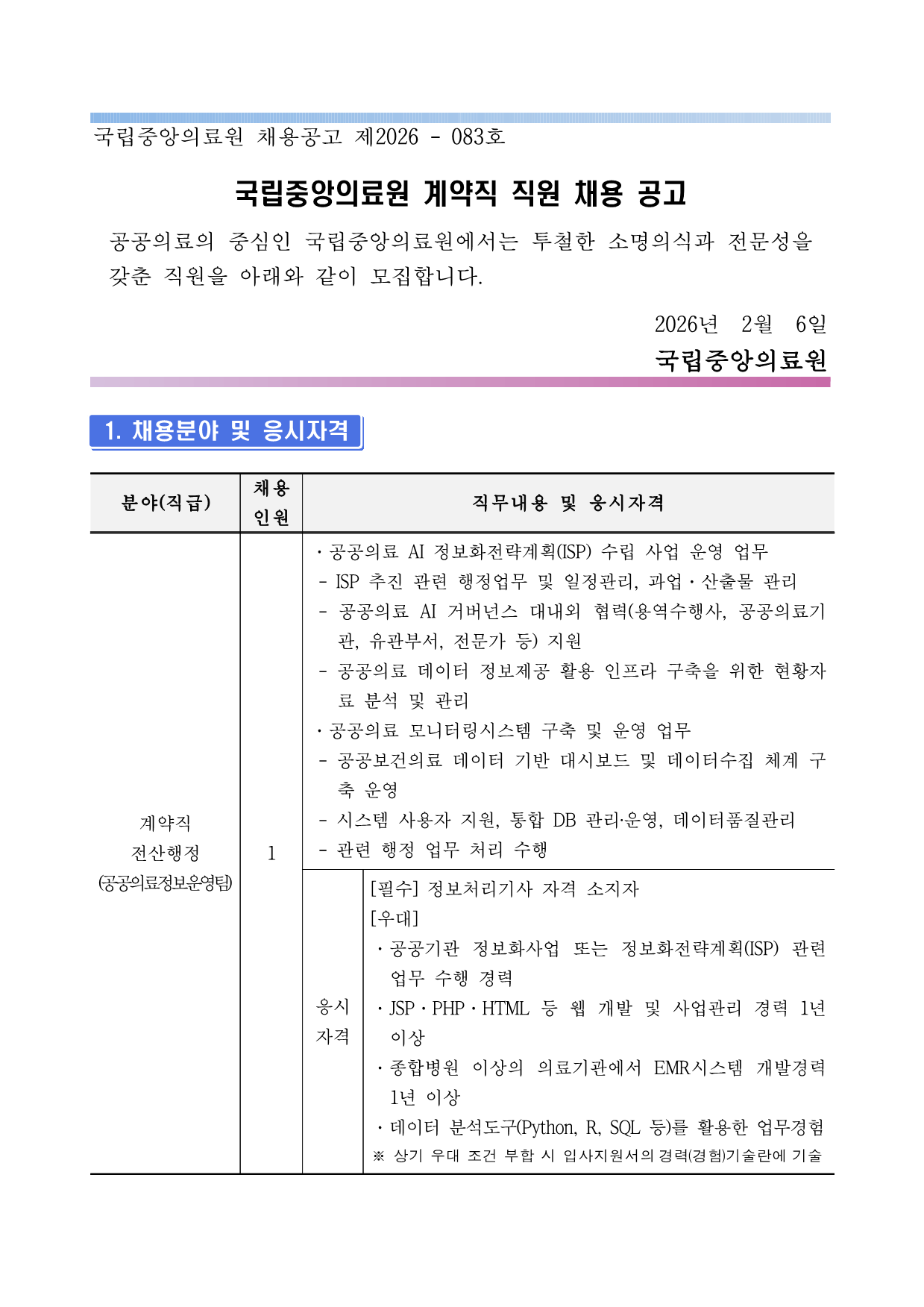 ±¹¸³Áß¾ÓÀÇ·á¿ø ä¿ë°ø°í Á¦2026 - 083È£ ±¹¸³Áß¾ÓÀÇ·á¿ø °è¾àÁ÷ Á÷¿ø ä¿ë °ø°í °ø°øÀÇ·áÀÇ Áß½ÉÀÎ ±¹¸³Áß¾ÓÀÇ·á¿ø¿¡¼´Â ÅõöÇÑ ¼Ò¸íÀǽİú Àü¹®¼ºÀ»°®Ãá Á÷¿øÀ» ¾Æ·¡¿Í °°ÀÌ ¸ðÁýÇÕ´Ï´Ù. 2026³â 2¿ù 6Àϱ¹¸³Áß¾ÓÀÇ·á¿ø1. ä¿ëºÐ¾ß ¹× ÀÀ½ÃÀÚ°Ý ºÐ¾ß(Á÷±Þ) ä¿ë Àοø Á÷¹«³»¿ë ¹× ÀÀ½ÃÀÚ°Ý °è¾àÁ÷ Àü»êÇàÁ¤ (°ø°øÀÇ·áÁ¤º¸¿î¿µÆÀ) 1 ¡¤°ø°øÀÇ·á AI Á¤º¸ÈÀü·«°èȹ(ISP) ¼ö¸³ »ç¾÷ ¿î¿µ ¾÷¹« - ISP ÃßÁø °ü·Ã ÇàÁ¤¾÷¹« ¹× ÀÏÁ¤°ü¸®, °ú¾÷¡¤»êÃâ¹° °ü¸® - °ø°øÀÇ·á AI °Å¹ö³Í½º ´ë³»¿Ü Çù·Â(¿ë¿ª¼öÇà»ç, °ø°øÀÇ·á±â°ü, À¯°üºÎ¼, Àü¹®°¡ µî) Áö¿ø - °ø°øÀÇ·á µ¥ÀÌÅÍ Á¤º¸Á¦°ø Ȱ¿ë ÀÎÇÁ¶ó ±¸ÃàÀ» À§ÇÑ ÇöȲÀÚ·á ºÐ¼® ¹× °ü¸® ¡¤°ø°øÀÇ·á ¸ð´ÏÅ͸µ½Ã½ºÅÛ ±¸Ãà ¹× ¿î¿µ ¾÷¹« - °ø°øº¸°ÇÀÇ·á µ¥ÀÌÅÍ ±â¹Ý ´ë½Ãº¸µå ¹× µ¥ÀÌÅͼöÁý ü°è ±¸Ãà ¿î¿µ - ½Ã½ºÅÛ »ç¿ëÀÚ Áö¿ø, ÅëÇÕ DB °ü¸®‧¿î¿µ, µ¥ÀÌÅÍǰÁú°ü¸® - °ü·Ã ÇàÁ¤ ¾÷¹« ó¸® ¼öÇà ÀÀ½Ã ÀÚ°Ý [Çʼö] Á¤º¸Ã³¸®±â»ç ÀÚ°Ý ¼ÒÁöÀÚ [¿ì´ë] ¡¤°ø°ø±â°ü Á¤º¸È»ç¾÷ ¶Ç´Â Á¤º¸ÈÀü·«°èȹ(ISP) °ü·Ã ¾÷¹« ¼öÇà °æ·Â ¡¤JSP¡¤PHP¡¤HTML µî À¥ °³¹ß ¹× »ç¾÷°ü¸® °æ·Â 1³â ÀÌ»ó ¡¤Á¾ÇÕº´¿ø ÀÌ»óÀÇ ÀÇ·á±â°ü¿¡¼ EMR½Ã½ºÅÛ °³¹ß°æ·Â 1³â ÀÌ»ó ¡¤µ¥ÀÌÅÍ ºÐ¼®µµ±¸(Python, R, SQL µî)¸¦ Ȱ¿ëÇÑ ¾÷¹«°æÇè¡Ø »ó±â ¿ì´ë Á¶°Ç ºÎÇÕ ½Ã ÀÔ»çÁö¿ø¼ÀÇ °æ·Â(°æÇè)±â¼ú¶õ¿¡ ±â¼ú