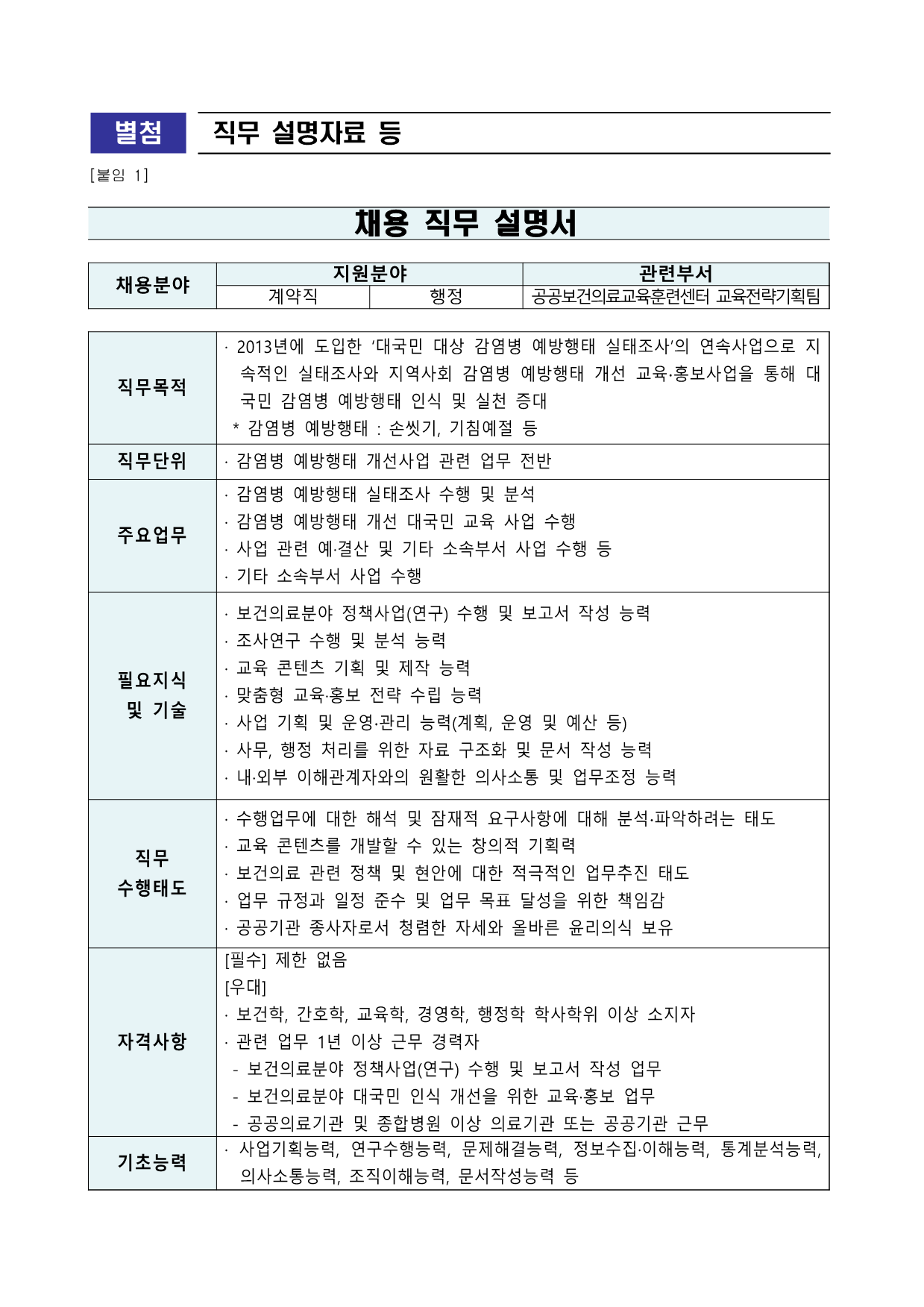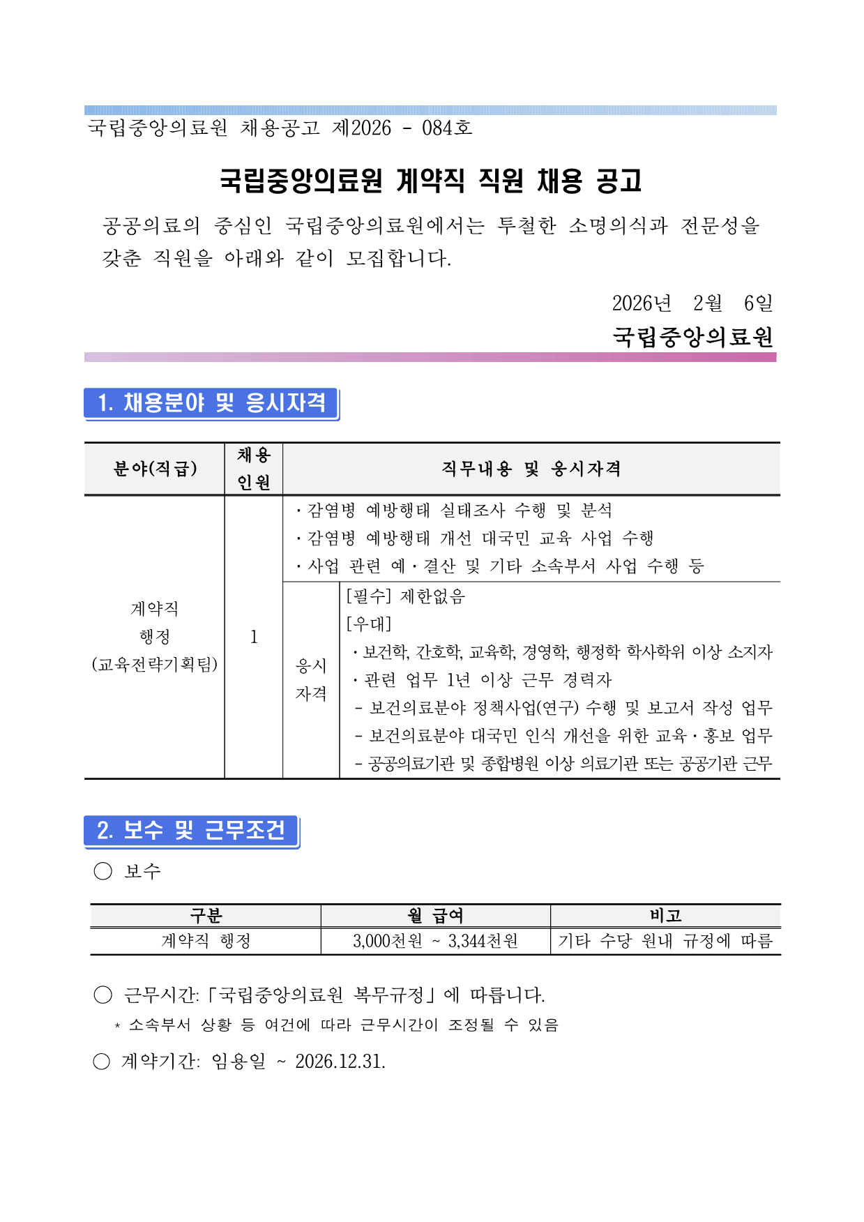 ±¹¸³Áß¾ÓÀÇ·á¿ø ä¿ë°ø°í Á¦2026 - 084È£ ±¹¸³Áß¾ÓÀÇ·á¿ø °è¾àÁ÷ Á÷¿ø ä¿ë °ø°í °ø°øÀÇ·áÀÇ Áß½ÉÀÎ ±¹¸³Áß¾ÓÀÇ·á¿ø¿¡¼´Â ÅõöÇÑ ¼Ò¸íÀǽİú Àü¹®¼ºÀ»°®Ãá Á÷¿øÀ» ¾Æ·¡¿Í °°ÀÌ ¸ðÁýÇÕ´Ï´Ù. 2026³â 2¿ù 6Àϱ¹¸³Áß¾ÓÀÇ·á¿ø1. ä¿ëºÐ¾ß ¹× ÀÀ½ÃÀÚ°Ý ºÐ¾ß(Á÷±Þ) ä¿ë Àοø Á÷¹«³»¿ë ¹× ÀÀ½ÃÀÚ°Ý °è¾àÁ÷ ÇàÁ¤ (±³À°Àü·«±âȹÆÀ) 1 ¡¤°¨¿°º´ ¿¹¹æÇàÅ ½ÇÅÂÁ¶»ç ¼öÇà ¹× ºÐ¼® ¡¤°¨¿°º´ ¿¹¹æÇàÅ °³¼± ´ë±¹¹Î ±³À° »ç¾÷ ¼öÇà ¡¤»ç¾÷ °ü·Ã ¿¹¡¤°á»ê ¹× ±âŸ ¼Ò¼ÓºÎ¼ »ç¾÷ ¼öÇà µî ÀÀ½Ã ÀÚ°Ý [Çʼö] Á¦ÇѾøÀ½ [¿ì´ë] ¡¤º¸°ÇÇÐ, °£È£ÇÐ, ±³À°ÇÐ, °æ¿µÇÐ, ÇàÁ¤ÇÐ ÇлçÇÐÀ§ ÀÌ»ó ¼ÒÁöÀÚ ¡¤°ü·Ã ¾÷¹« 1³â ÀÌ»ó ±Ù¹« °æ·ÂÀÚ - º¸°ÇÀÇ·áºÐ¾ß Á¤Ã¥»ç¾÷(¿¬±¸) ¼öÇà ¹× º¸°í¼ ÀÛ¼º ¾÷¹«- º¸°ÇÀÇ·áºÐ¾ß ´ë±¹¹Î ÀÎ½Ä °³¼±À» À§ÇÑ ±³À°¡¤È«º¸ ¾÷¹«- °ø°øÀÇ·á±â°ü ¹× Á¾ÇÕº´¿ø ÀÌ»ó ÀÇ·á±â°ü ¶Ç´Â °ø°ø±â°ü ±Ù¹«2. º¸¼ö ¹× ±Ù¹«Á¶°Ç ¡Û º¸¼ö ±¸ºÐ ¿ù ±Þ¿© ºñ°í °è¾àÁ÷ ÇàÁ¤ 3,000õ¿ø ~ 3,344õ¿ø ±âŸ ¼ö´ç ¿ø³» ±ÔÁ¤¿¡ µû¸§¡Û ±Ù¹«½Ã°£:¡¸±¹¸³Áß¾ÓÀÇ·á¿ø º¹¹«±ÔÁ¤¡¹¿¡ µû¸¨´Ï´Ù. * ¼Ò¼ÓºÎ¼ »óȲ µî ¿©°Ç¿¡ µû¶ó ±Ù¹«½Ã°£ÀÌ Á¶Á¤µÉ ¼ö ÀÖÀ½ ¡Û °è¾à±â°£: ÀÓ¿ëÀÏ ~ 2026.12.31.