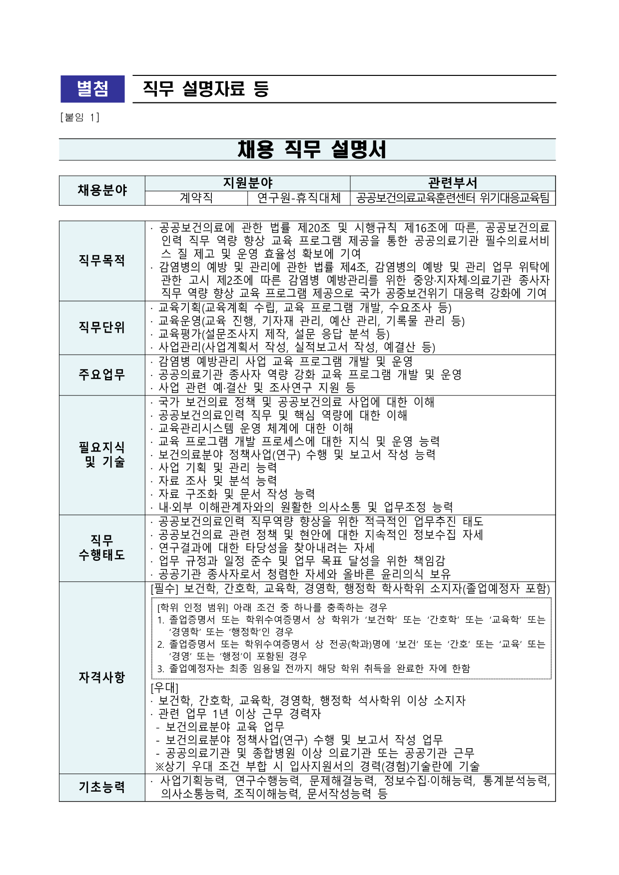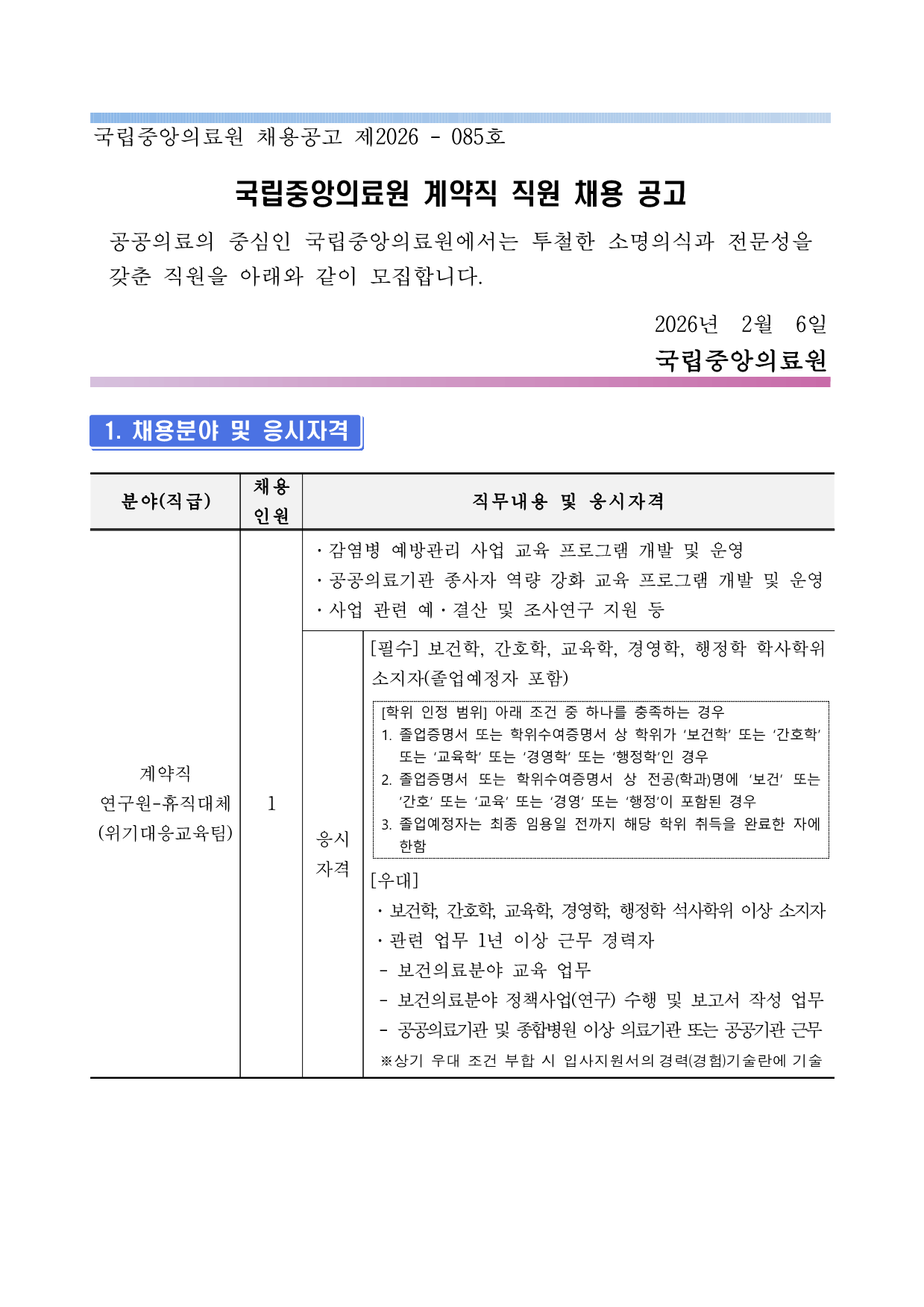 ±¹¸³Áß¾ÓÀÇ·á¿ø ä¿ë°ø°í Á¦2026 - 085È£ ±¹¸³Áß¾ÓÀÇ·á¿ø °è¾àÁ÷ Á÷¿ø ä¿ë °ø°í °ø°øÀÇ·áÀÇ Áß½ÉÀÎ ±¹¸³Áß¾ÓÀÇ·á¿ø¿¡¼´Â ÅõöÇÑ ¼Ò¸íÀǽİú Àü¹®¼ºÀ»°®Ãá Á÷¿øÀ» ¾Æ·¡¿Í °°ÀÌ ¸ðÁýÇÕ´Ï´Ù. 2026³â 2¿ù 6Àϱ¹¸³Áß¾ÓÀÇ·á¿ø1. ä¿ëºÐ¾ß ¹× ÀÀ½ÃÀÚ°Ý ºÐ¾ß(Á÷±Þ) ä¿ë Àοø Á÷¹«³»¿ë ¹× ÀÀ½ÃÀÚ°Ý °è¾àÁ÷ ¿¬±¸¿ø-ÈÞÁ÷´ëü (À§±â´ëÀÀ±³À°ÆÀ) 1 ¡¤°¨¿°º´ ¿¹¹æ°ü¸® »ç¾÷ ±³À° ÇÁ·Î±×·¥ °³¹ß ¹× ¿î¿µ ¡¤°ø°øÀÇ·á±â°ü Á¾»çÀÚ ¿ª·® °È ±³À° ÇÁ·Î±×·¥ °³¹ß ¹× ¿î¿µ¡¤»ç¾÷ °ü·Ã ¿¹¡¤°á»ê ¹× Á¶»ç¿¬±¸ Áö¿ø µî ÀÀ½Ã ÀÚ°Ý [Çʼö] º¸°ÇÇÐ, °£È£ÇÐ, ±³À°ÇÐ, °æ¿µÇÐ, ÇàÁ¤ÇÐ ÇлçÇÐÀ§ ¼ÒÁöÀÚ(Á¹¾÷¿¹Á¤ÀÚ Æ÷ÇÔ) [ÇÐÀ§ ÀÎÁ¤ ¹üÀ§] ¾Æ·¡ Á¶°Ç Áß Çϳª¸¦ ÃæÁ·ÇÏ´Â °æ¿ì 1. Á¹¾÷Áõ¸í¼ ¶Ç´Â ÇÐÀ§¼ö¿©Áõ¸í¼ »ó ÇÐÀ§°¡ ¡®º¸°ÇÇС¯ ¶Ç´Â ¡®°£È£ÇС¯ ¶Ç´Â ¡®±³À°ÇС¯ ¶Ç´Â ¡®°æ¿µÇС¯ ¶Ç´Â ¡®ÇàÁ¤ÇС¯ÀÎ °æ¿ì 2. Á¹¾÷Áõ¸í¼ ¶Ç´Â ÇÐÀ§¼ö¿©Áõ¸í¼ »ó Àü°ø(Çаú)¸í¿¡ ¡®º¸°Ç¡¯ ¶Ç´Â ¡®°£È£¡¯ ¶Ç´Â ¡®±³À°¡¯ ¶Ç´Â ¡®°æ¿µ¡¯ ¶Ç´Â ¡®ÇàÁ¤¡¯ÀÌ Æ÷ÇÔµÈ °æ¿ì 3. Á¹¾÷¿¹Á¤ÀÚ´Â ÃÖÁ¾ ÀÓ¿ëÀÏ Àü±îÁö ÇØ´ç ÇÐÀ§ ÃëµæÀ» ¿Ï·áÇÑ ÀÚ¿¡ ÇÑÇÔ [¿ì´ë] ¡¤º¸°ÇÇÐ, °£È£ÇÐ, ±³À°ÇÐ, °æ¿µÇÐ, ÇàÁ¤ÇÐ ¼®»çÇÐÀ§ ÀÌ»ó ¼ÒÁöÀÚ¡¤°ü·Ã ¾÷¹« 1³â ÀÌ»ó ±Ù¹« °æ·ÂÀÚ - º¸°ÇÀÇ·áºÐ¾ß ±³À° ¾÷¹« - º¸°ÇÀÇ·áºÐ¾ß Á¤Ã¥»ç¾÷(¿¬±¸) ¼öÇà ¹× º¸°í¼ ÀÛ¼º ¾÷¹«- °ø°øÀÇ·á±â°ü ¹× Á¾ÇÕº´¿ø ÀÌ»ó ÀÇ·á±â°ü ¶Ç´Â °ø°ø±â°ü ±Ù¹« ¡Ø»ó±â ¿ì´ë Á¶°Ç ºÎÇÕ ½Ã ÀÔ»çÁö¿ø¼ÀÇ °æ·Â(°æÇè)±â¼ú¶õ¿¡ ±â¼ú