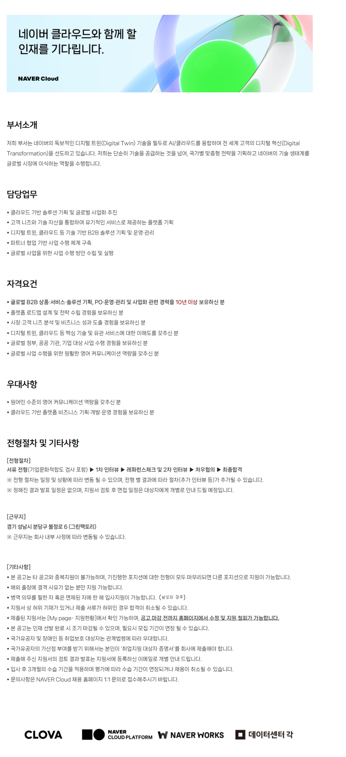 ºÎ¼­¼Ò°³ ÀúÈñ ºÎ¼­´Â ³×À̹öÀÇ µ¶º¸ÀûÀÎ µðÁöÅÐ Æ®À©(Digital Twin) ±â¼úÀ» ÇʵηΠAI/Ŭ¶ó¿ìµå¸¦ À¶ÇÕÇÏ¿© Àü ¼¼°è °í°´ÀÇ µðÁöÅÐ Çõ½Å(Digital Transformation)À» ¼±µµÇϰí ÀÖ½À´Ï´Ù. ÀúÈñ´Â ´Ü¼øÈ÷ ±â¼úÀ» °ø±ÞÇÏ´Â °ÍÀ» ³Ñ¾î, ±¹°¡º° ¸ÂÃãÇü Àü·«À» ±âȹÇÏ°í ³×À̹öÀÇ ±â¼ú »ýŰ踦 ±Û·Î¹ú ½ÃÀå¿¡ À̽ÄÇÏ´Â ¿ªÇÒÀ» ¼öÇàÇÕ´Ï´Ù. ´ã´ç¾÷¹« • Ŭ¶ó¿ìµå ±â¹Ý ¼Ö·ç¼Ç ±âȹ ¹× ±Û·Î¹ú »ç¾÷È­ ÃßÁø • °í°´ ´ÏÁî¿Í ±â¼ú ÀÚ»êÀ» ÅëÇÕÇÏ¿© À¯±âÀûÀÎ ¼­ºñ½º·Î Á¦°øÇÏ´Â Ç÷§Æû ±âȹ • µðÁöÅÐ Æ®À©, Ŭ¶ó¿ìµå µî ±â¼ú ±â¹Ý B2B ¼Ö·ç¼Ç ±âȹ ¹× ¿î¿µ¡¤°ü¸® • ÆÄÆ®³Ê Çù¾÷ ±â¹Ý »ç¾÷ ¼öÇà ü°è ±¸Ãà • ±Û·Î¹ú »ç¾÷À» À§ÇÑ »ç¾÷ ¼öÇà ¹æ¾È ¼ö¸³ ¹× ½ÇÇà ÀÚ°Ý¿ä°Ç • ±Û·Î¹ú B2B »óǰ¡¤¼­ºñ½º¡¤¼Ö·ç¼Ç ±âȹ, PO¡¤¿î¿µ¡¤°ü¸® ¹× »ç¾÷È­ °ü·Ã °æ·ÂÀ» 10³â ÀÌ»ó º¸À¯ÇϽŠºÐ • Ç÷§Æû ·Îµå¸Ê ¼³°è ¹× Àü·« ¼ö¸³ °æÇèÀ» º¸À¯ÇϽŠºÐ • ½ÃÀ塤°í°´ ´ÏÁî ºÐ¼® ¹× ºñÁî´Ï½º ¼º°ú µµÃâ °æÇèÀ» º¸À¯ÇϽŠºÐ • µðÁöÅÐ Æ®À©, Ŭ¶ó¿ìµå µî ÇÙ½É ±â¼ú ¹× À¯°ü ¼­ºñ½º¿¡ ´ëÇÑ ÀÌÇØµµ¸¦ °®Ã߽ŠºÐ • ±Û·Î¹ú Á¤ºÎ, °ø°ø ±â°ü, ±â¾÷ ´ë»ó »ç¾÷ ¼öÇà °æÇèÀ» º¸À¯ÇϽŠºÐ • ±Û·Î¹ú »ç¾÷ ¼öÇàÀ» À§ÇÑ ¿øÈ°ÇÑ ¿µ¾î Ä¿¹Â´ÏÄÉÀÌ¼Ç ¿ª·®À» °®Ã߽ŠºÐ