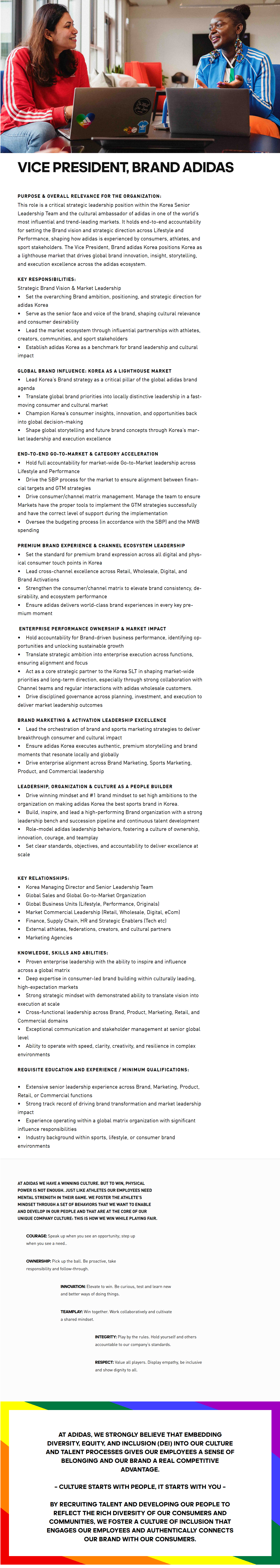 This role is a critical strategic leadership position within the Korea Senior Leadership Team and the cultural ambassador of adidas in one of the world¡¯s most influential and trend-leading markets. It holds end-to-end accountability for setting the Brand vision and strategic direction across Lifestyle and Performance, shaping how adidas is experienced by consumers, athletes, and sport stakeholders. The Vice President, Brand adidas Korea positions Korea as a lighthouse market that drives global brand innovation, insight, storytelling, and execution excellence across the adidas ecosystem.