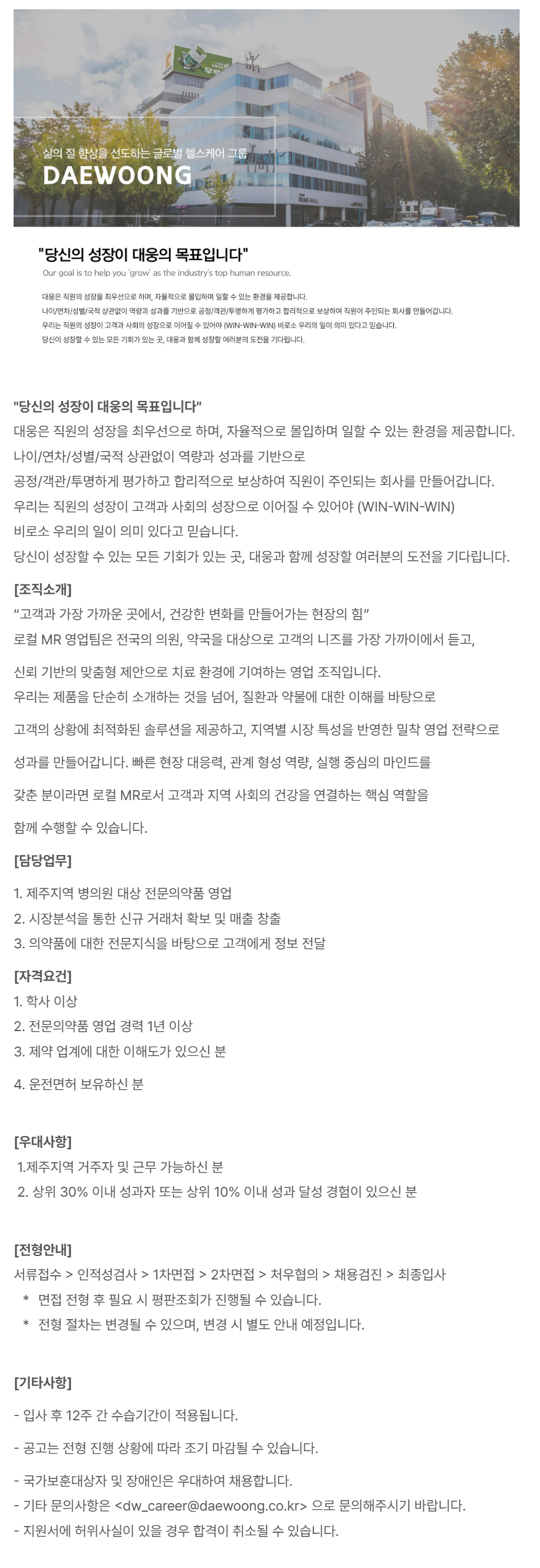 - ±âŸ ¹®ÀÇ»çÇ×Àº <dw_career@daewoong.co.kr******@*******.***> À¸·Î ¹®ÀÇÇØÁֽñ⠹ٶø´Ï´Ù.