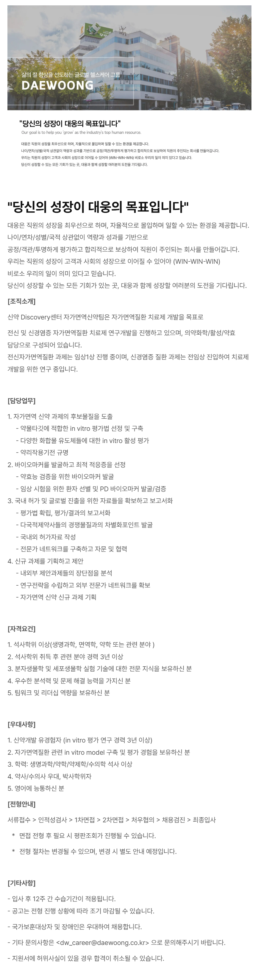 - ±âŸ ¹®ÀÇ»çÇ×Àº <dw_career@daewoong.co.kr******@*******.***> À¸·Î ¹®ÀÇÇØÁֽñ⠹ٶø´Ï´Ù.