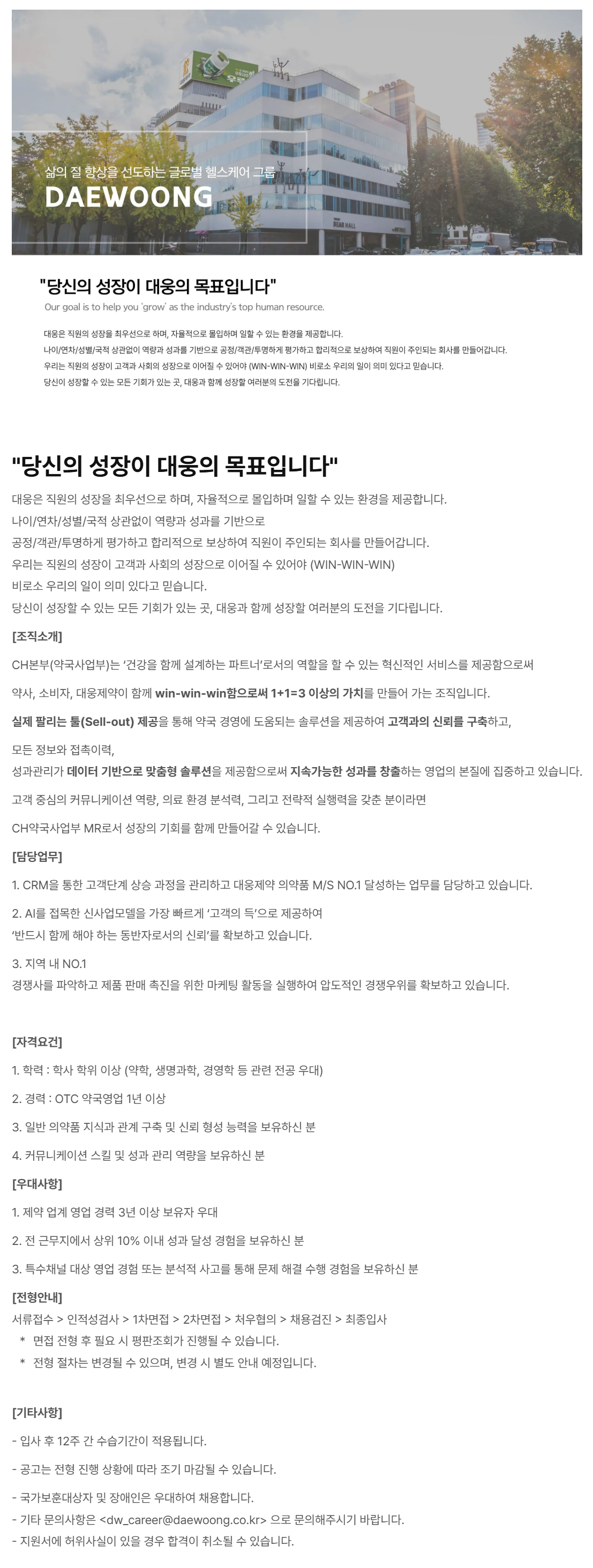 - ±âŸ ¹®ÀÇ»çÇ×Àº <dw_career@daewoong.co.kr******@*******.***> À¸·Î ¹®ÀÇÇØÁֽñ⠹ٶø´Ï´Ù.