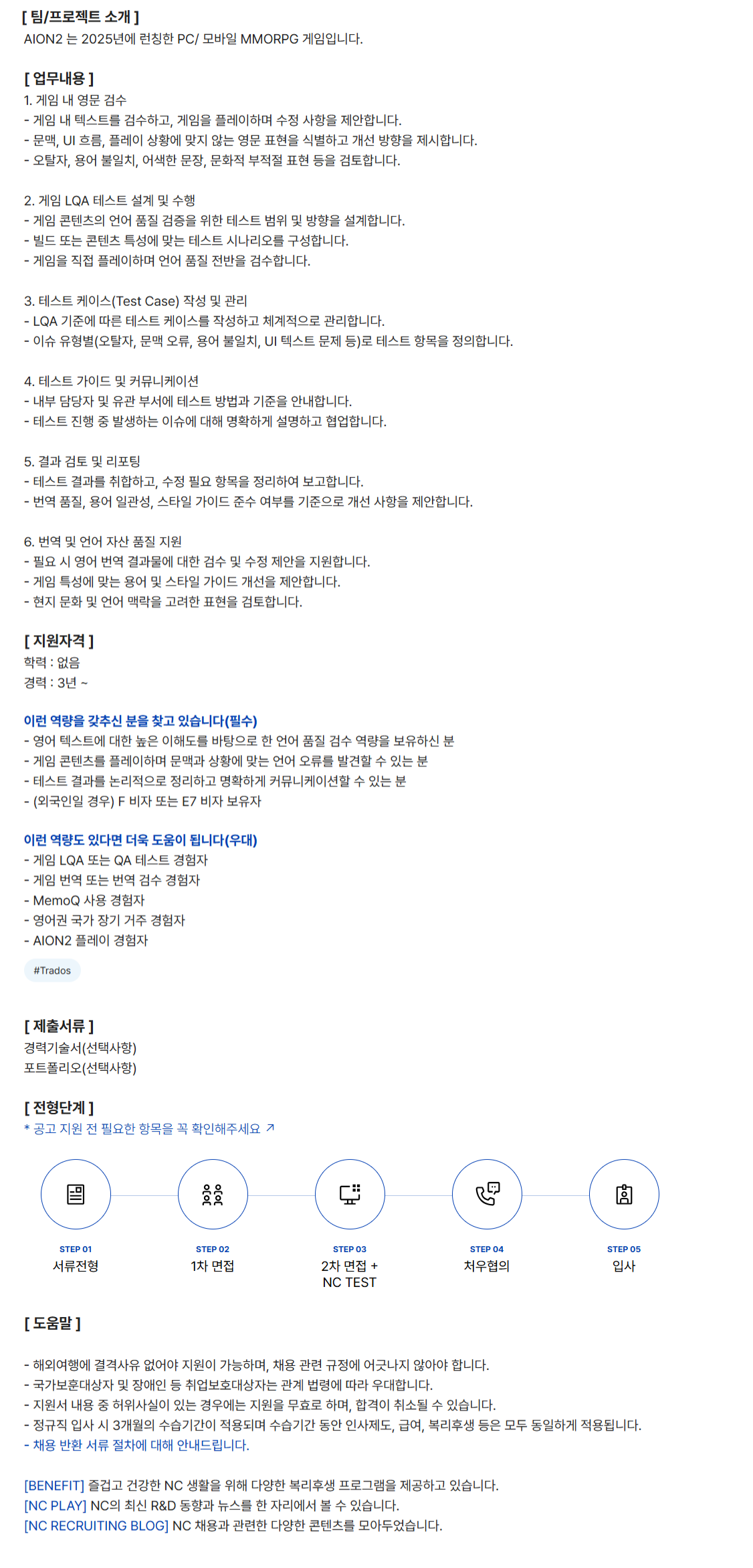 [°è¾àÁ÷][AION2] °ÔÀÓ ÇöÁöÈ ¹ø¿ª °Ë¼ö (LQA) ´ã´çÀÚ ¸ðÁý (¿µ¾î)