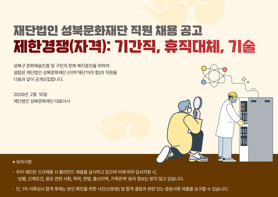 | ¼·ù½É»ç(1Â÷) ¹ßÇ¥ | 2026.3.3. 18:00 ÀÌÈÄ | Àç´Ü ȨÆäÀÌÁö (http://www.sbculture.or.kr) | 1ÀÏ |