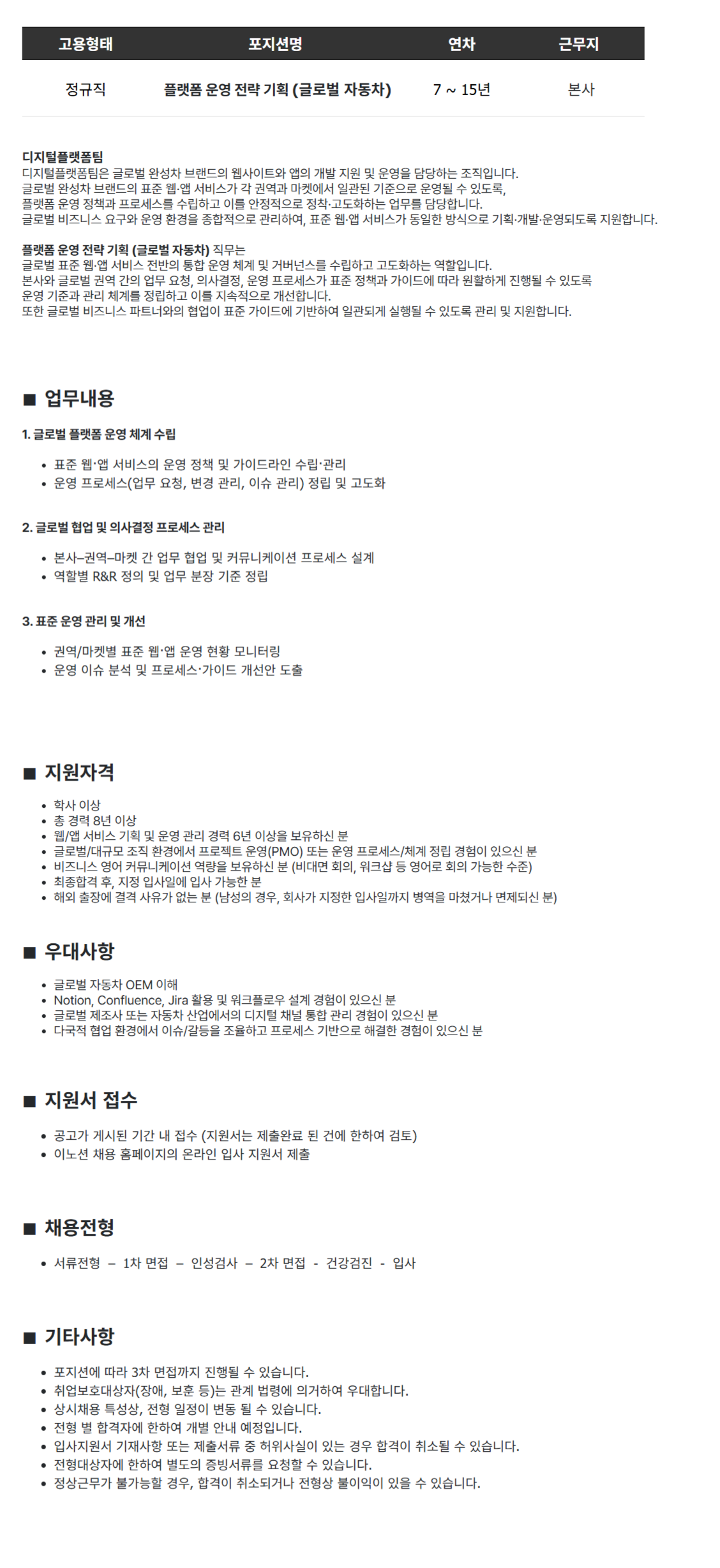 °í¿ëÇüÅ Æ÷Áö¼Ç¸í ¿¬Â÷ ±Ù¹«Áö Á¤±ÔÁ÷ Ç÷§Æû ¿î¿µ Àü·« ±âȹ (±Û·Î¹ú ÀÚµ¿Â÷) 7 ~ 15³â º»»ç
