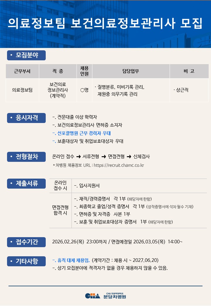 [ºÐ´çÂ÷º´¿ø] ÀÇ·áÁ¤º¸ÆÀ º¸°ÇÀÇ·áÁ¤º¸°ü¸®»ç ¸ðÁý
