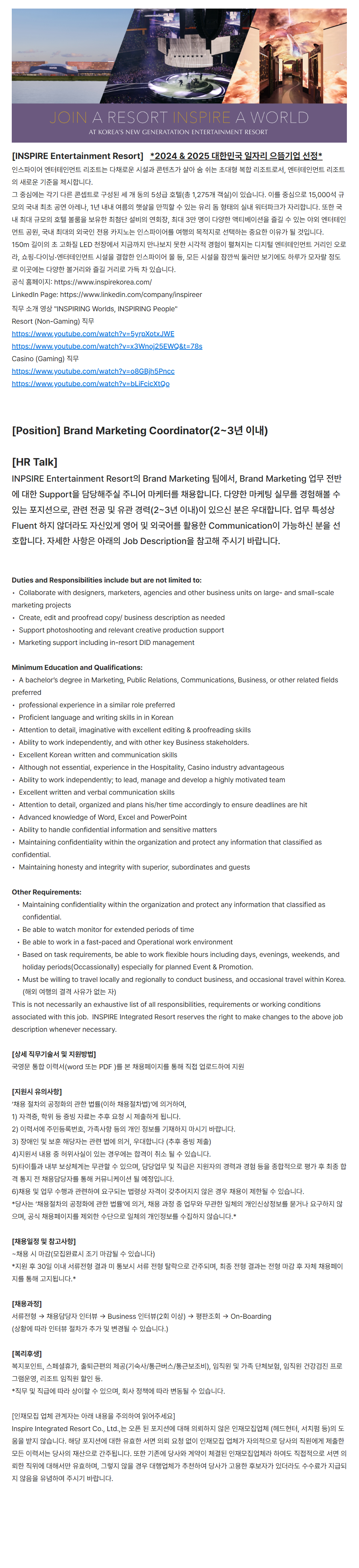 This is not necessarily an exhaustive list of all responsibilities, requirements or working conditions associated with this job. INSPIRE Integrated Resort reserves the right to make changes to the above job description whenever necessary.