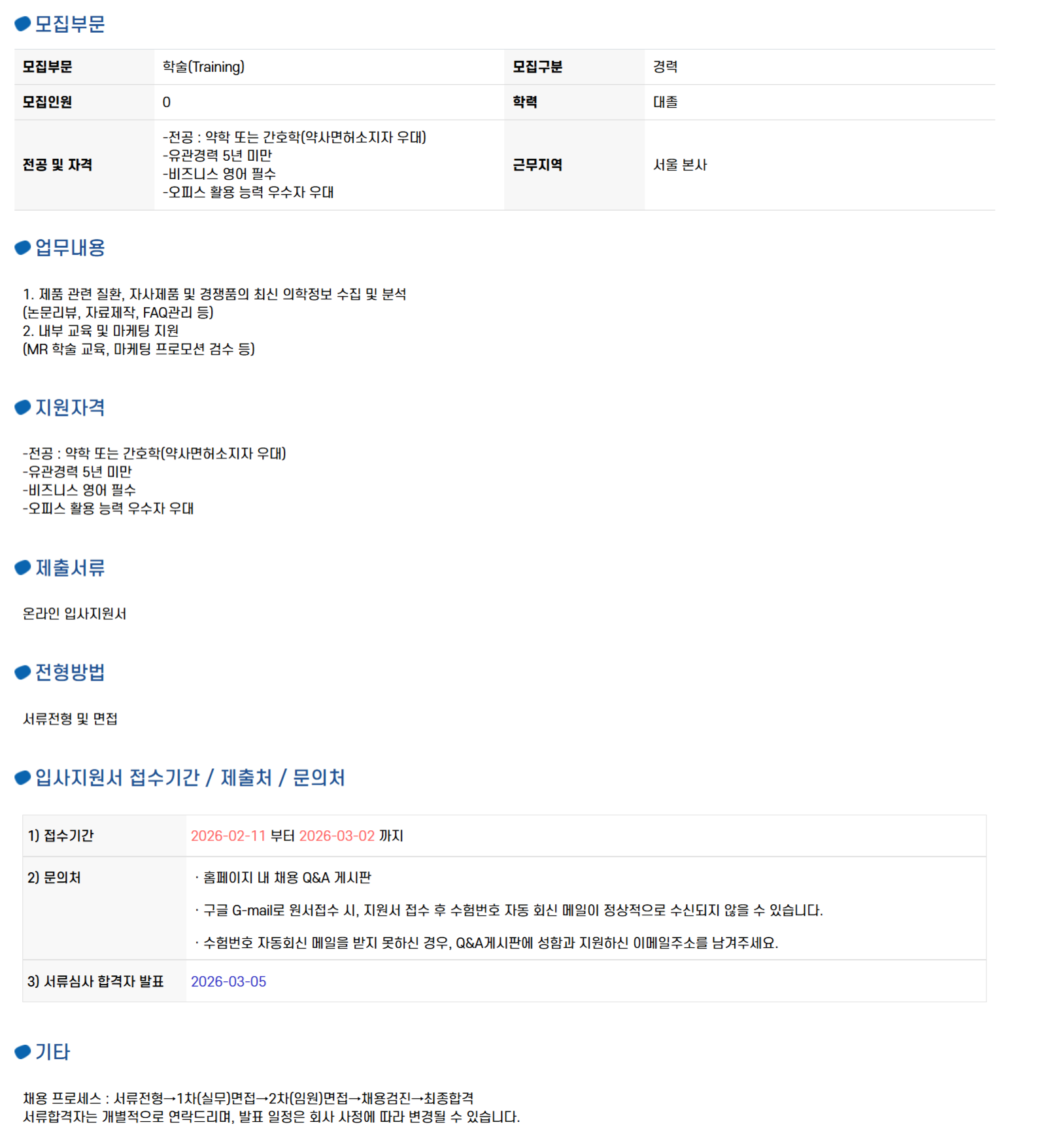 Áö¿øÀÚ°Ý -Àü°ø : ¾àÇÐ ¶Ç´Â °£È£ÇÐ(¾à»ç¸éÇã¼ÒÁöÀÚ ¿ì´ë) -À¯°ü°æ·Â 5³â ¹Ì¸¸ -ºñÁî´Ï½º ¿µ¾î Çʼö -¿ÀÇǽº Ȱ¿ë ´É·Â ¿ì¼öÀÚ ¿ì´ë