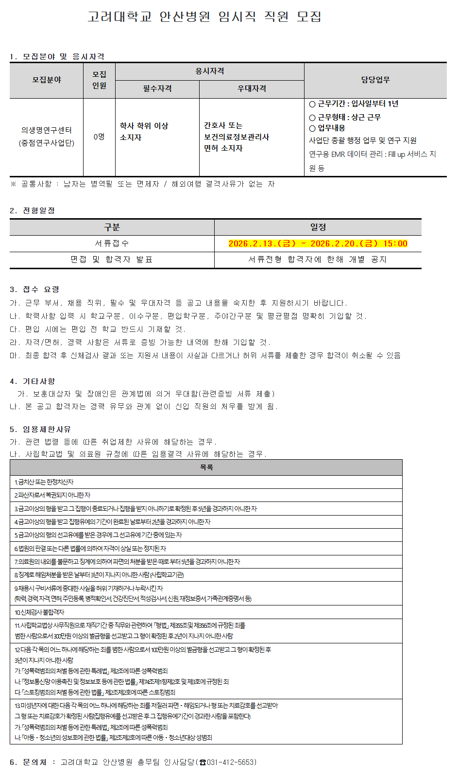 °í·Á´ëÇб³ ¾È»êº´¿ø ÀÓ½ÃÁ÷ Á÷¿ø ¸ðÁý