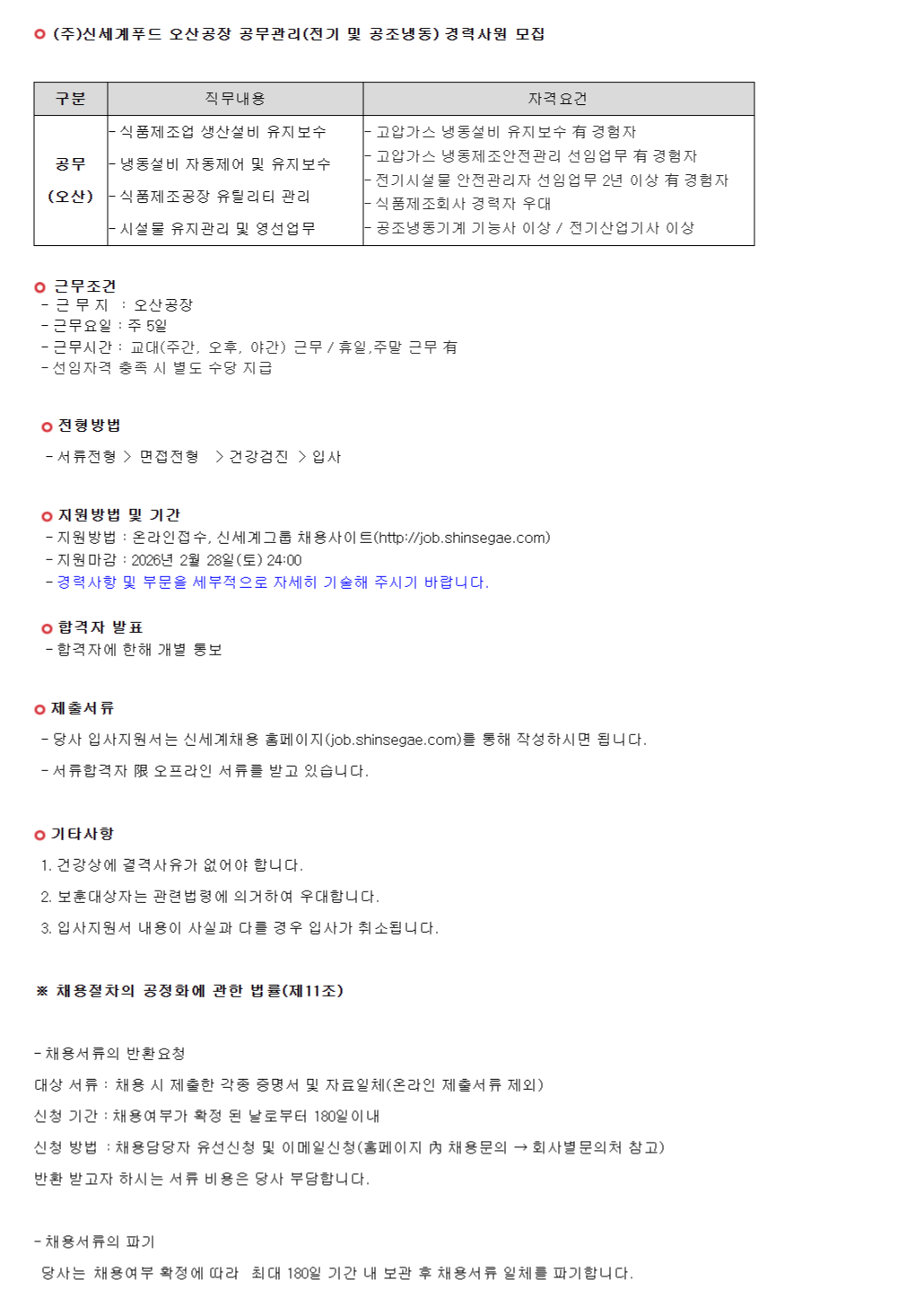 (ÁÖ)½Å¼¼°èǪµå ¿À»ê°øÀå °ø¹«°ü¸®(Àü±â ¹× °øÁ¶³Ãµ¿) °æ·Â»ç¿ø ¸ðÁý